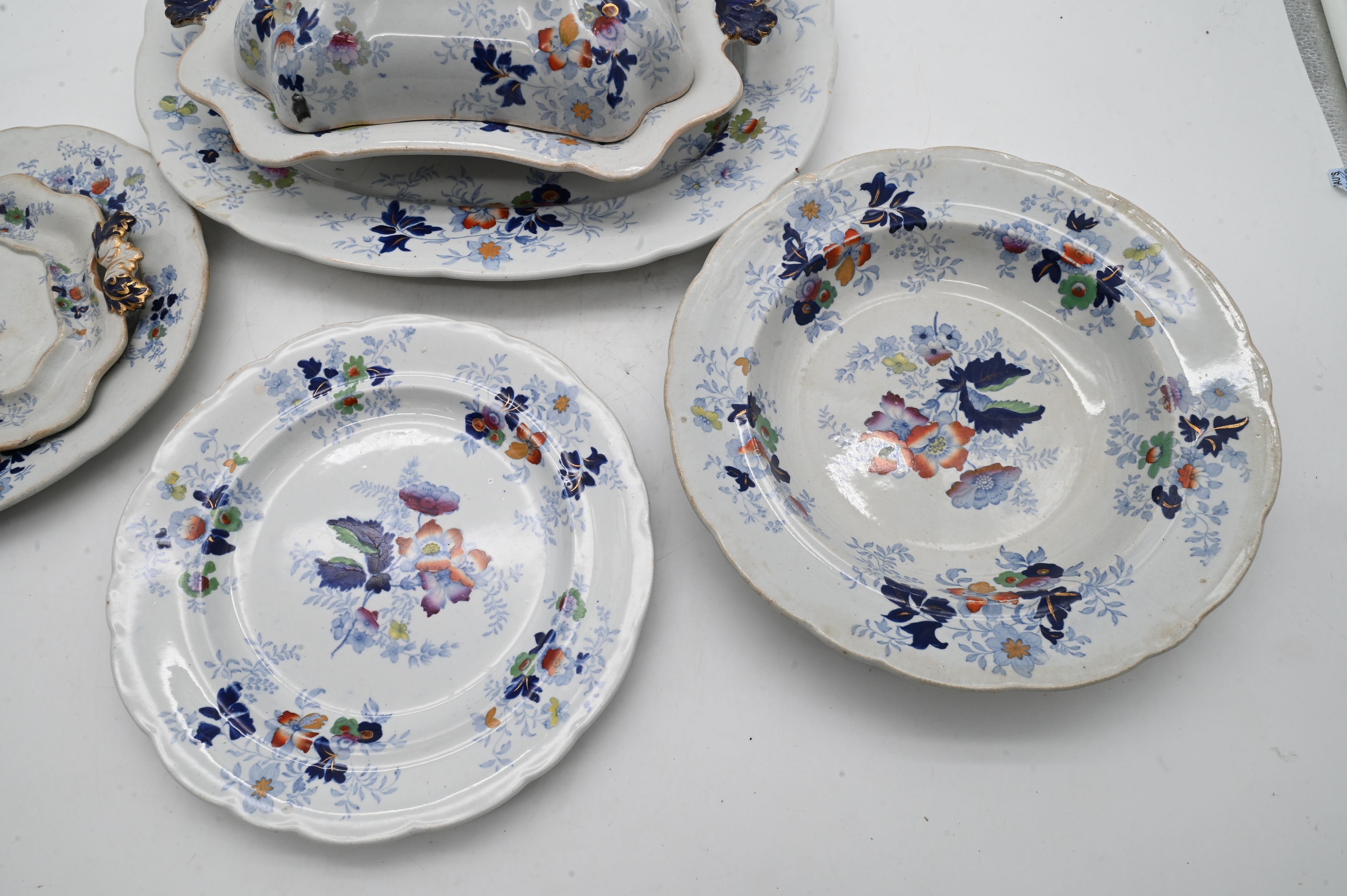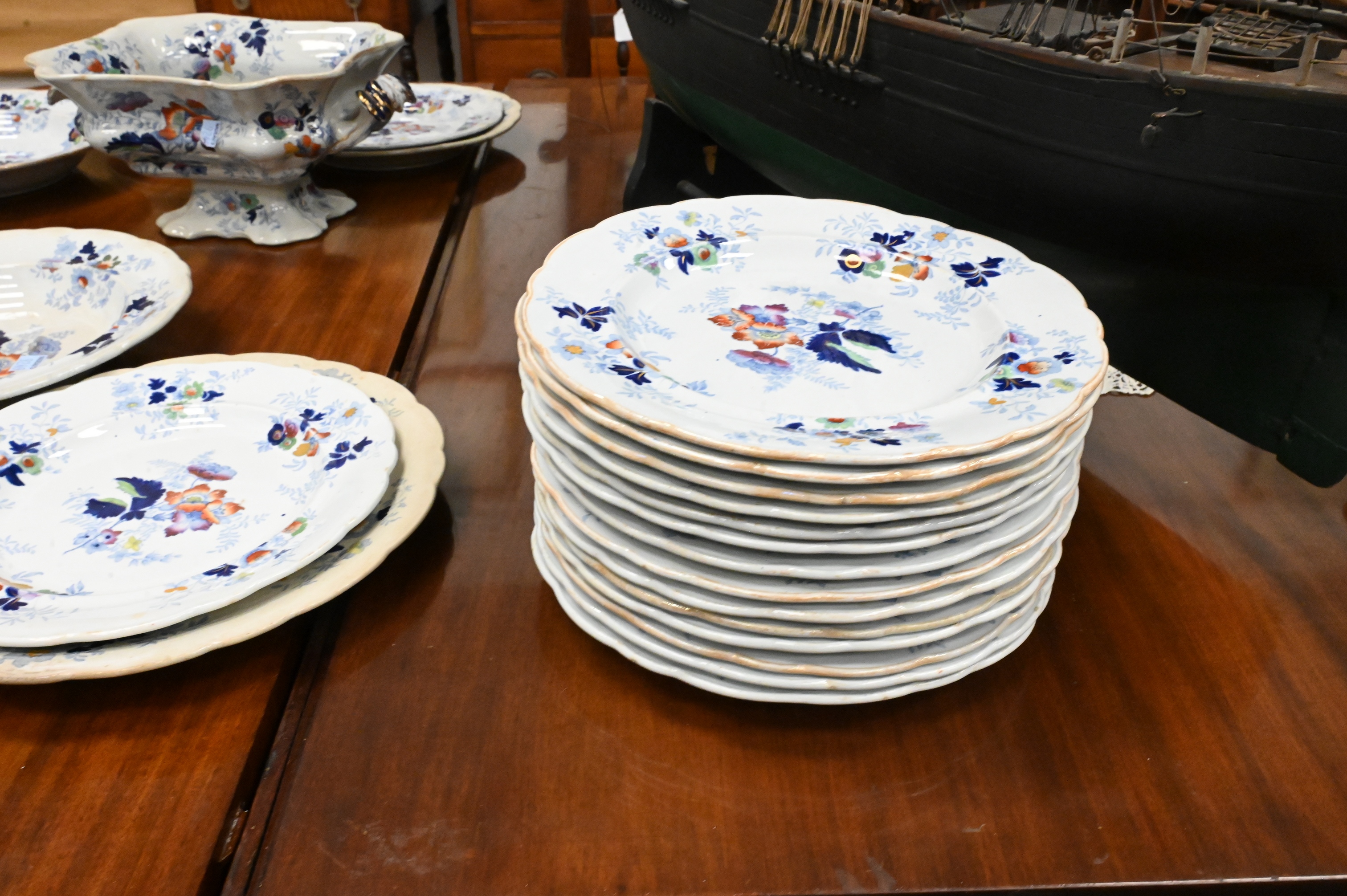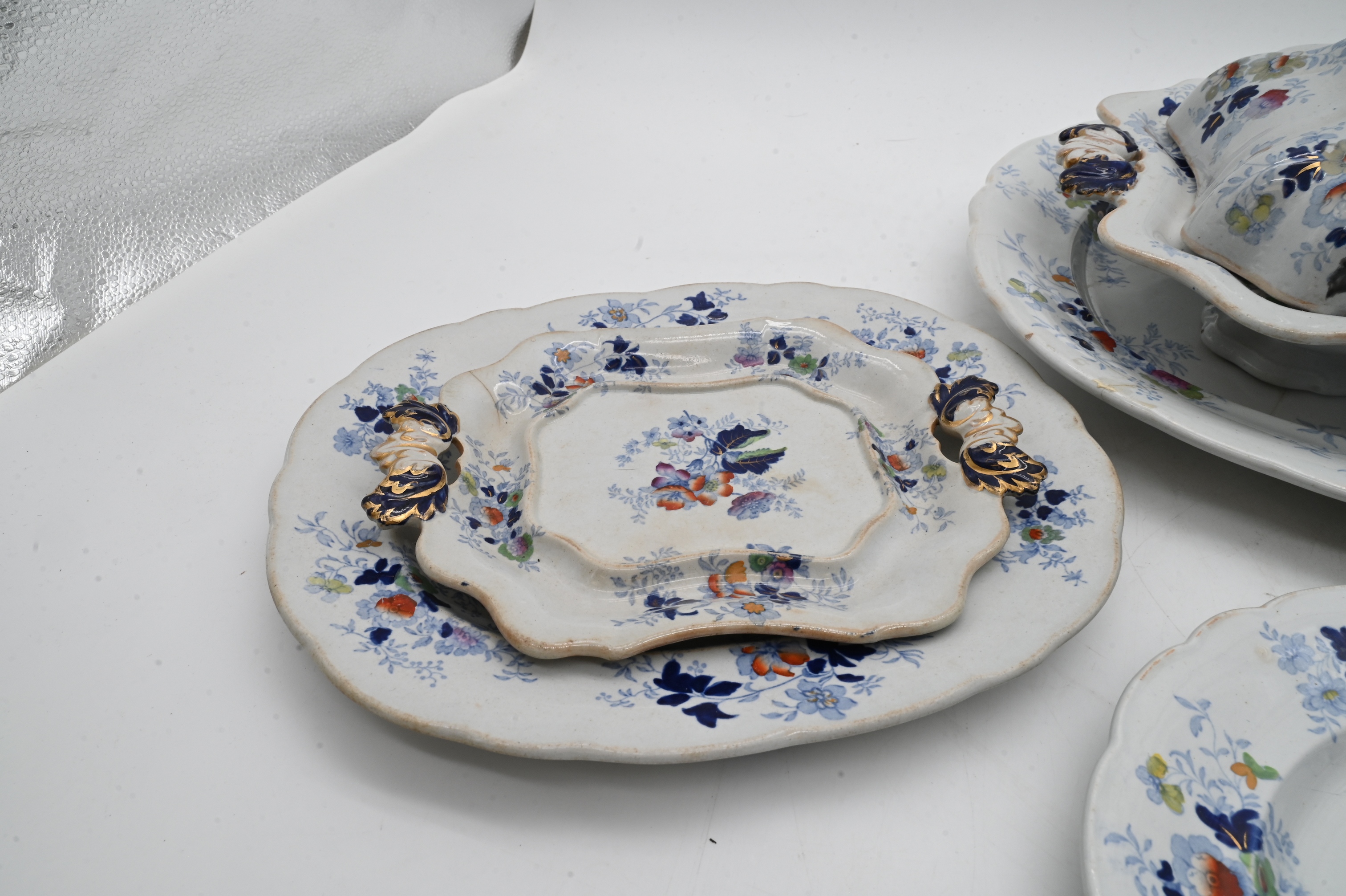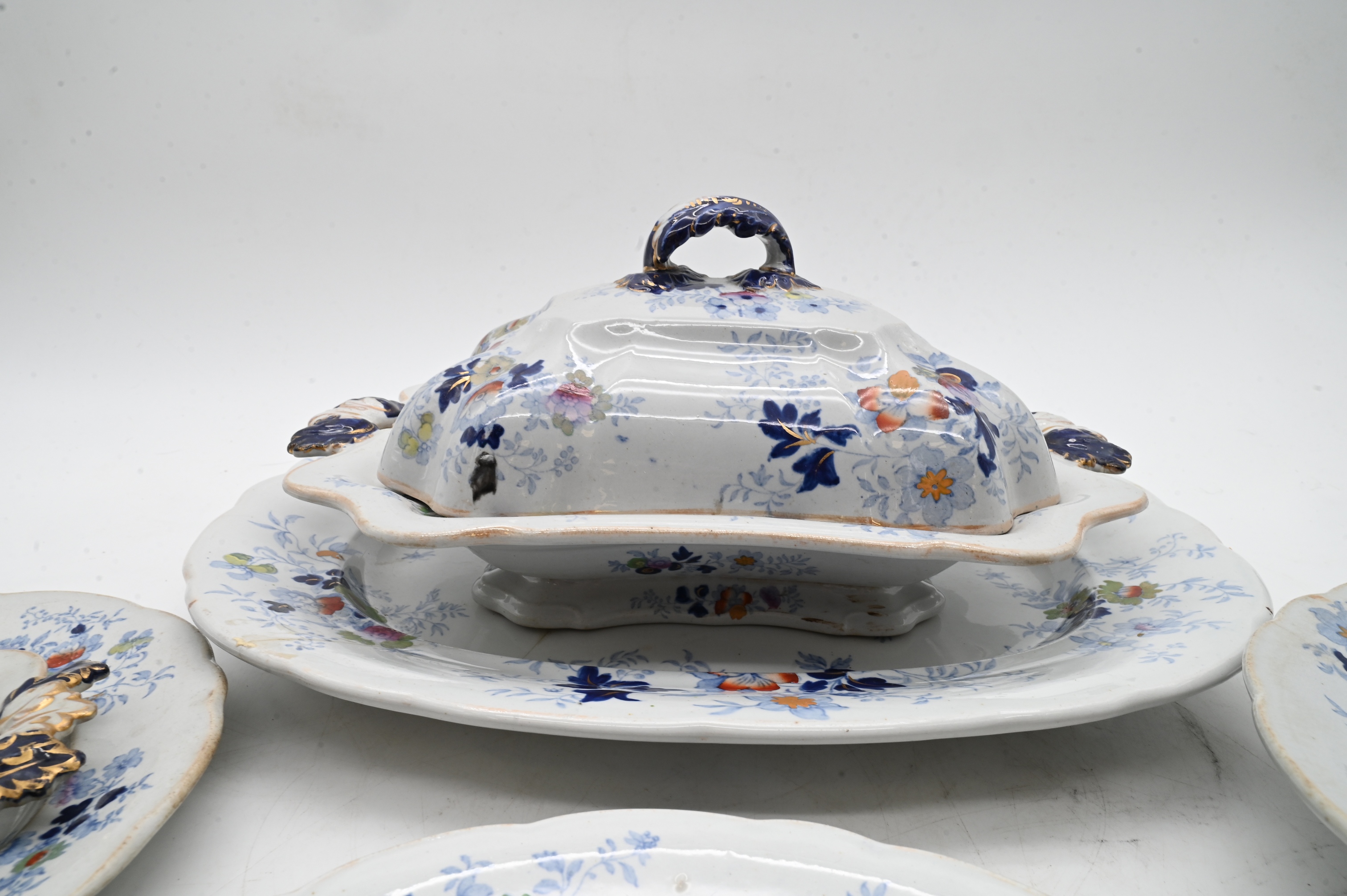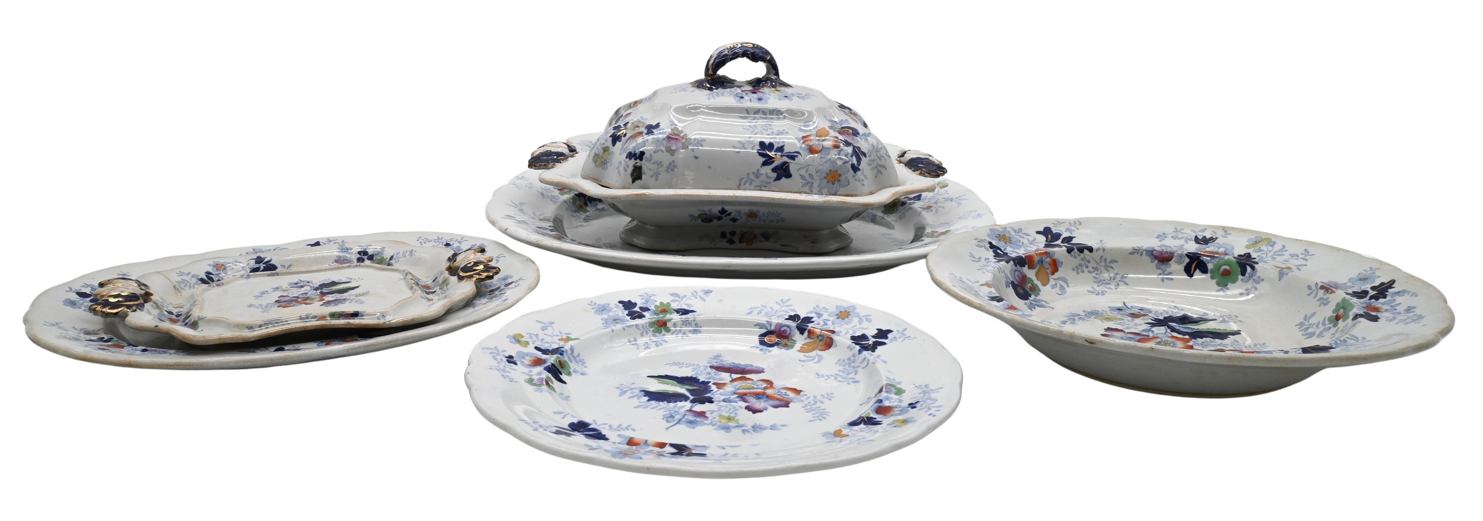 Including a 6 dinner plates, 19 luncheons plates, 16 soups, 4 covered and open compotes along with 7 additional serving pieces each decorated with scattered polychrome floral sprays in the Imari palette of iron red and cobalt blue with gilt highlights. Undersides with blue printed crown and banner marks reading “Real Stone China.” England, mid-19th century.