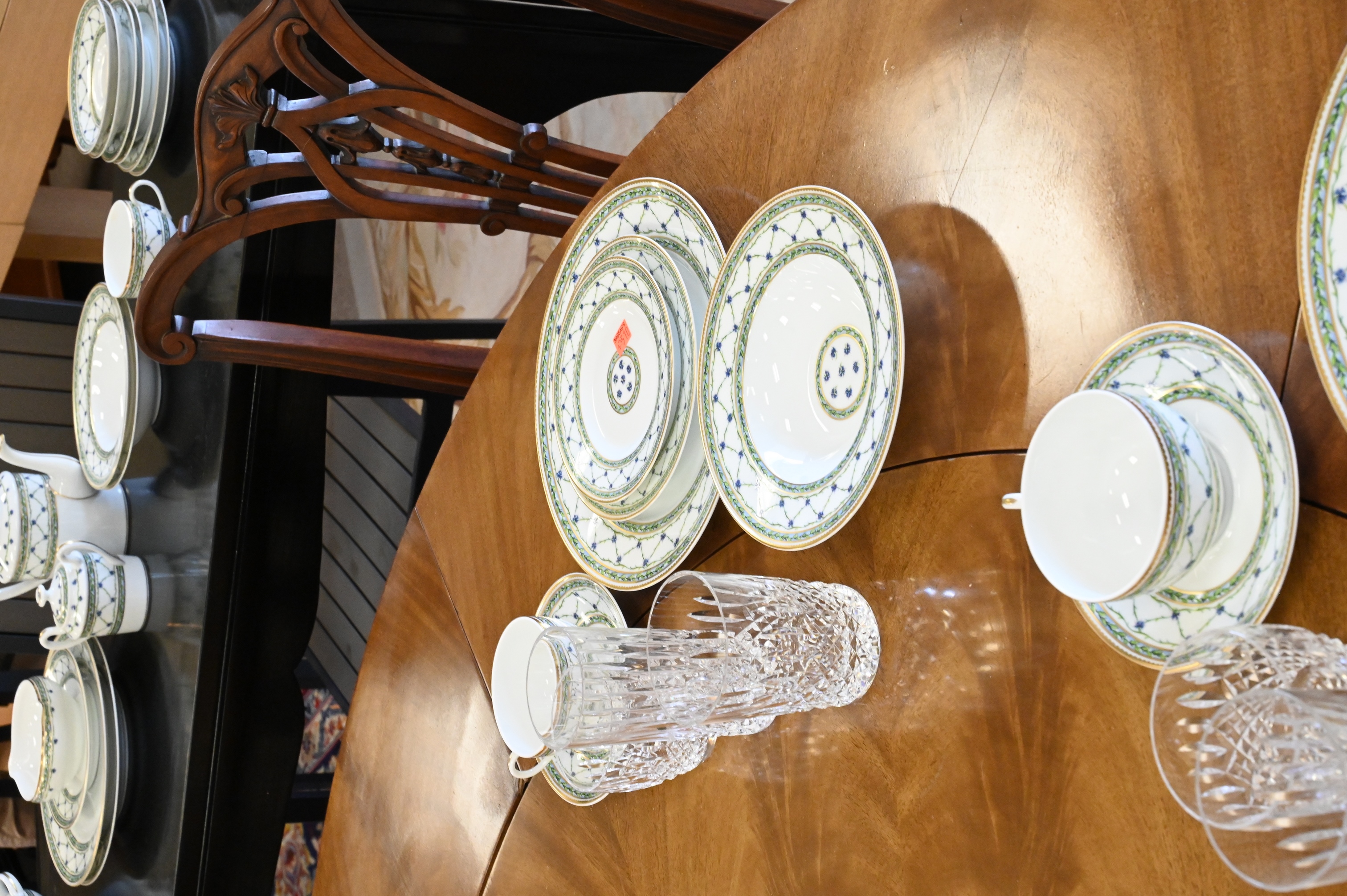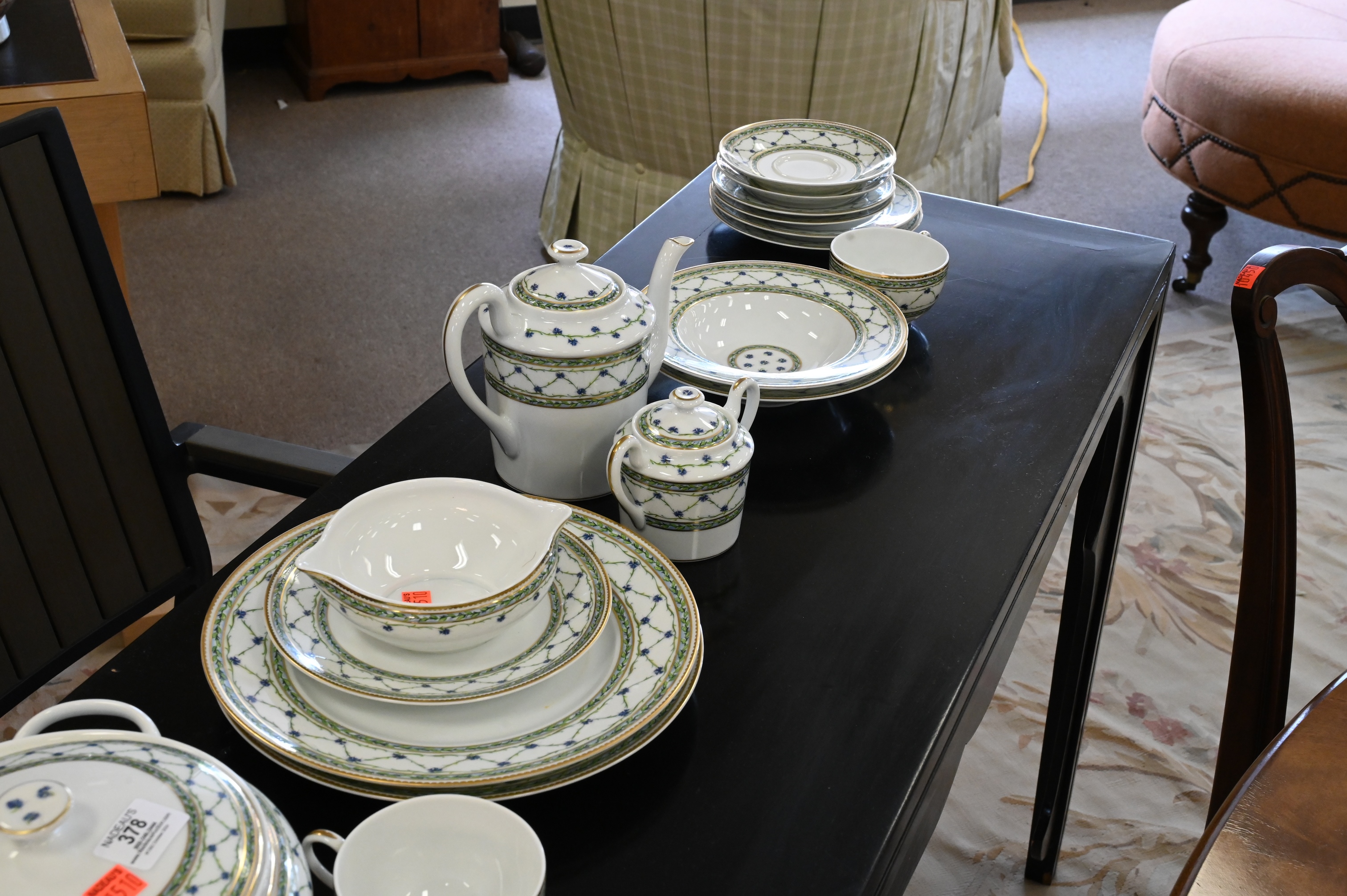 to include eight dinner plates, eight bread and butter plates, eight salad plates, eight teacups, eight saucers, eight soups, teapot, cream, sugar, covered serving dish, and gravy dish