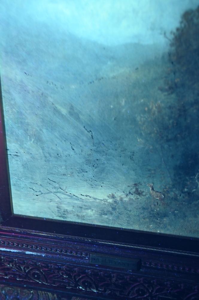 Alexander Helwig Wyant (1836 – 1892), fall landscape with deer, oil on canvas, signed lower right A.H. Wyant, in Victorian gilt frame, 12 5/8″ x 10 1/2″, Christie’s tag on back.