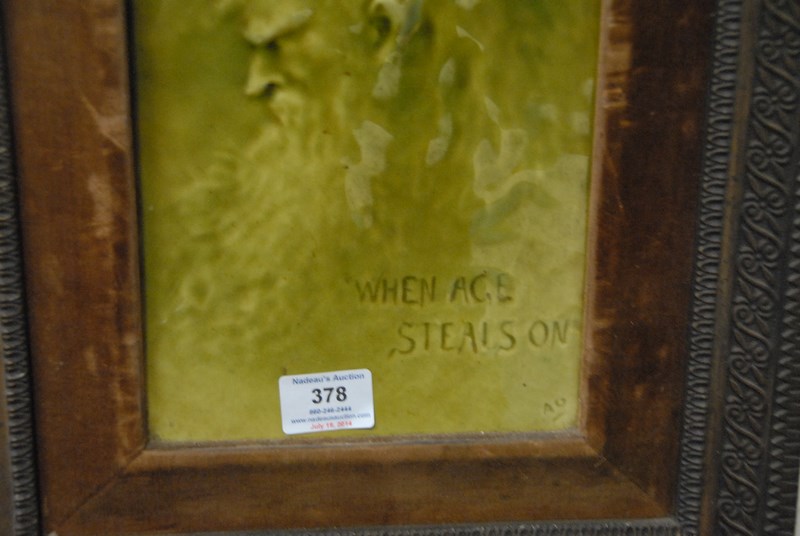 Lot 378: Ceramic green glazed plaque bust of a man When Age Steals On, initialed lower right A.O, framed, 11 x 7.