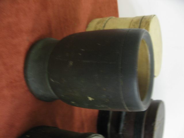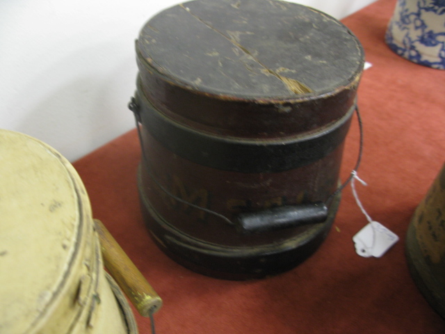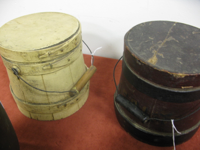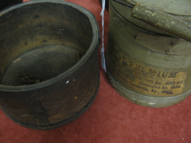 Four piece lot to include: three small primitive firkins and one mortar in green paint.