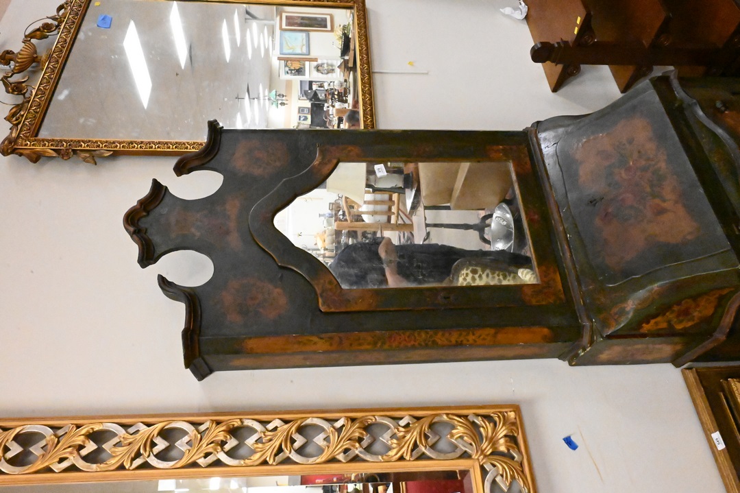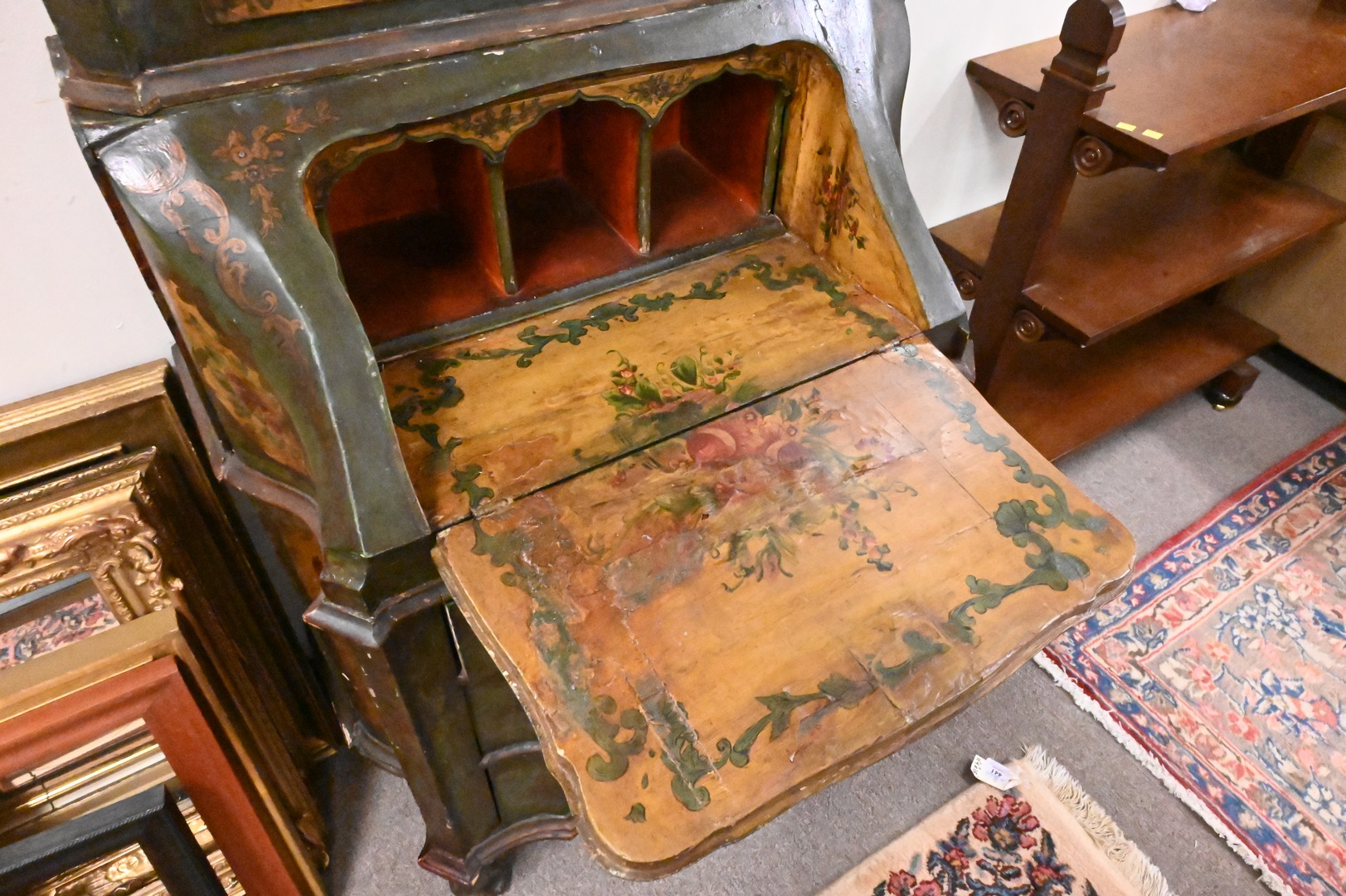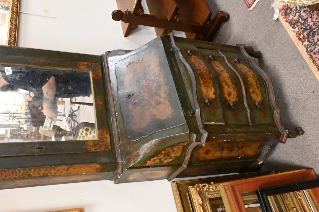 French Painted Two Part Secretary Desk, top having mirrored front, drop front over three drawers ending in short cabriole lets, height 82 inches, width 29 inches.