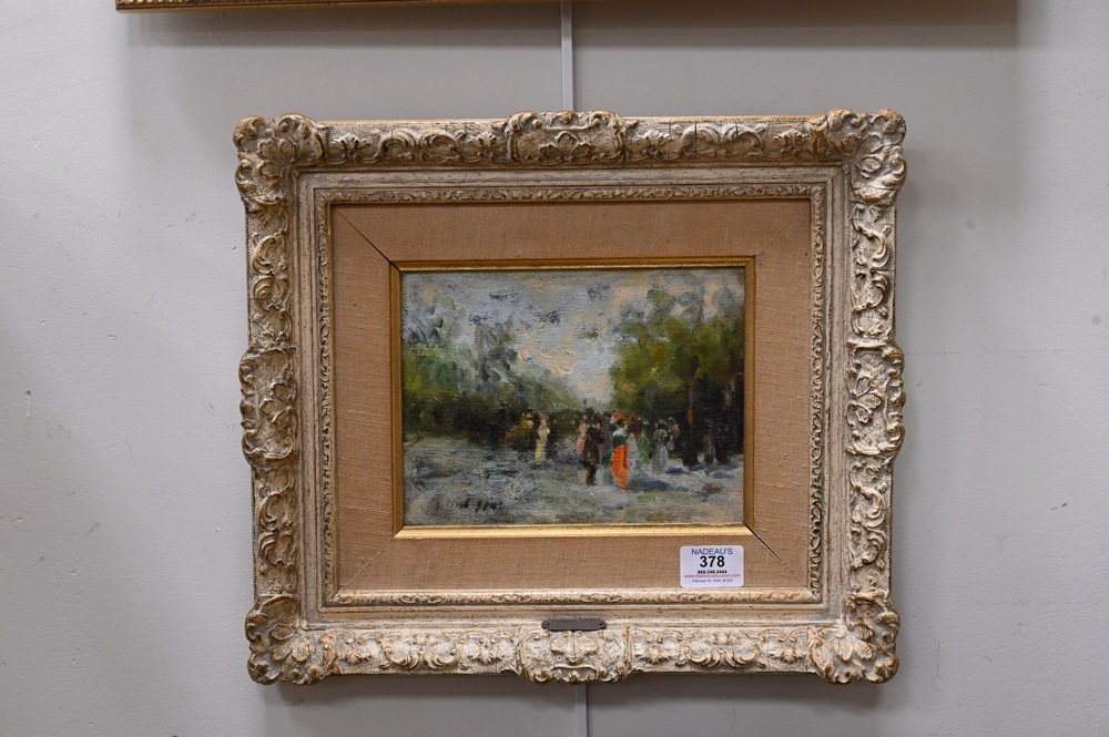 Gabriel Spat (1890 – 1967), “Pique-nique au bois de Boulogne” Paris, oil on canvas board, signed lower left, original label on back, Skinner number 217 tag on back, 6″x 8″.