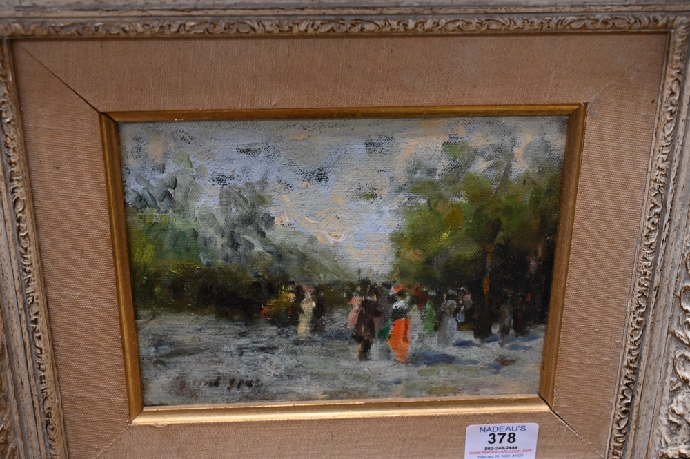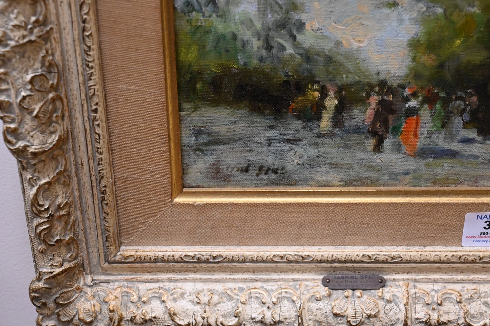 Lot 378: Gabriel Spat (1890 – 1967), “Pique-nique au bois de Boulogne” Paris, oil on canvas board, signed lower left, original label on back, Skinner number 217 tag on back, 6″x 8″.