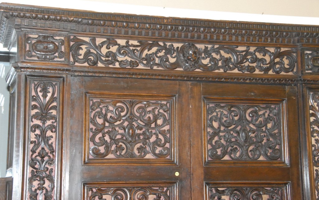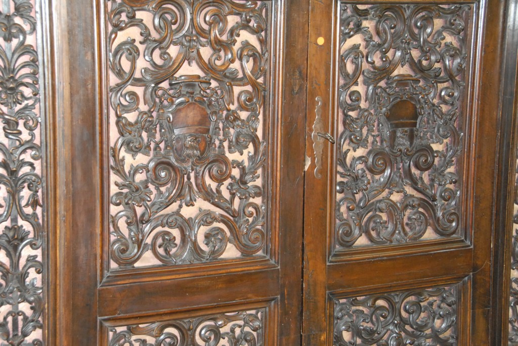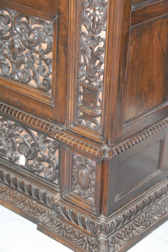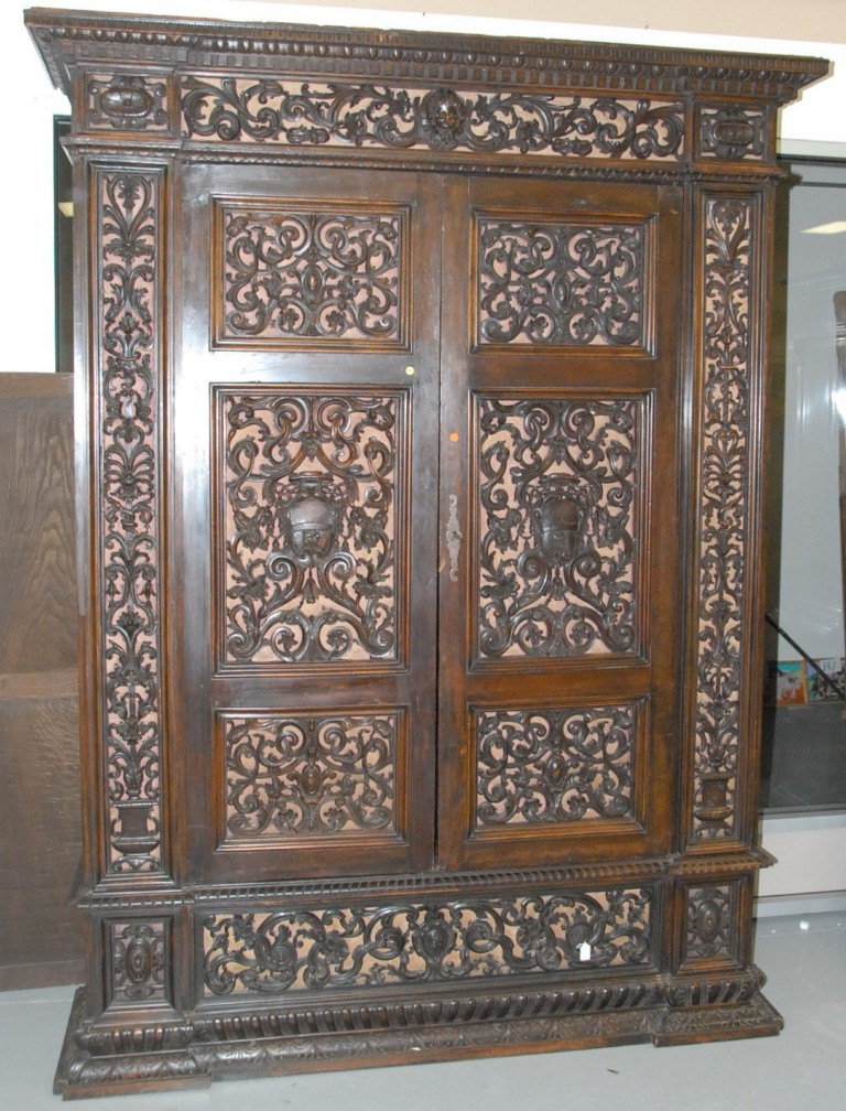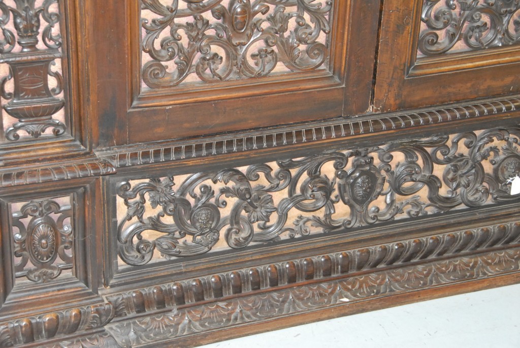 Large Continental cabinet fitted with shelves inside upper section with pierced carving over two pierced carved doors on base with pierced carved drawer, 19th century. height 8ft.2in. width 6ft.2in. depth 21in.
