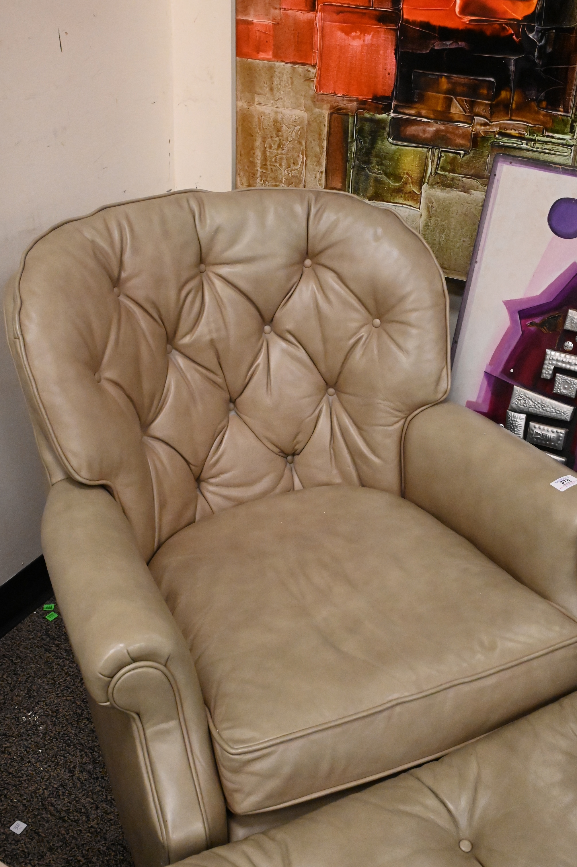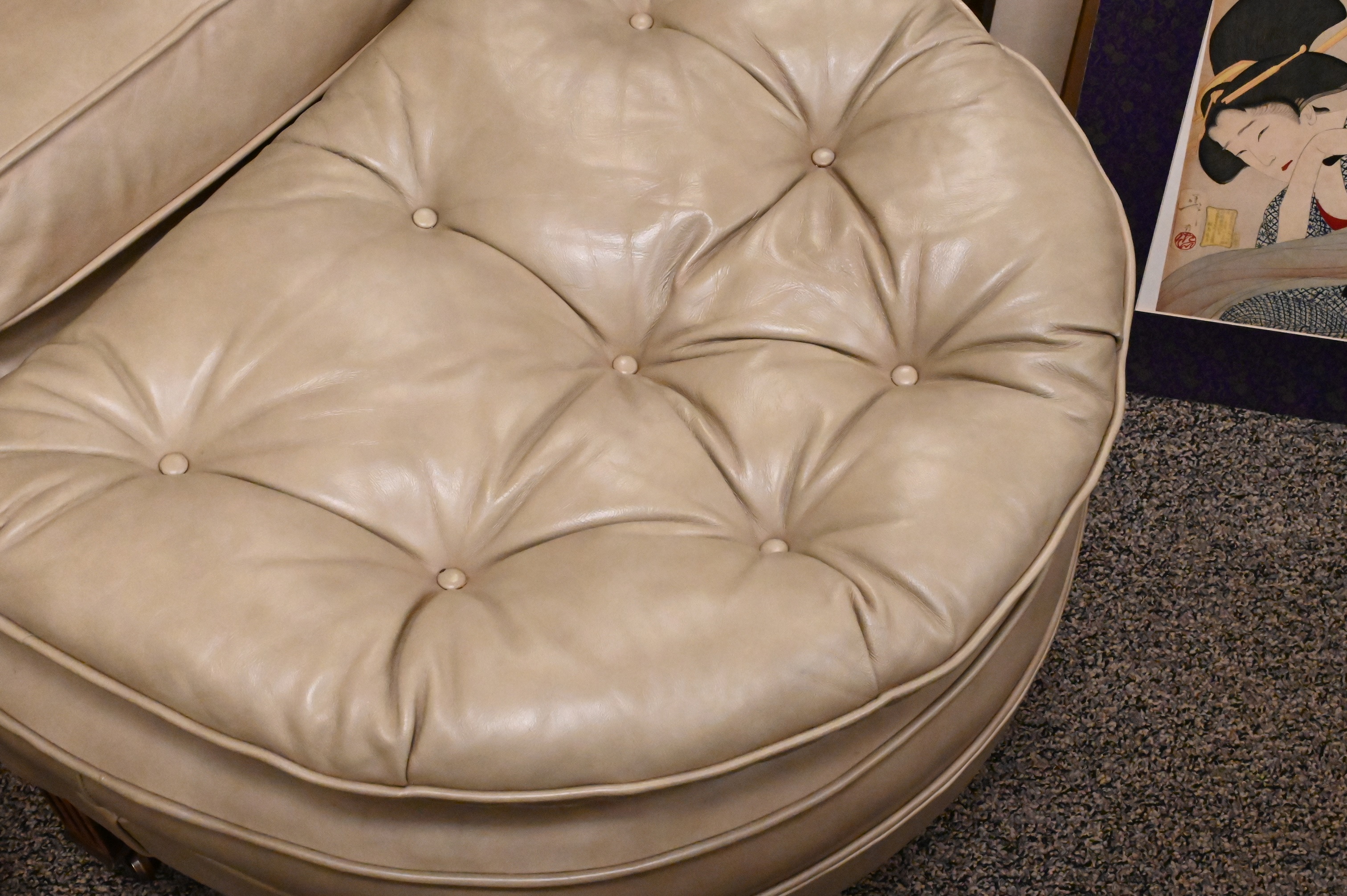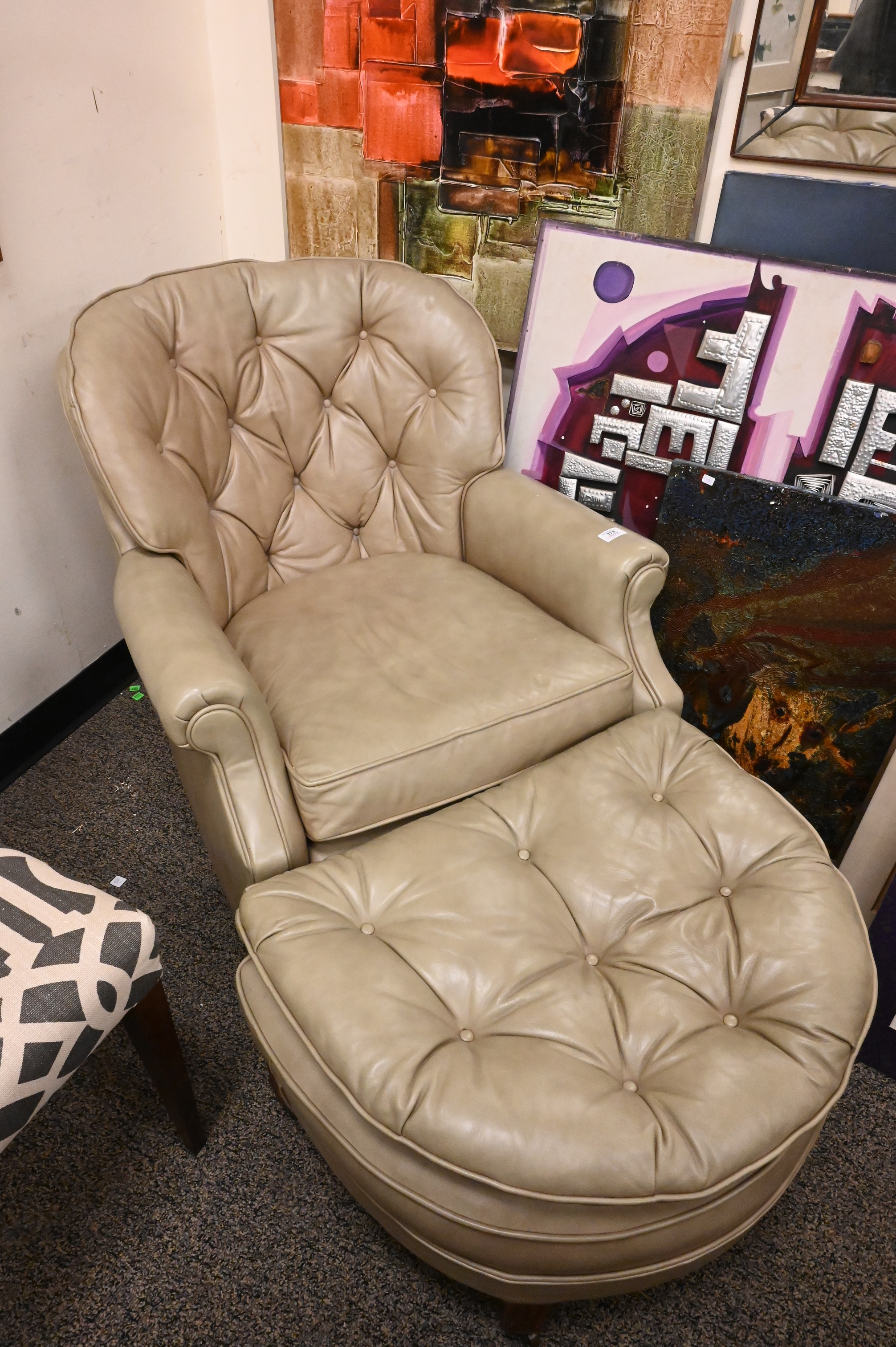 Leather Upholstered Chair, having tufted back and tufted top ottoman, height 30 inches, width 30 inches.