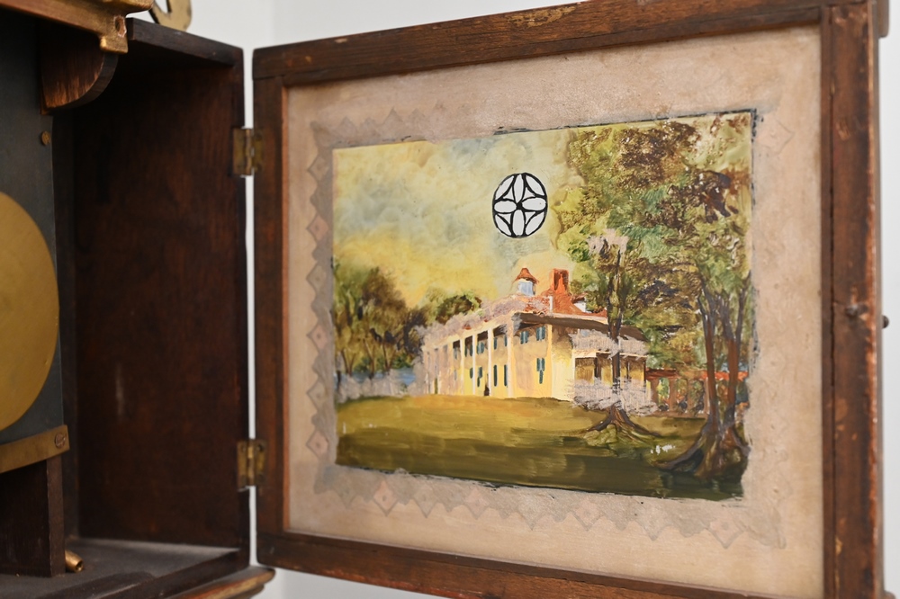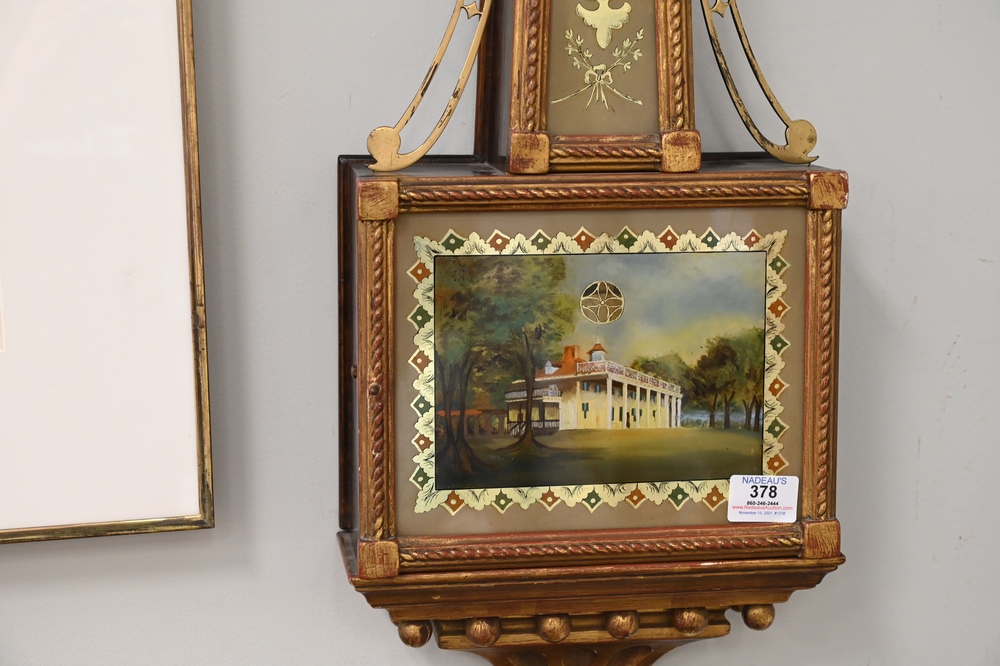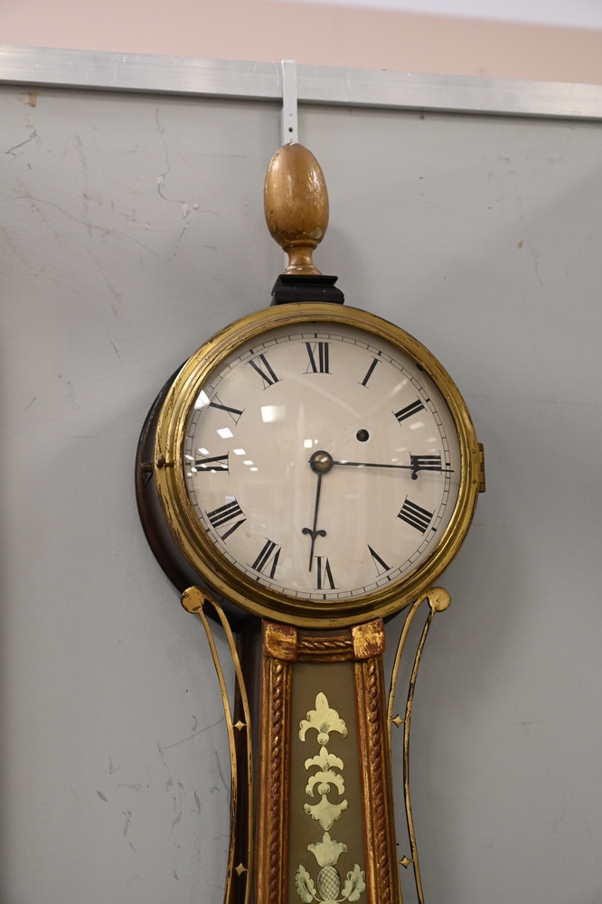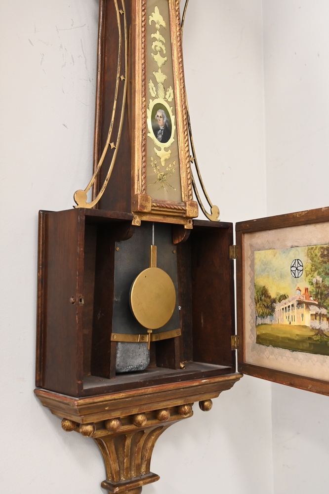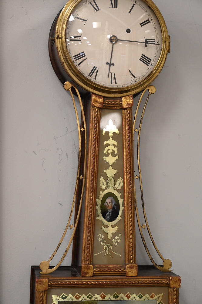 Lot 378: Mahogany Banjo Clock, having painted eglomise panels of George Washington on the neck and a house on the bottom panel, height 40 inches.