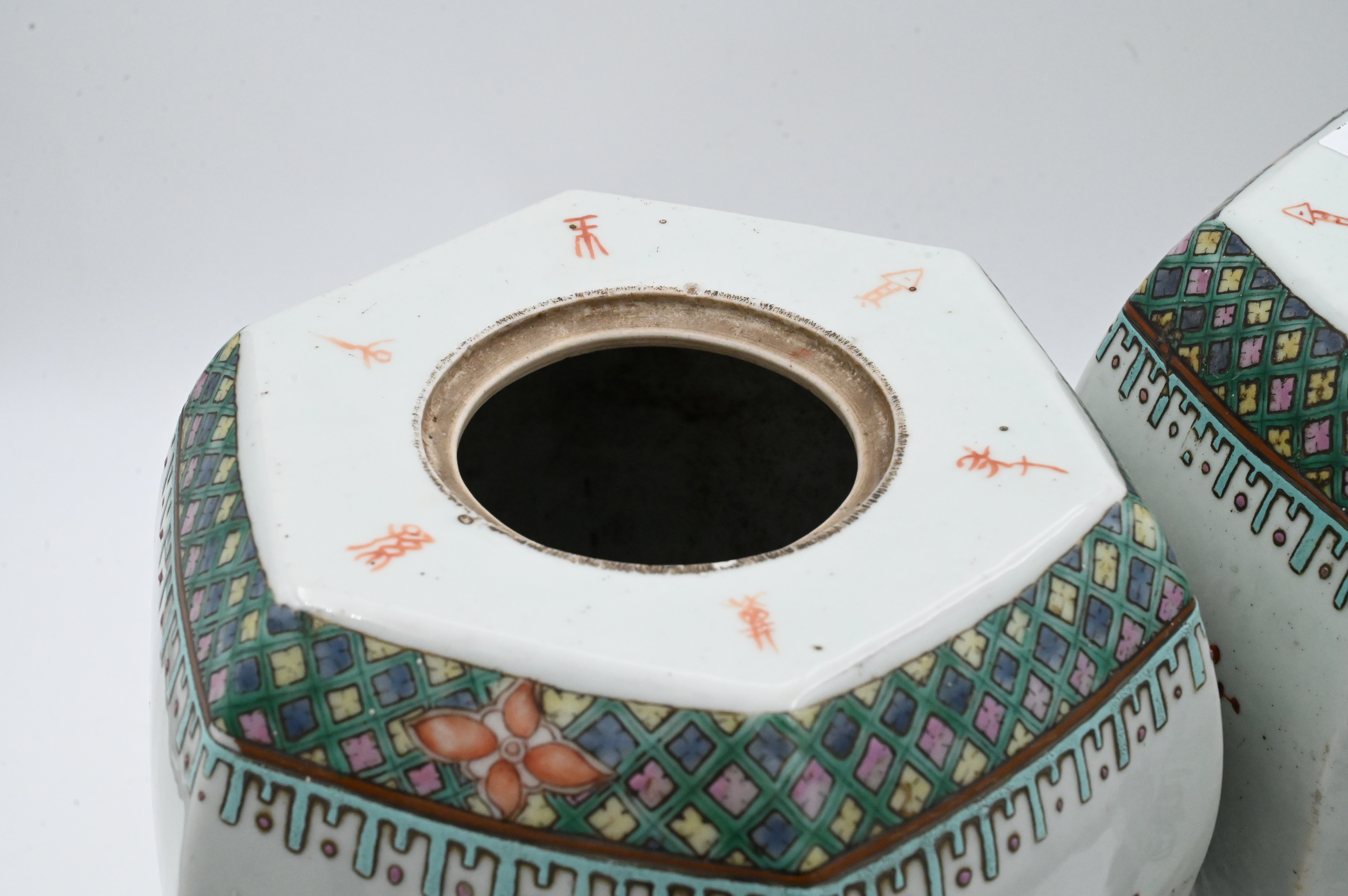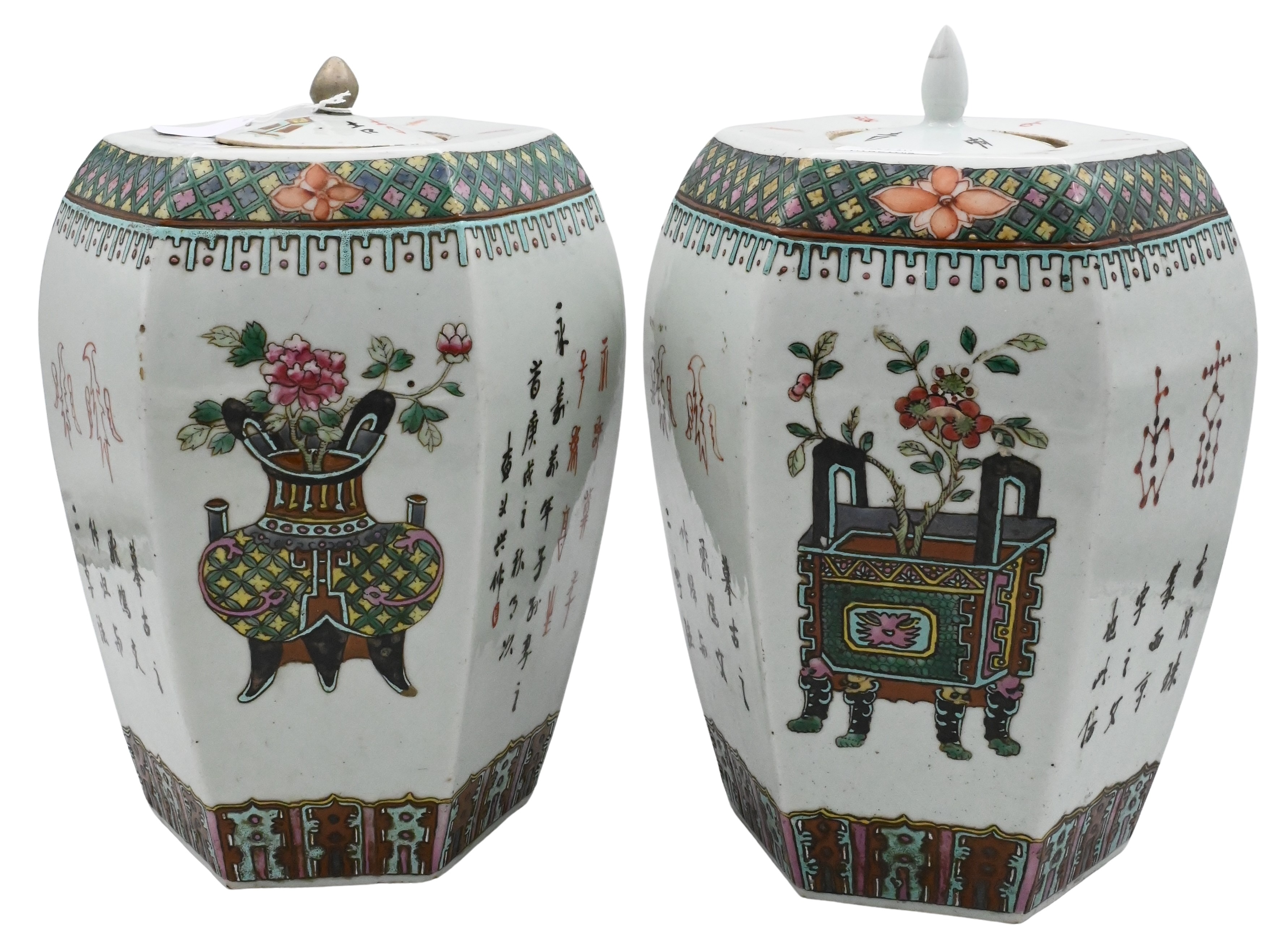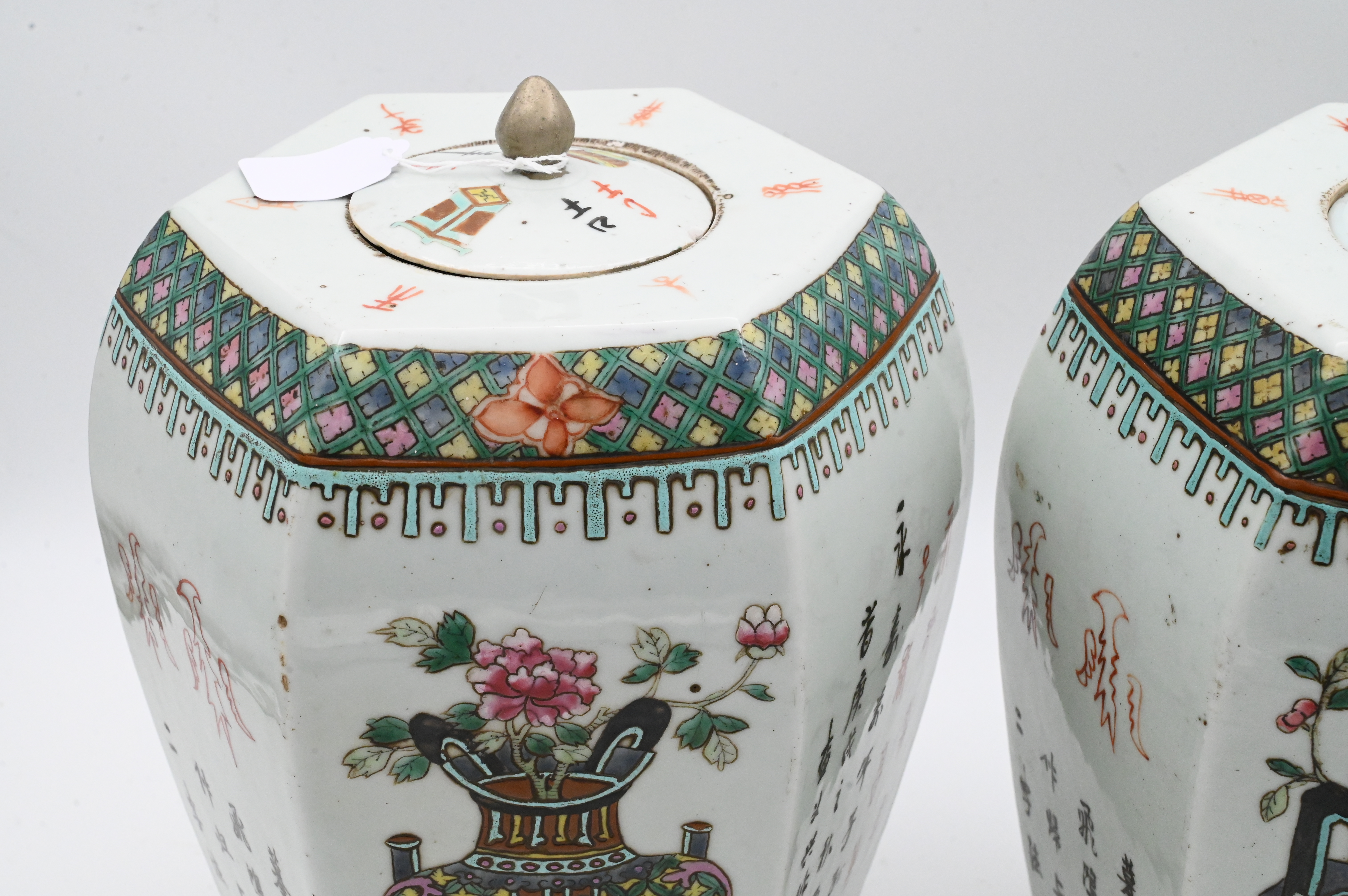 Lot 378: Near Pair of Chinese Squared Famille Rose Ginger Jars