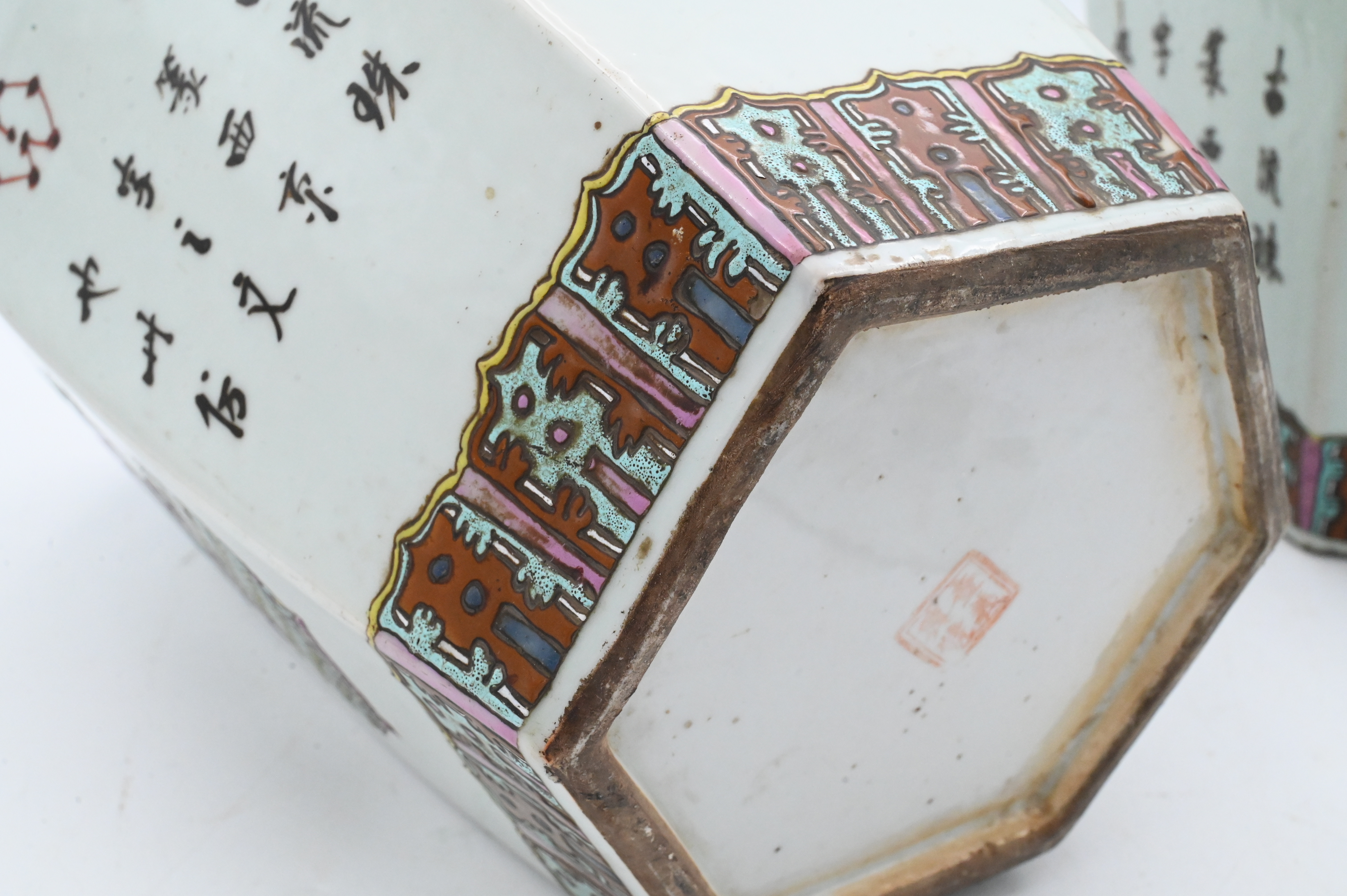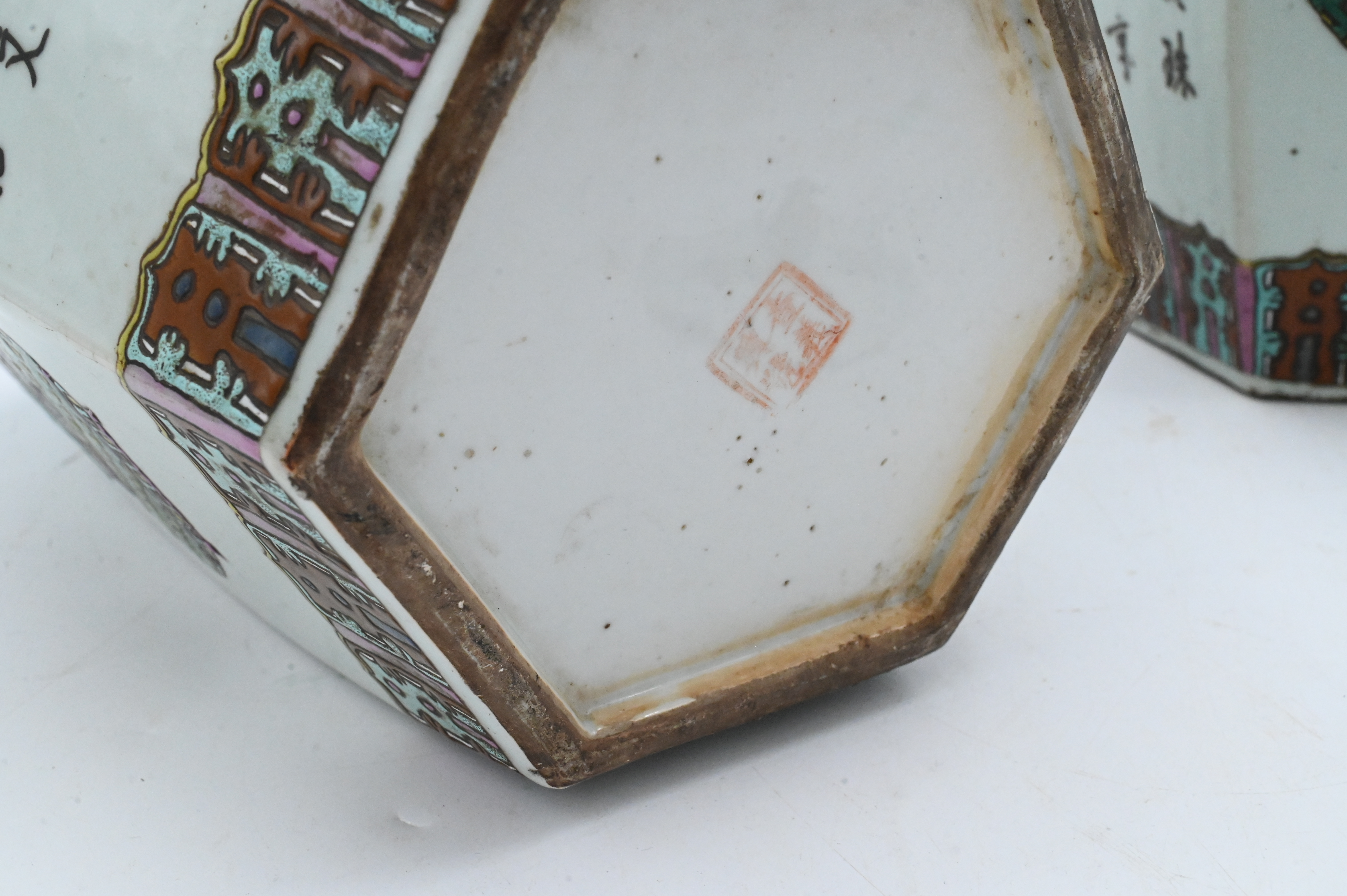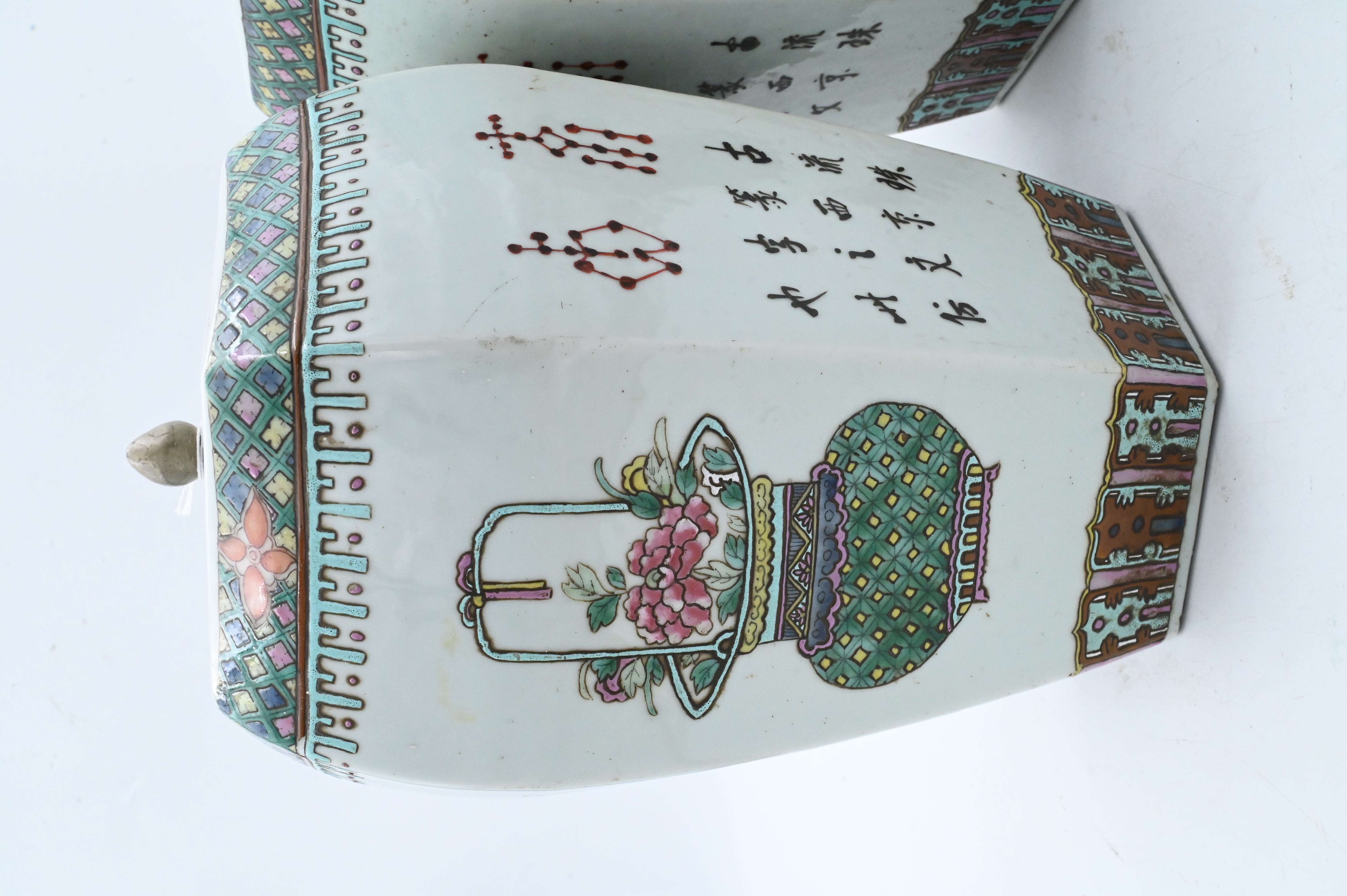 Lot 378: Near Pair of Chinese Squared Famille Rose Ginger Jars