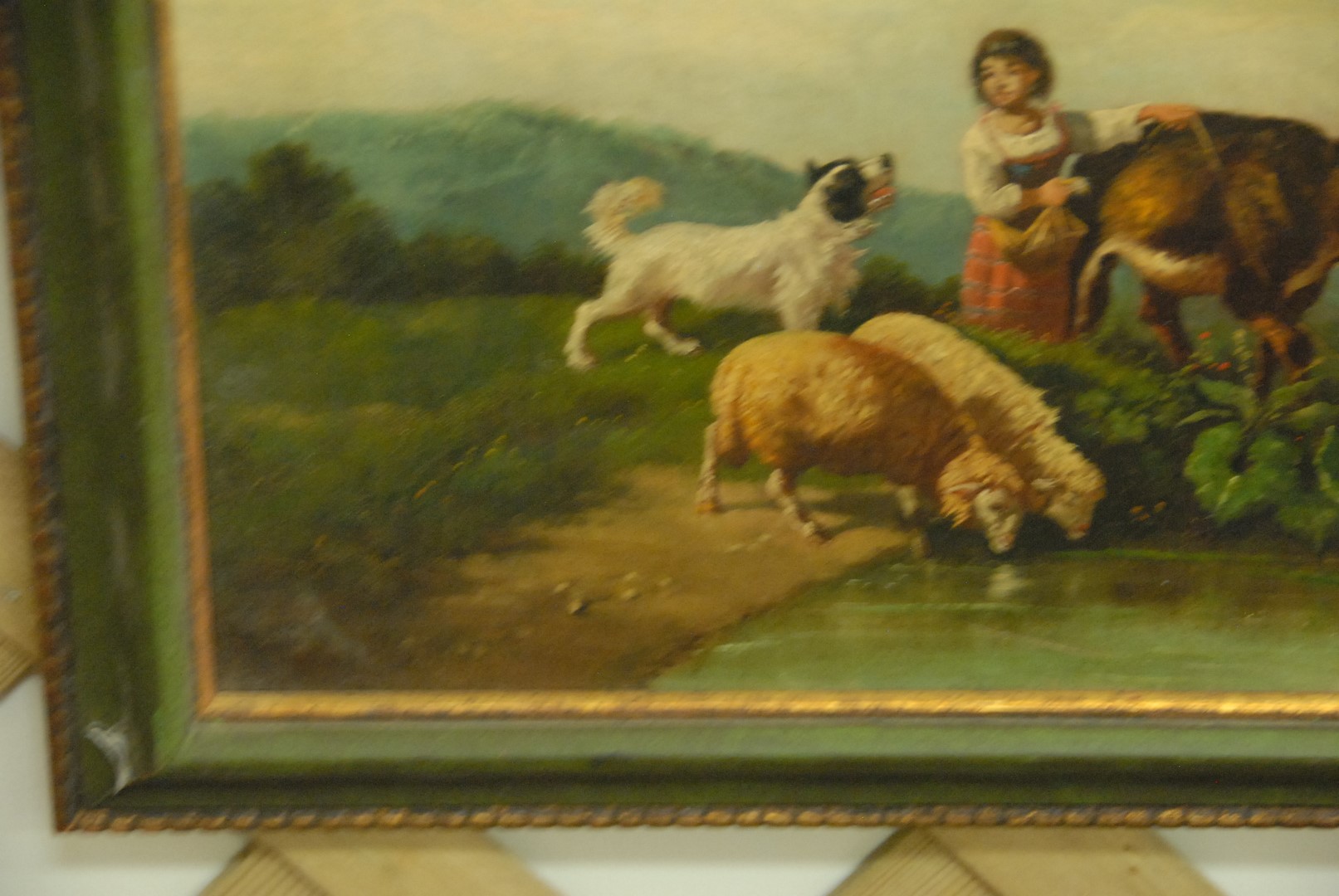 Oil on canvas of a young girl with her animals, unsigned. 10 x 15