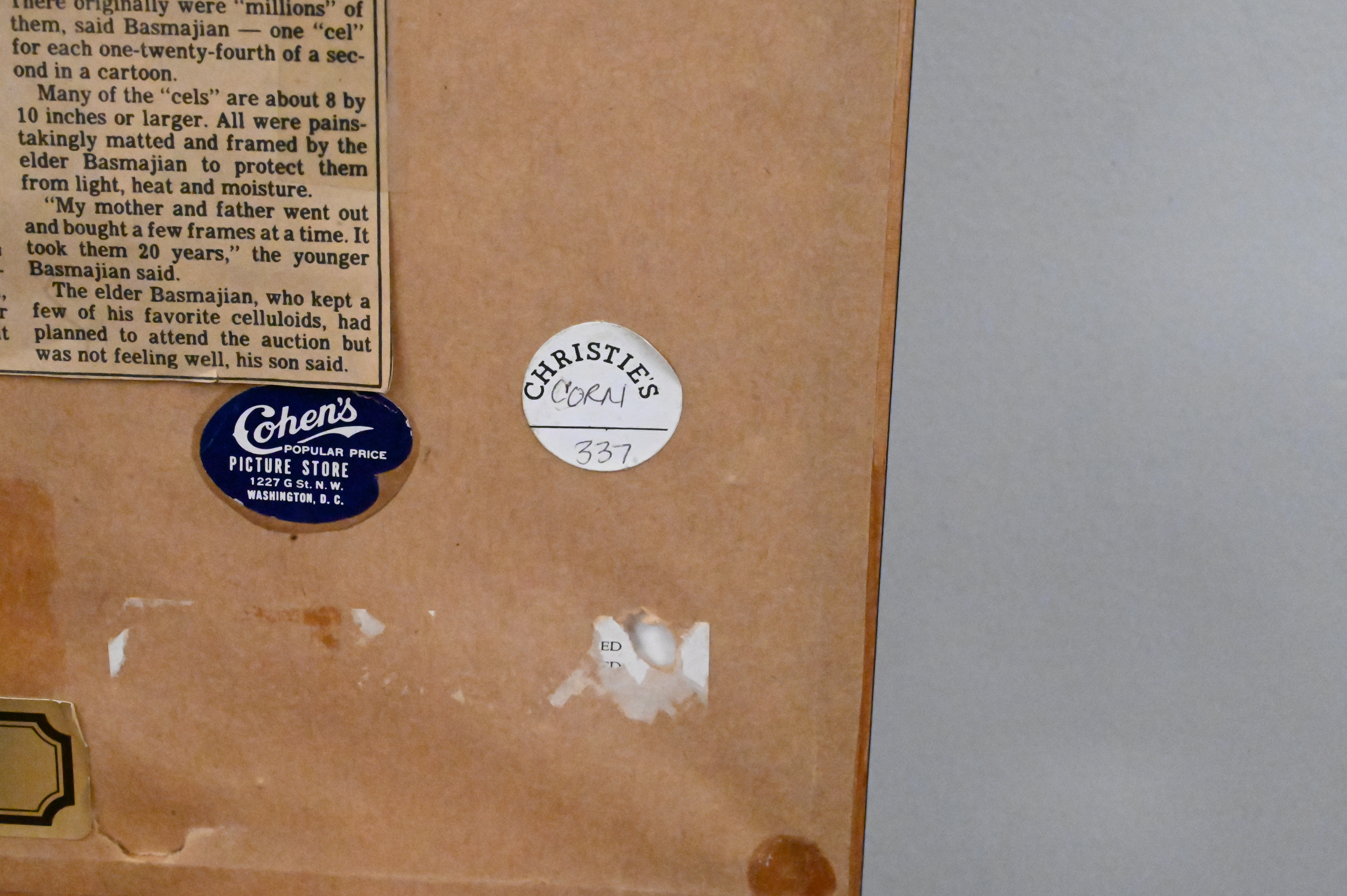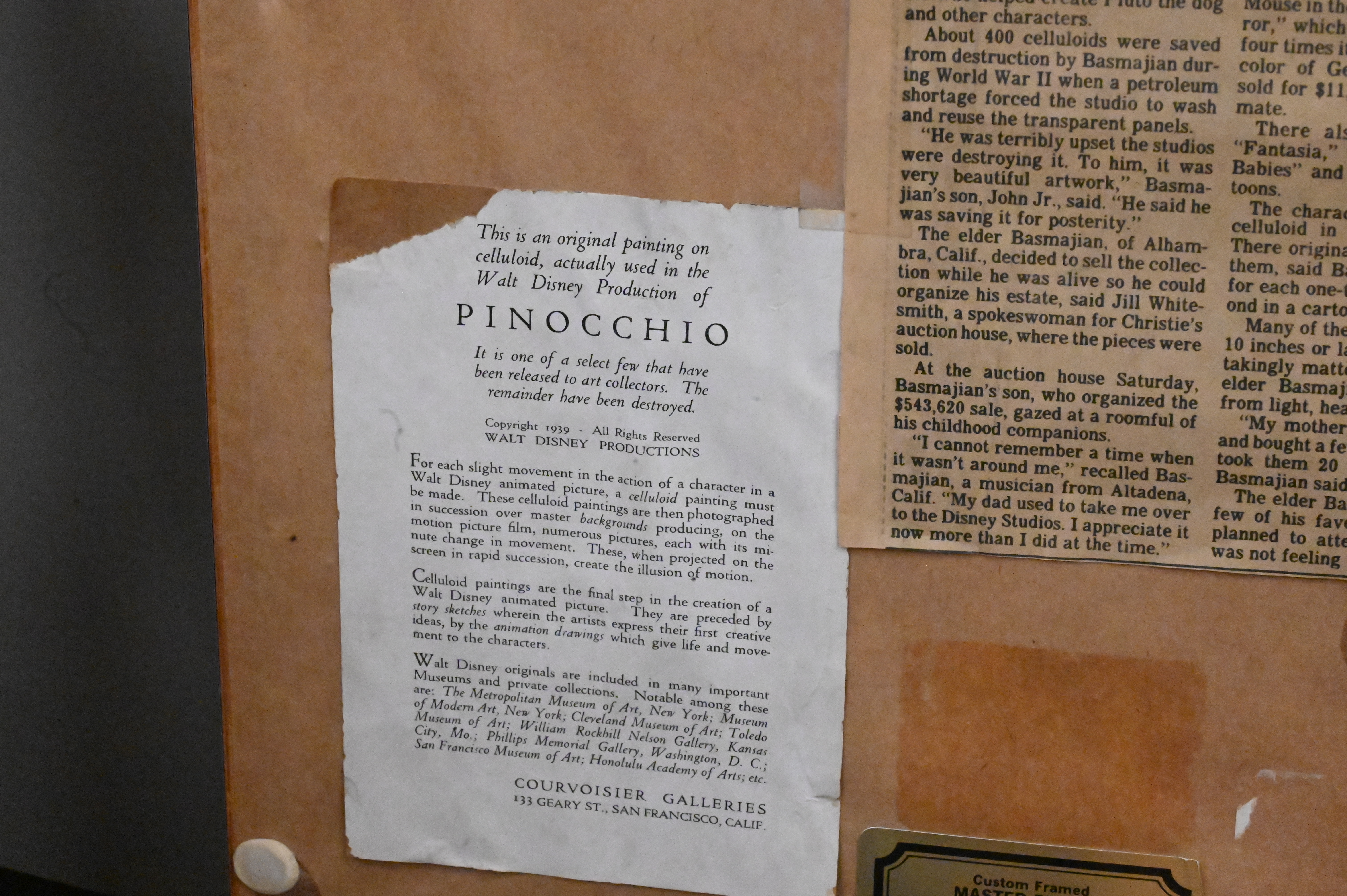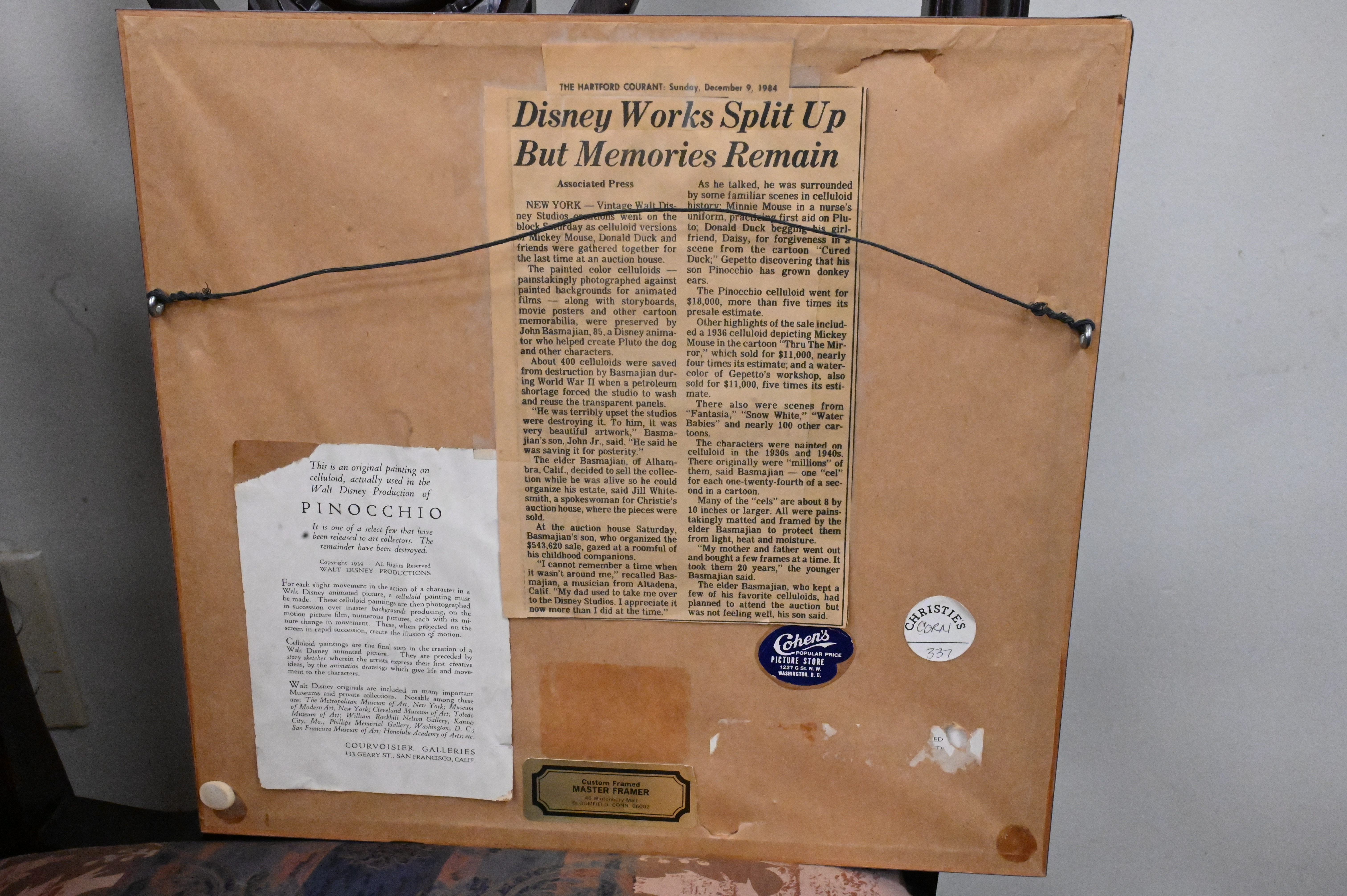 Original Disney Animation Production Cel of Jiminy Cricket, from the animation film Pinocchio, having an old Christie’s tag along with Courvoisier Galleries label on verso, 5 3/4″ x 6 1/2″.