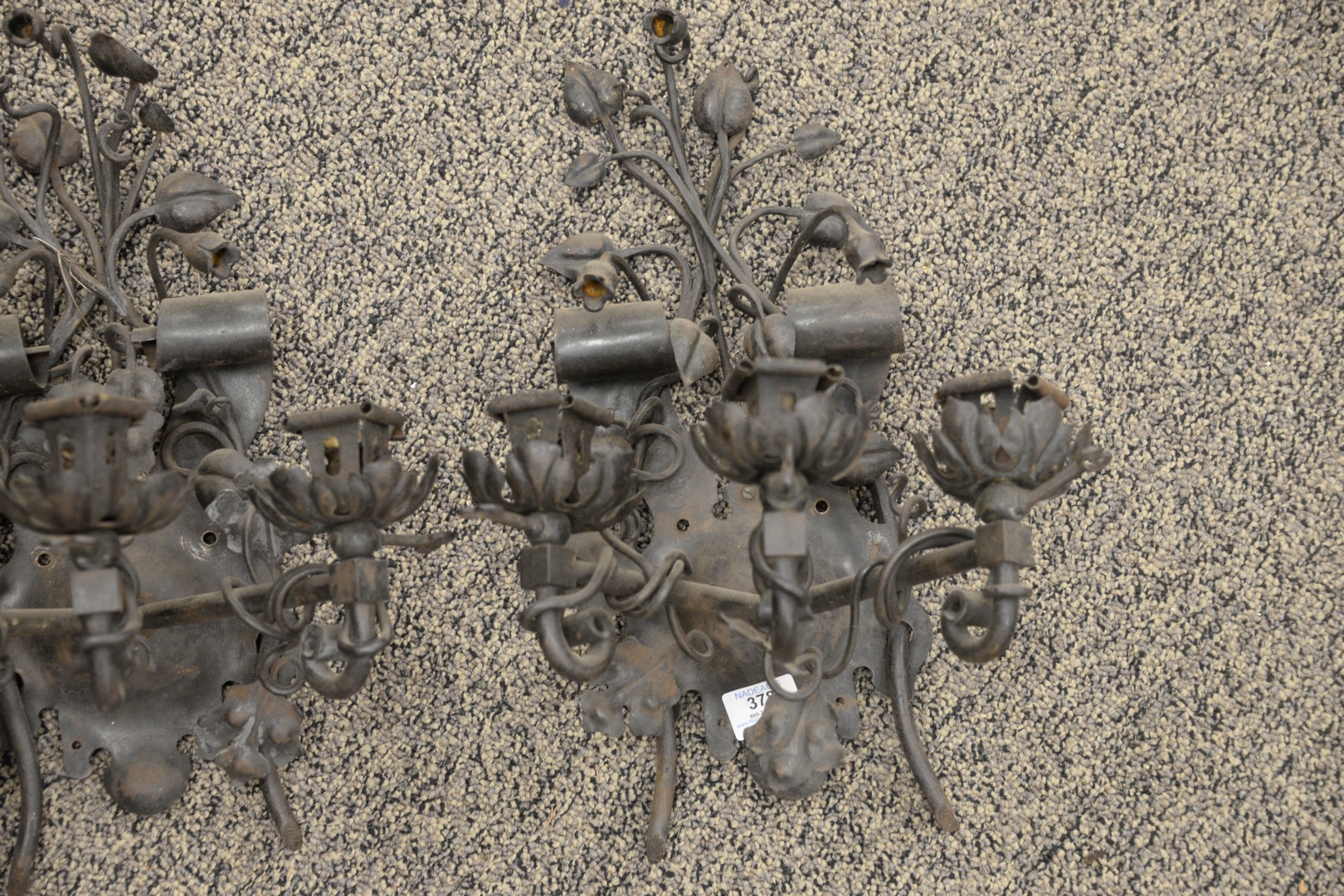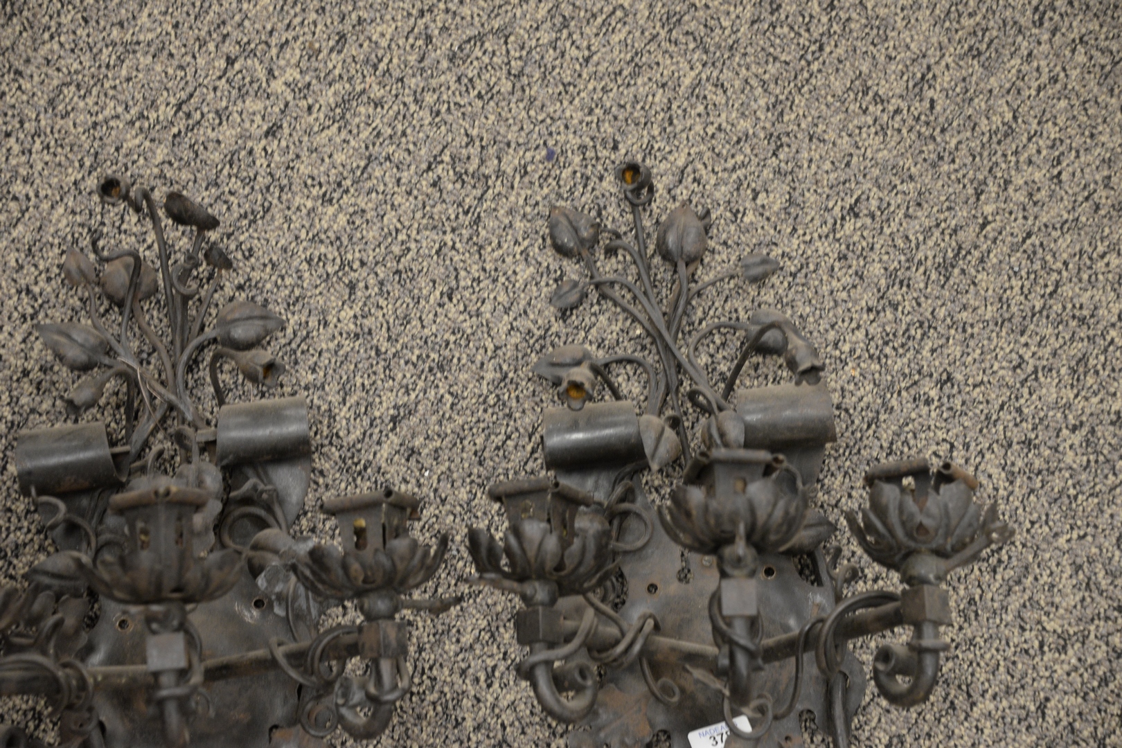 Lot 378: Pair of Ceril Conlick American Wrought Iron Wall Sconces, each having three lights, length 18 inches, width 10 1/2 inches.