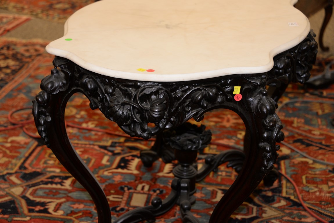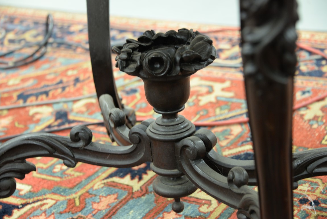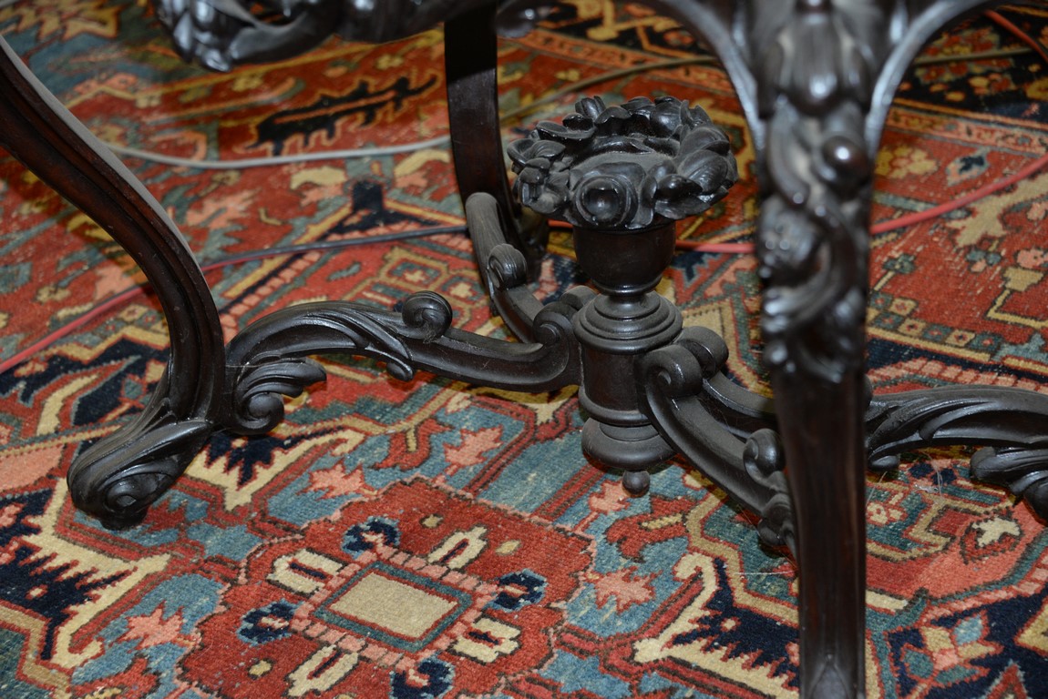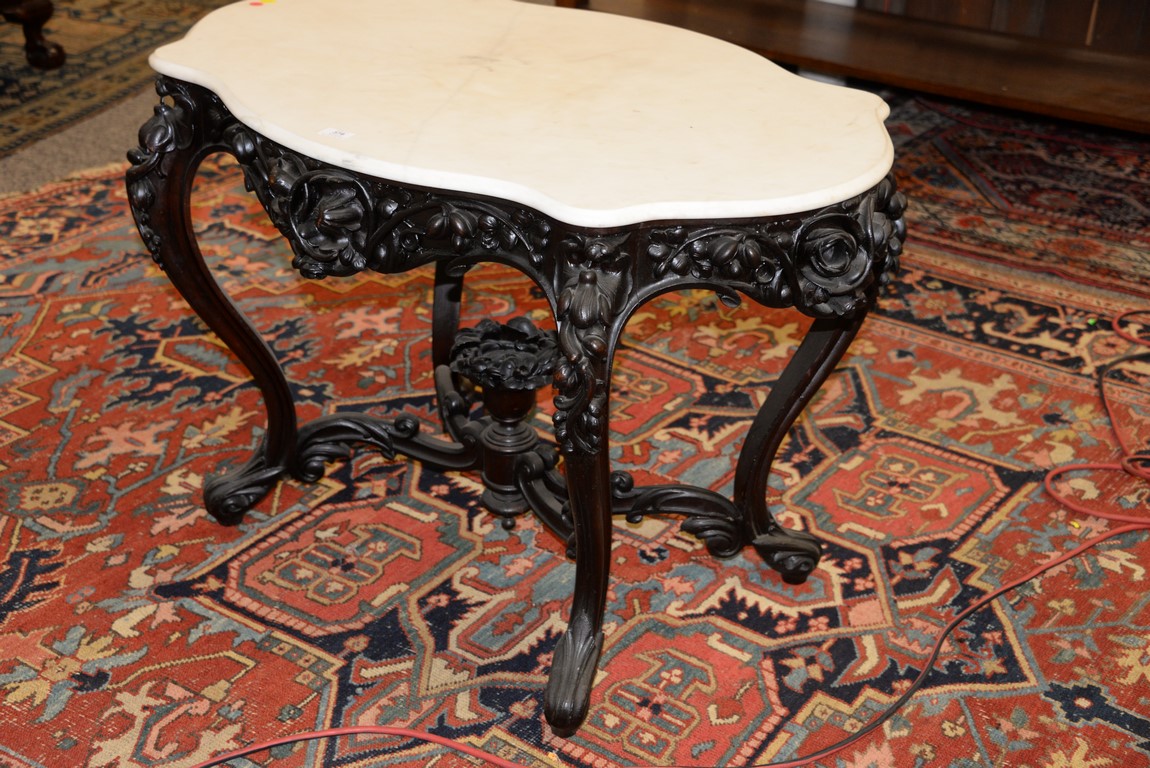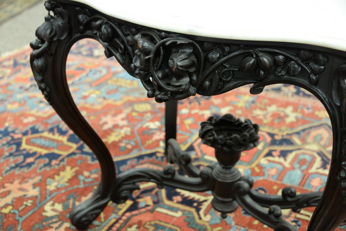 Lot 378: Rosewood Victorian center table having shaped marble top over highly carved three dimensional floral frieze and legs with floral car…