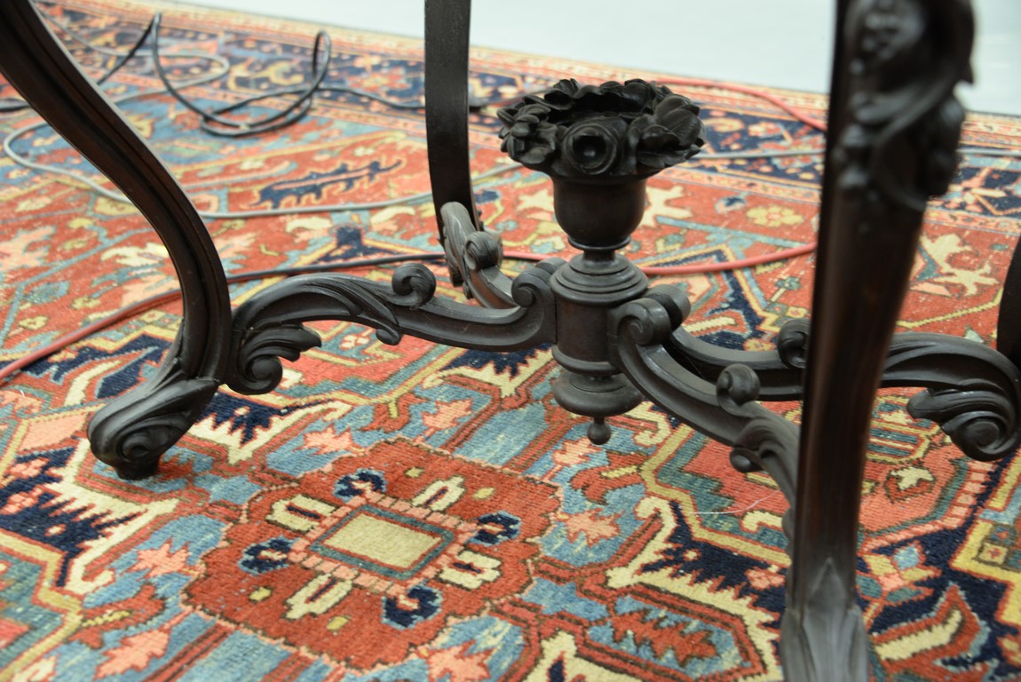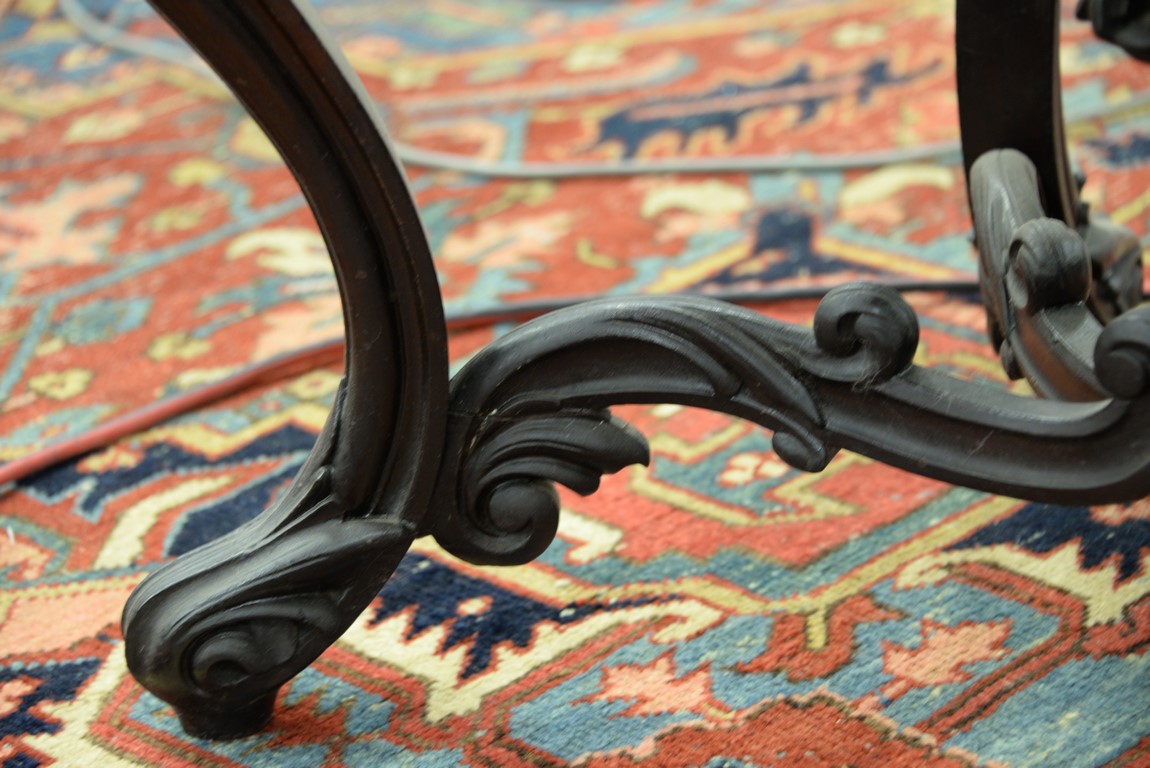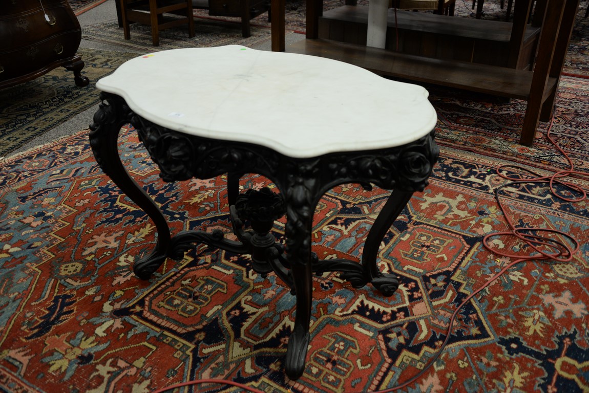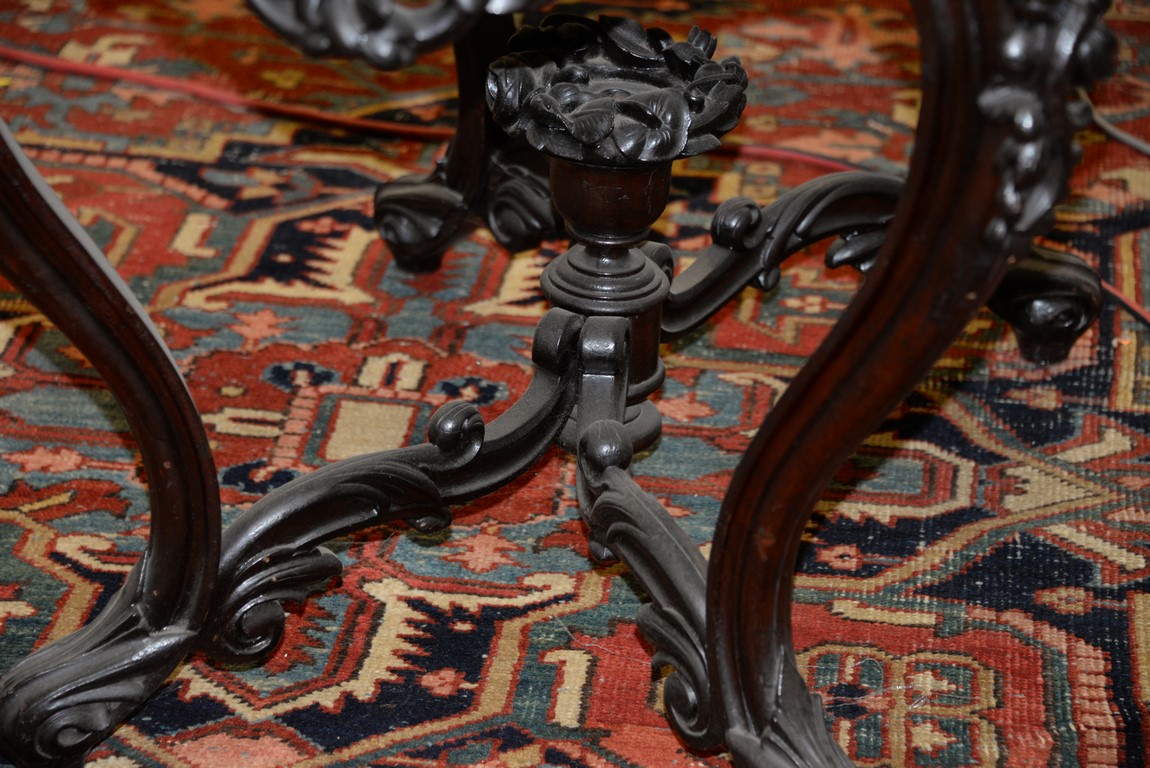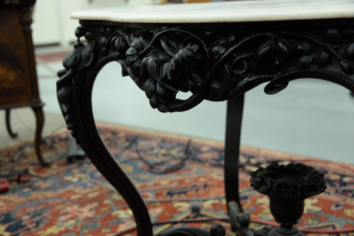 Lot 378: Rosewood Victorian center table having shaped marble top over highly carved three dimensional floral frieze and legs with floral car…