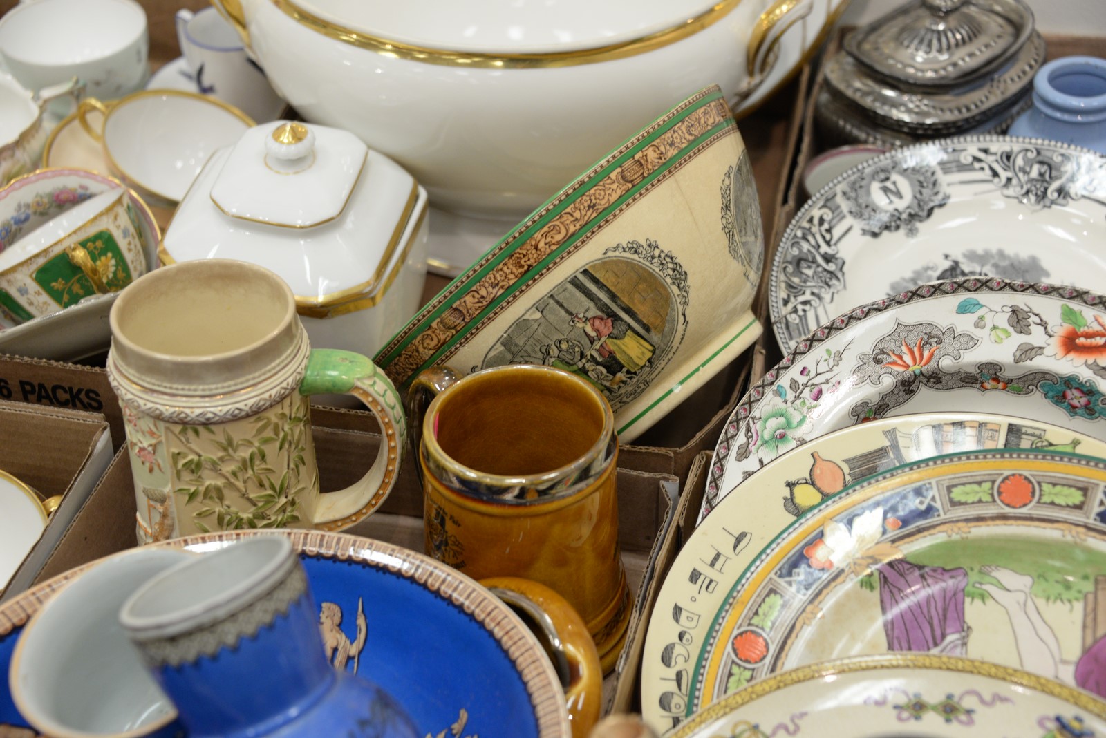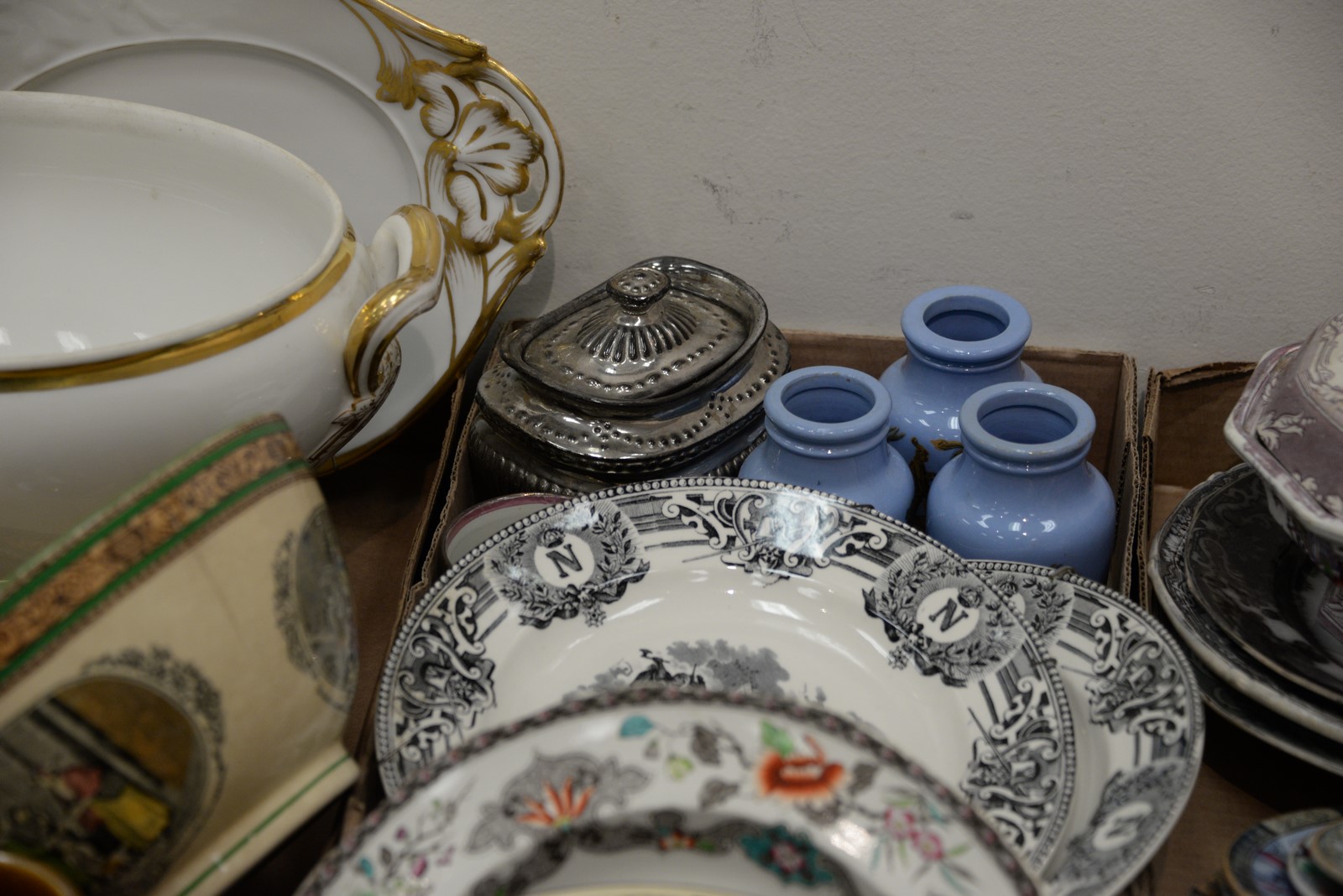 Lot 378: Six box lots to include Staffordshire, ironstone covered tureen and plates, Royal Doulton plate, two Napolean plates, etc.