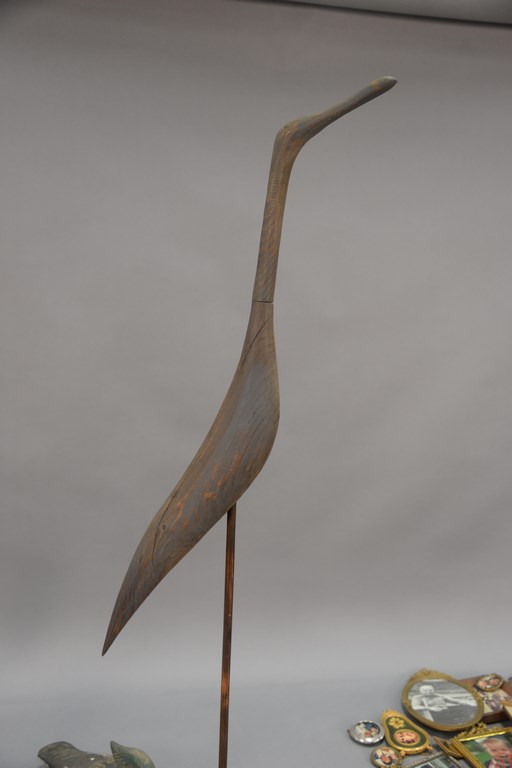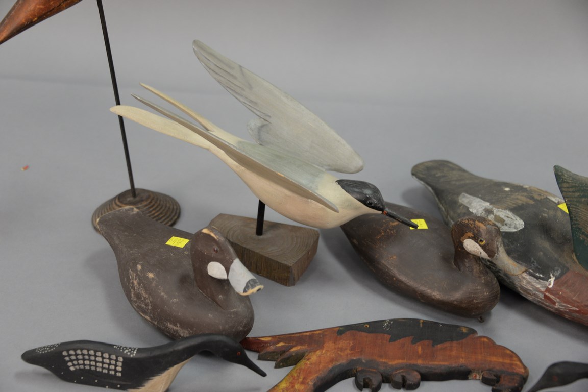 Lot 378: Ten piece lot including three duck decoys with glass eyes, one marked on base AAW, one marked on base RLW and one not marked, 10 -…
