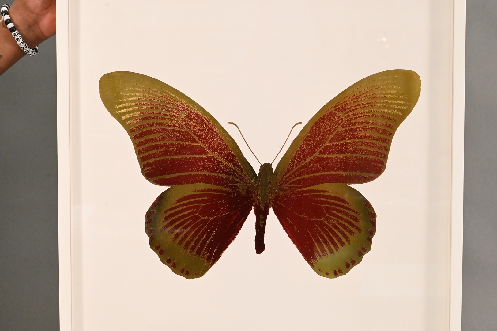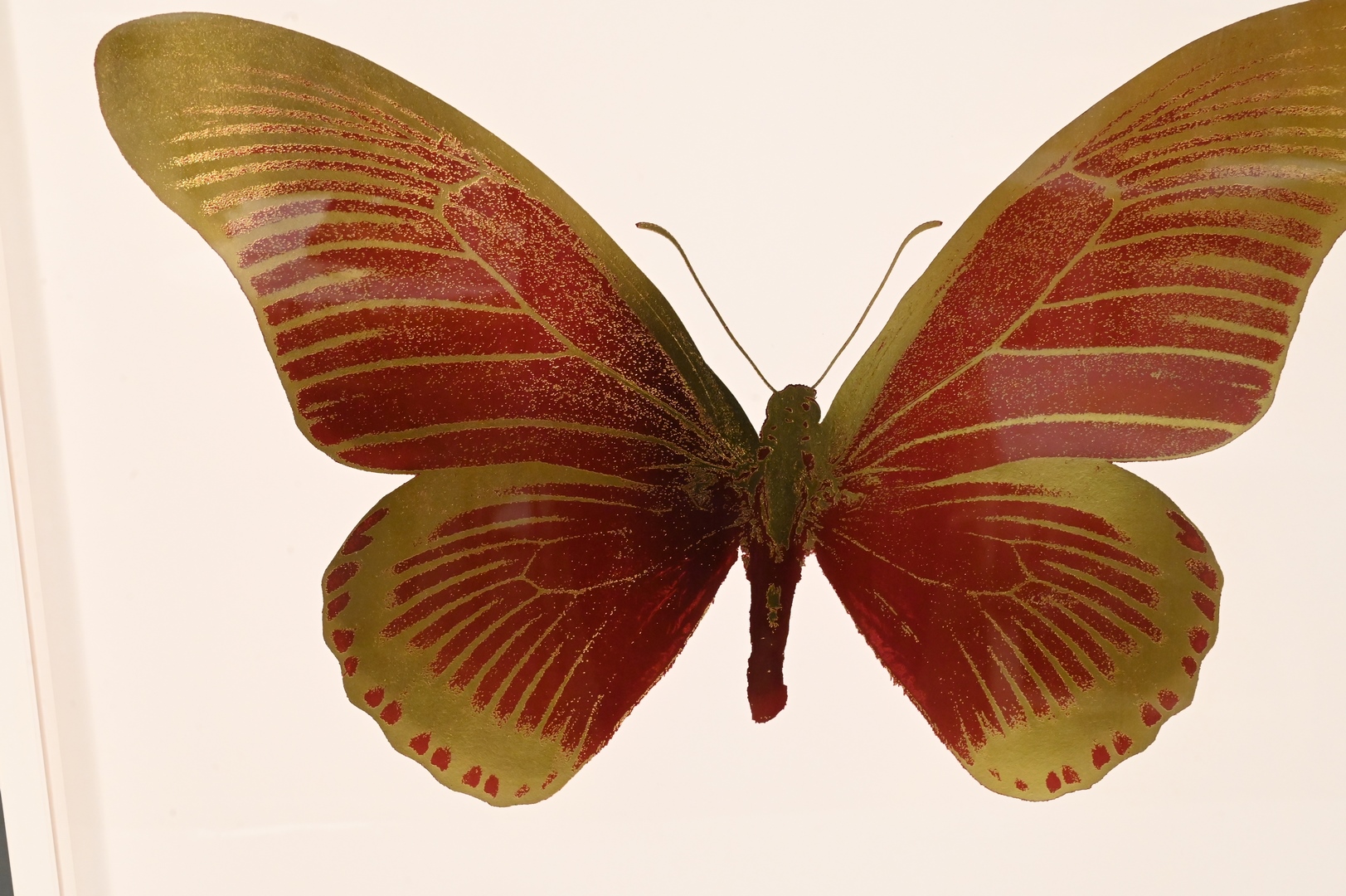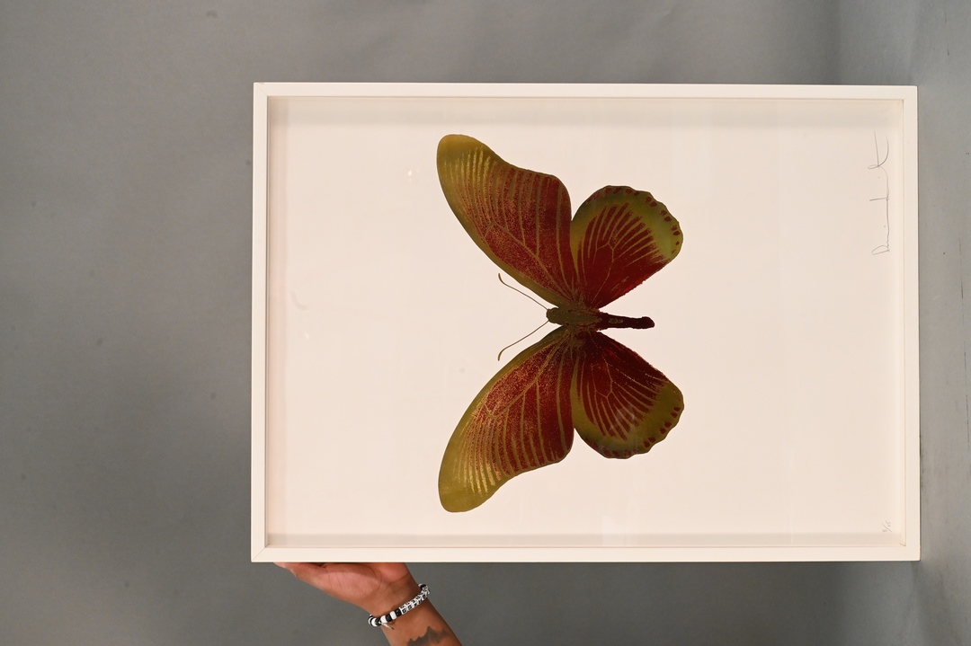 Damien Hirst (b. 1965) “Red and Gilt Butterfly” foil block print on a white background pencil signed # 8/15, Damien Hirst 28″ x 19 3/4″ Condition: good condition