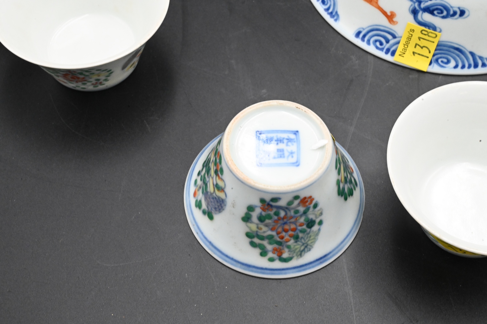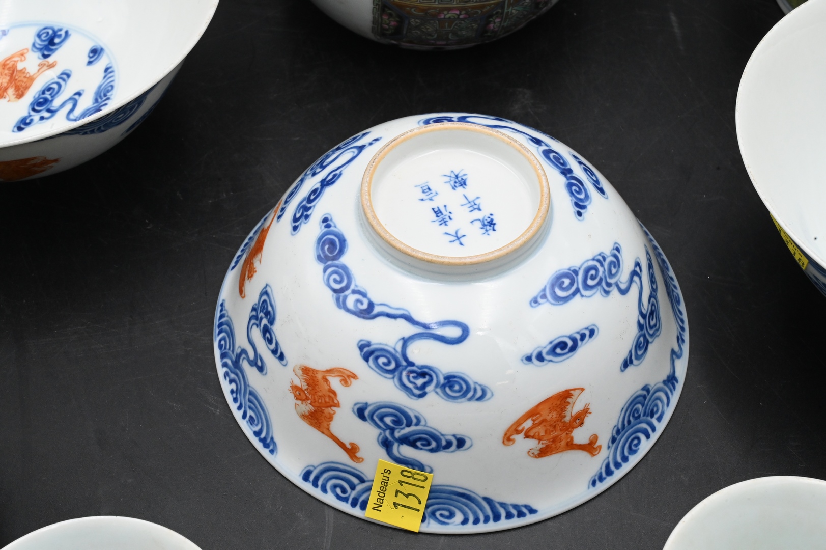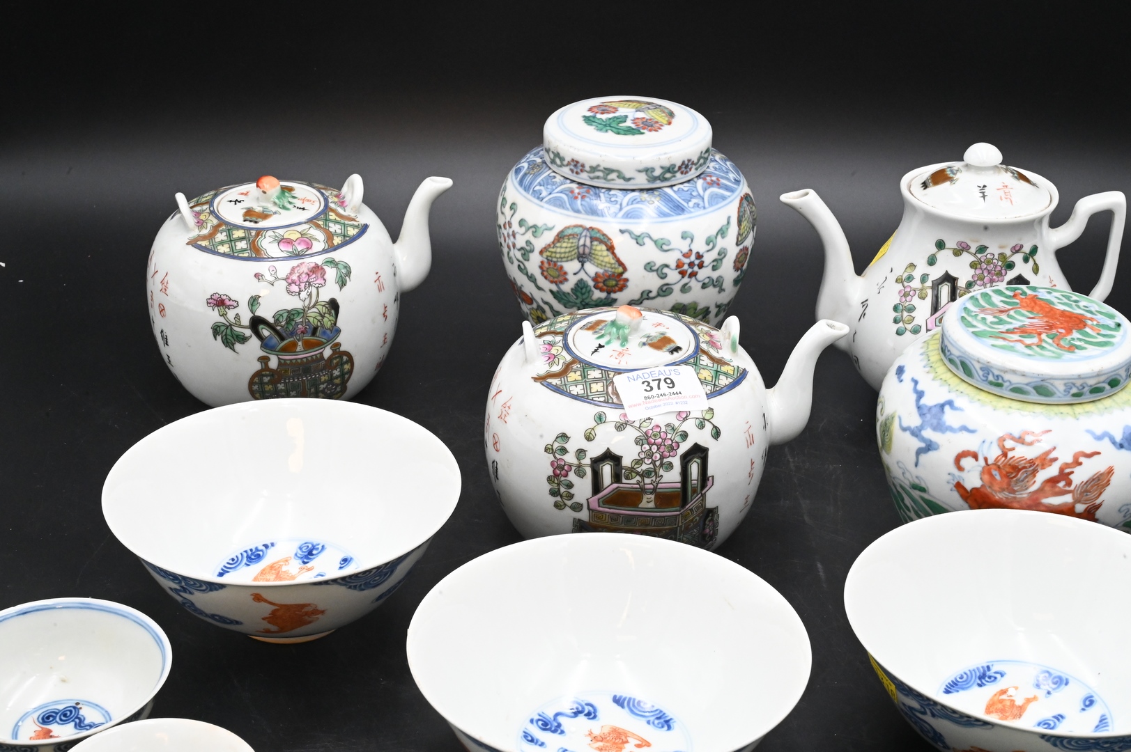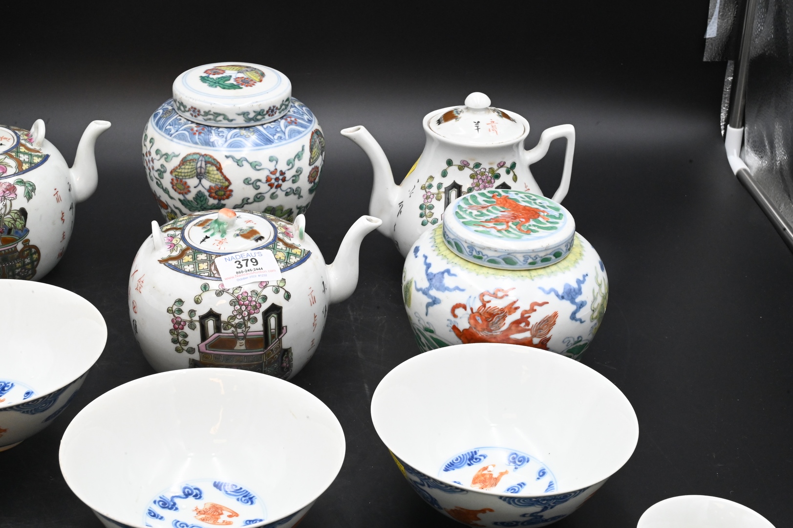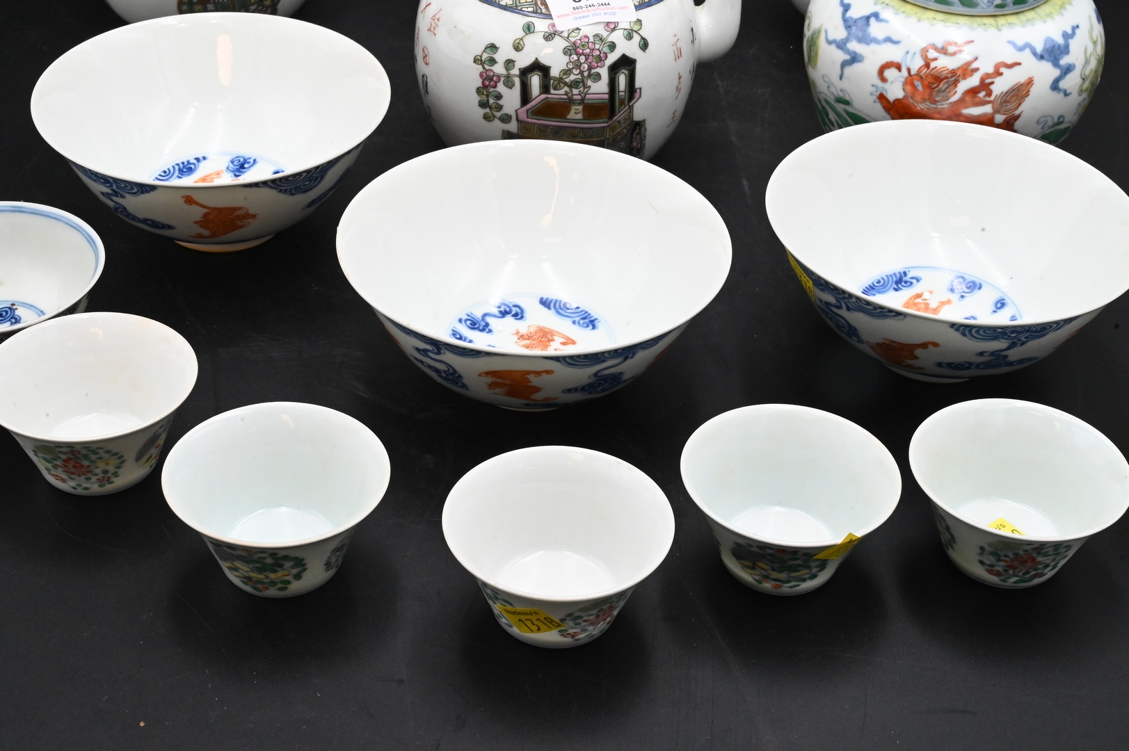 Group of Chinese Porcelain, to include four underglaze blue and iron red bat bowls, set of six Ducai cups, three teapots, along with two ginger jars, tallest 6 inches.