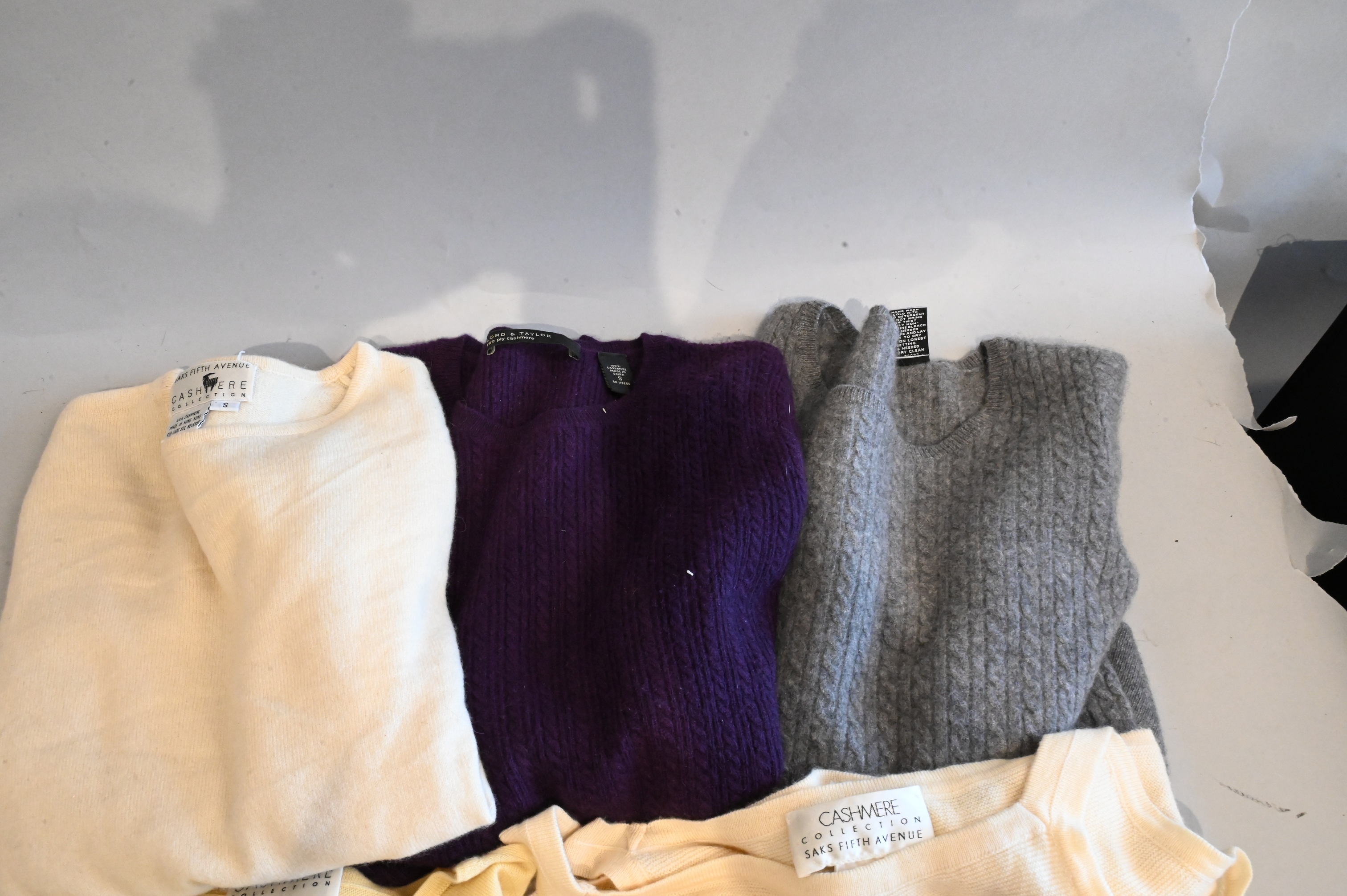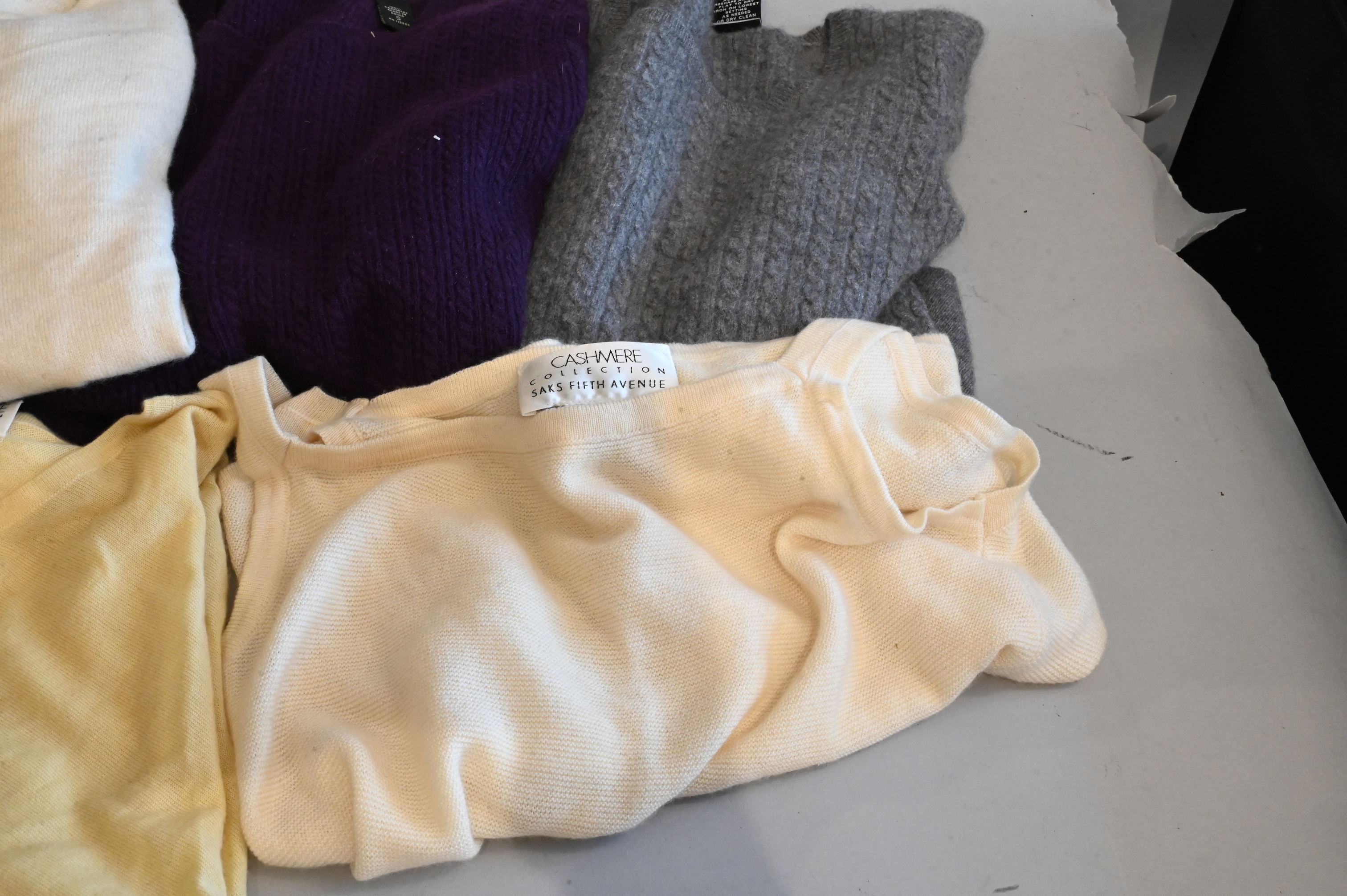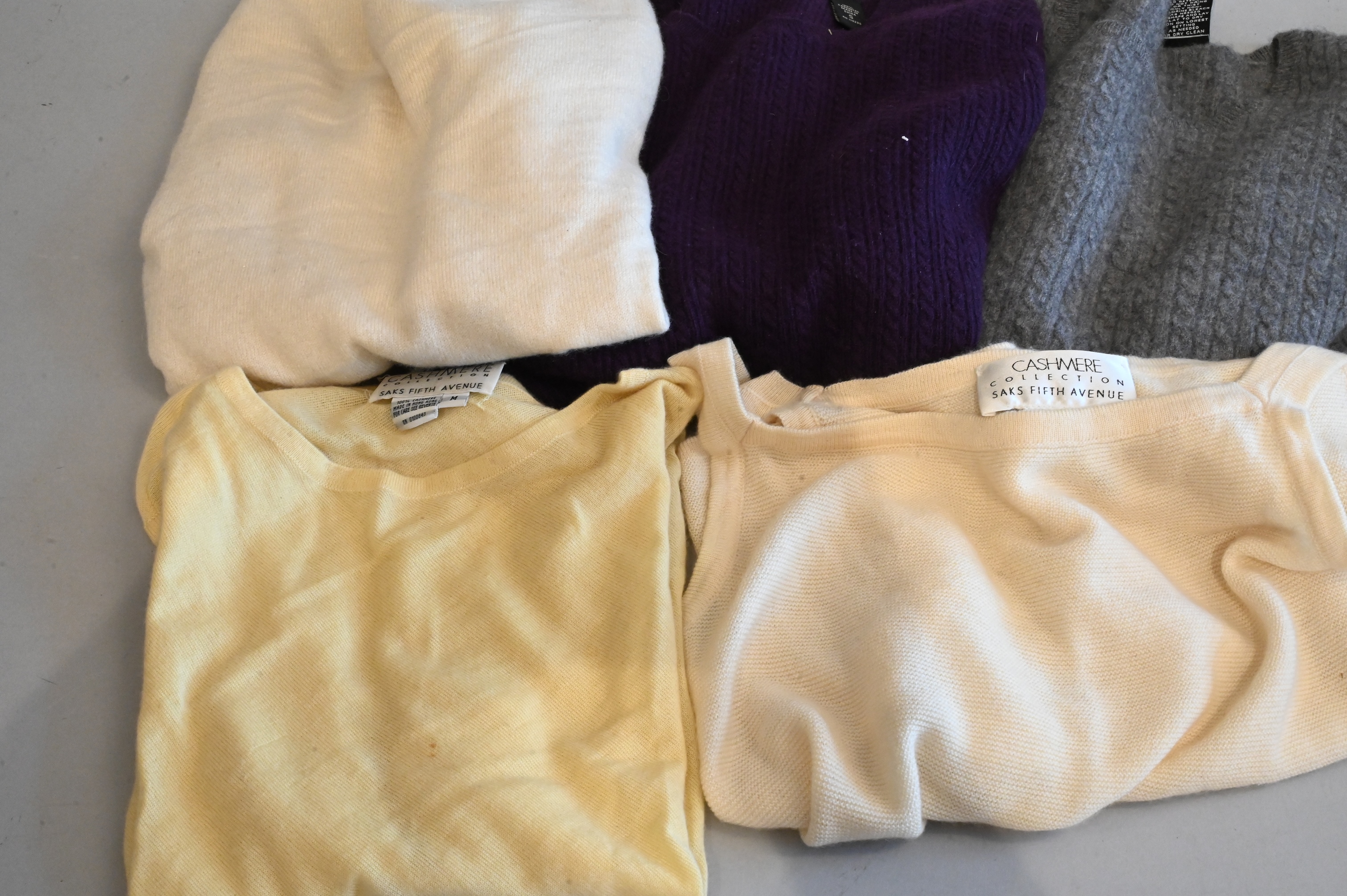 to include yellow cashmere collection size medium, two cream cashmere collections size small, Lord and Taylor in purple size small, Saks Fifth Avenue in grey size extra small