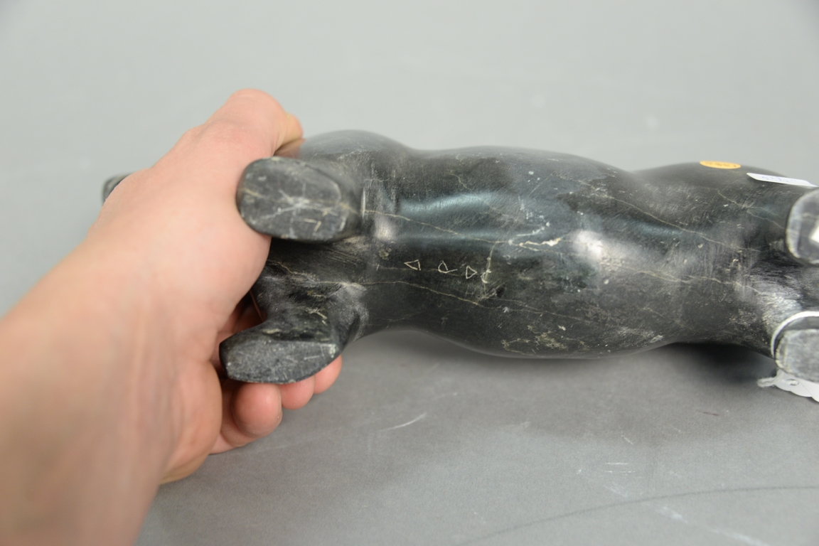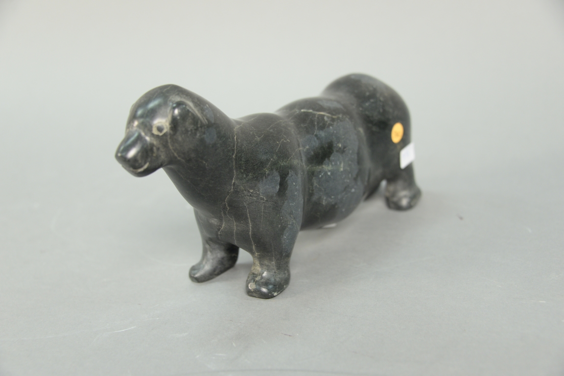 Lot 379: Inuit Eskimo carving possibly Johnny Kopoanuak Mamgark, Eskimo Point green serpentine Bear. ht. 5 1/2in.