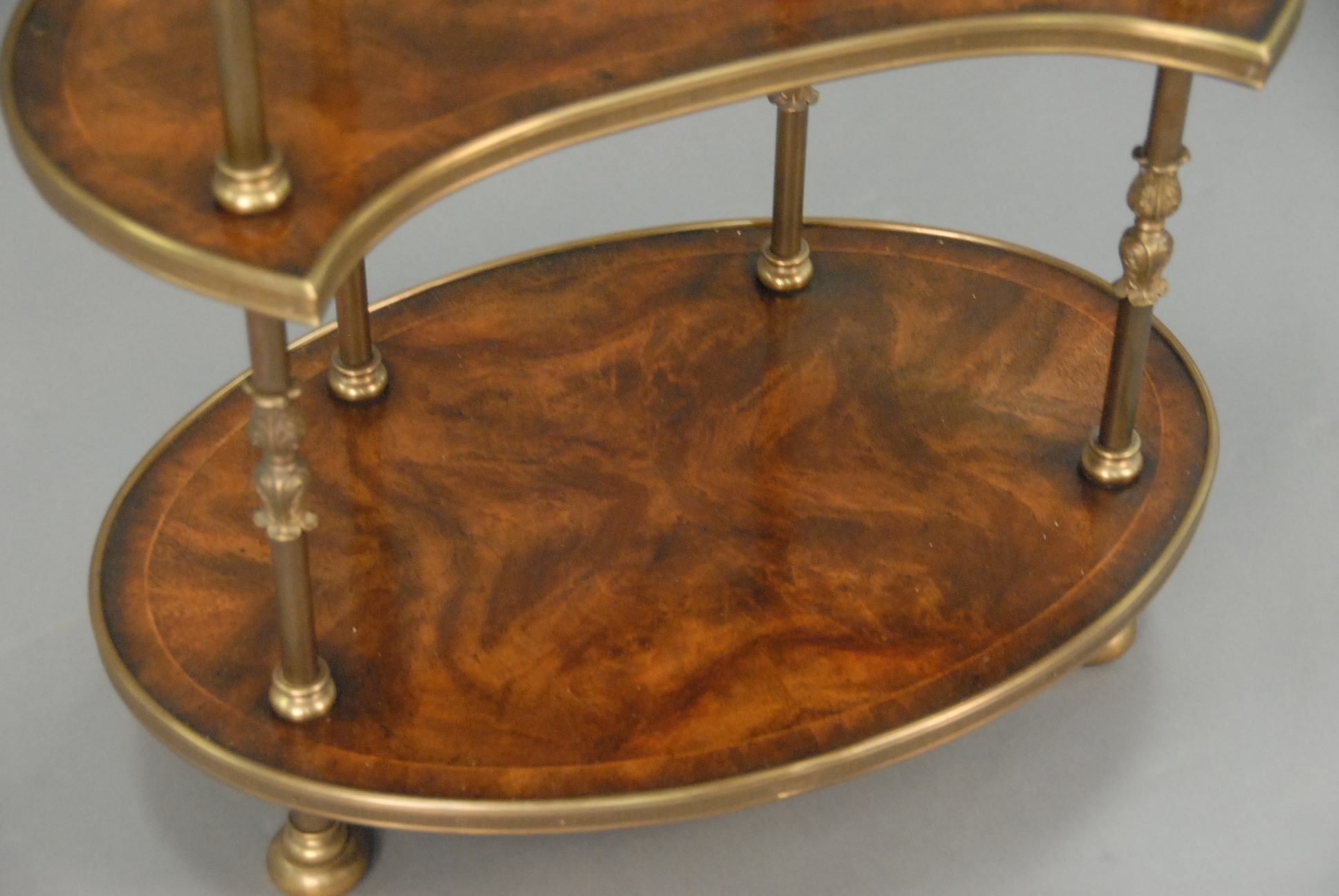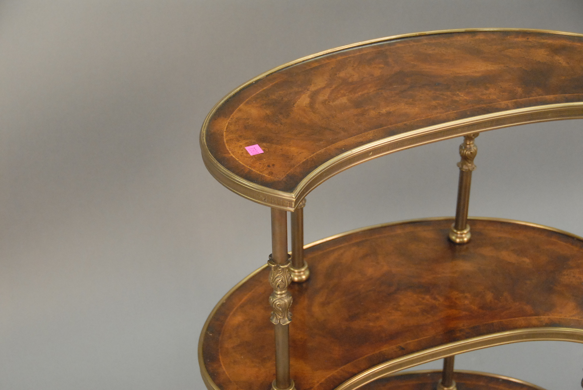 Lot 379: Mahogany three tier kidney form stand with brass supports and banding, ht. 33in. lg. 24 1/2in.