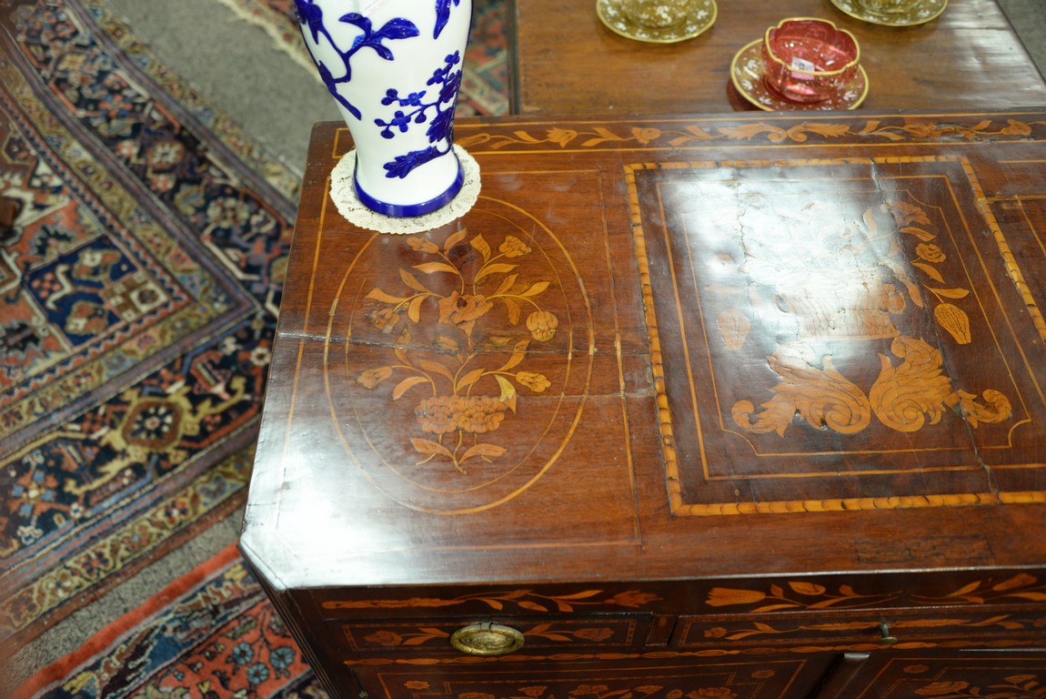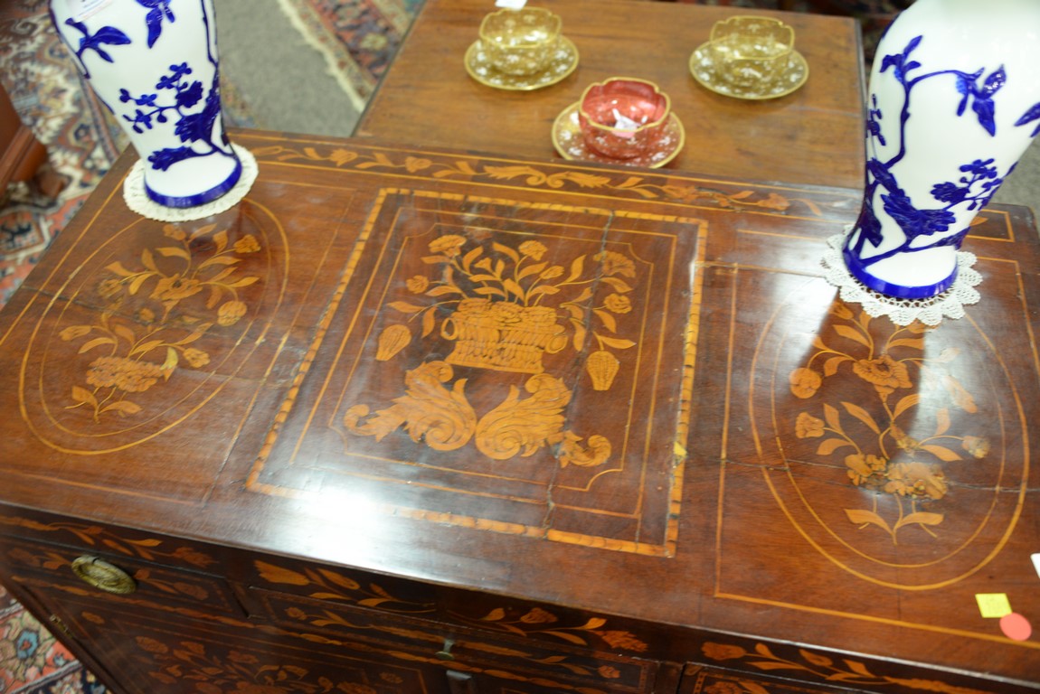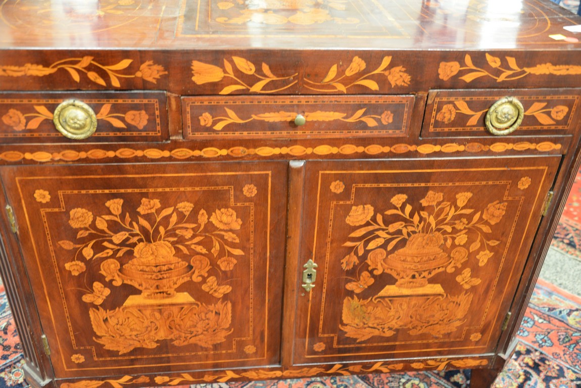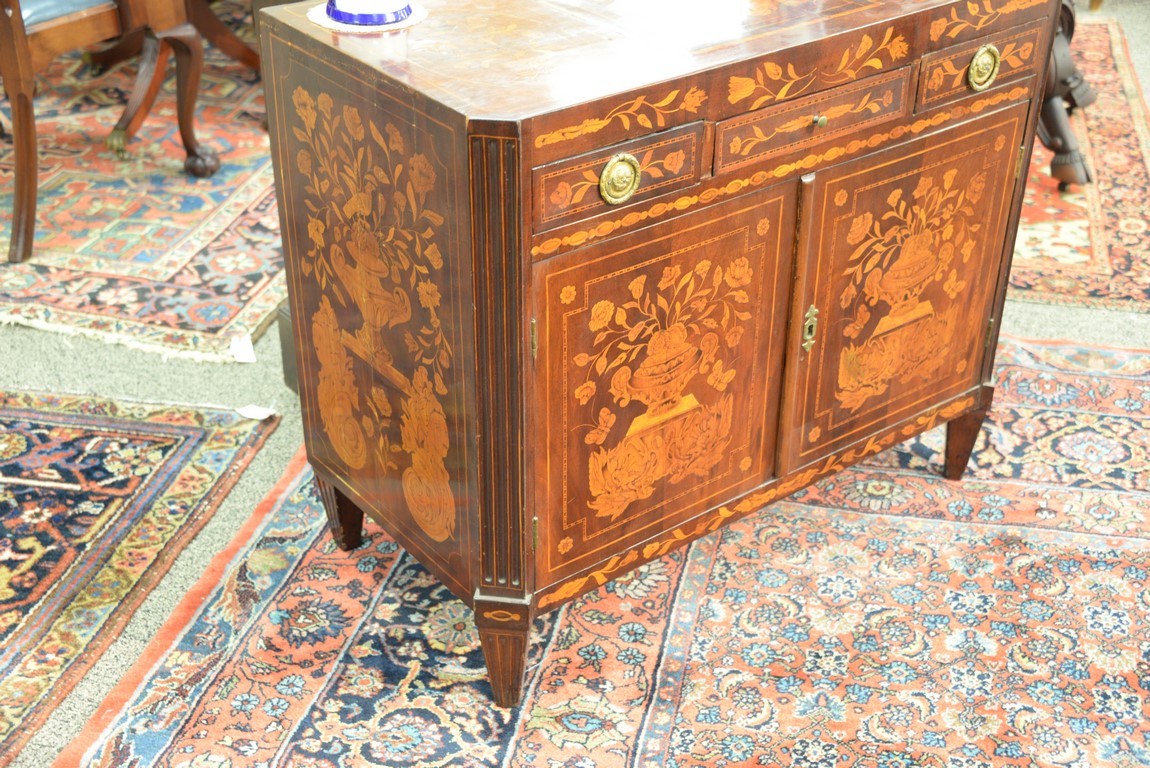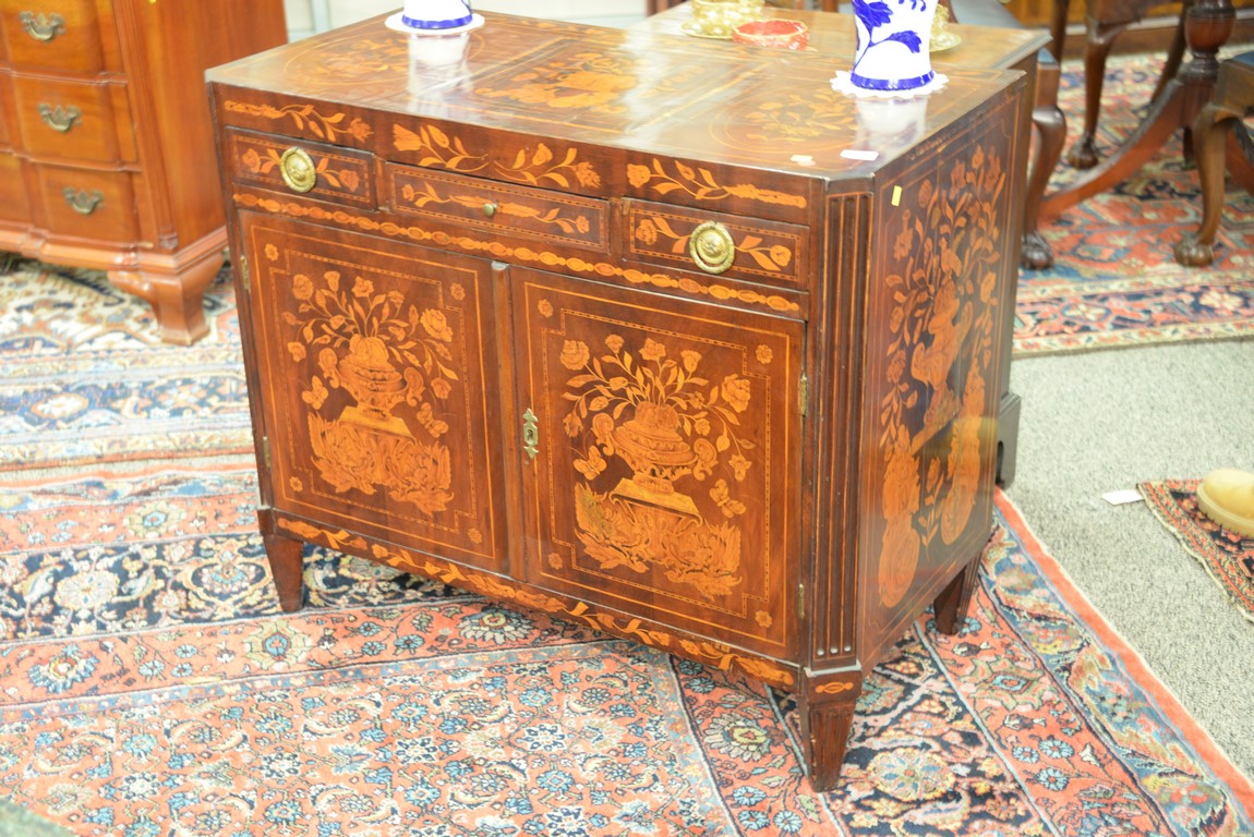 Marquetry inlaid server having three marquetry inlaid top panels over three drawers over two doors, front and sides marquetry inlaid, 19th century. ht. 33 in. wd. 38 1/2 in. dp. 20 in.