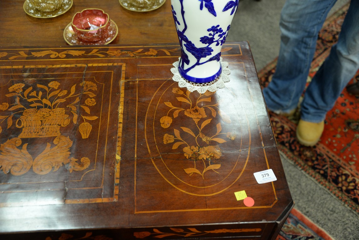Lot 379: Marquetry inlaid server having three marquetry inlaid top panels over three drawers over two doors, front and sides marquetry inlaid…