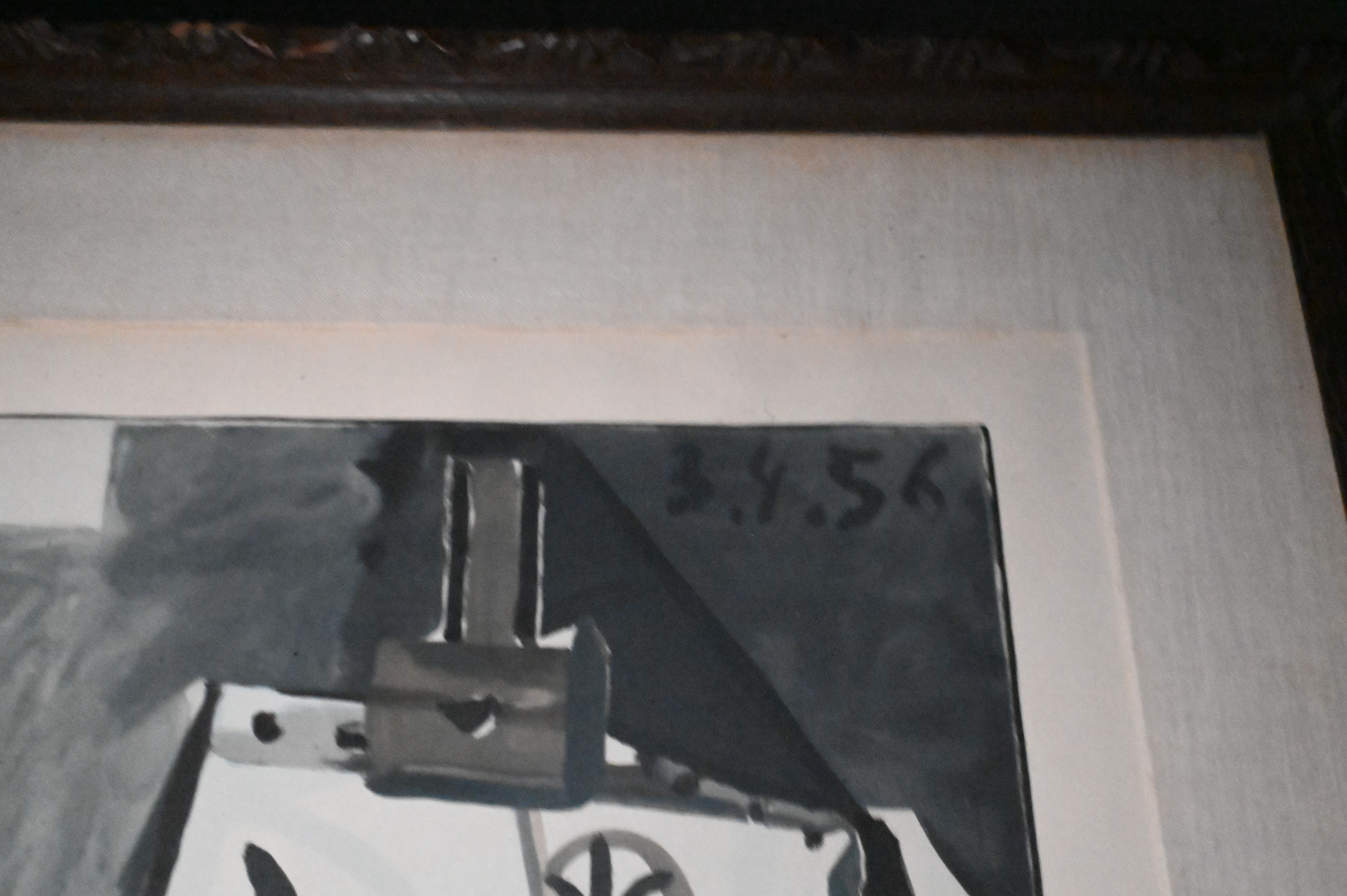 depicting Jacqueline at the easel in Picasso’s distinct Cubist-derived style, executed in tones of slate blue, teal, black, and white, the composition captures the artist’s mid-century exploration of the artist-and-model theme, with simplified geometric forms and bold contour lines conveying psychological presence and spatial depth