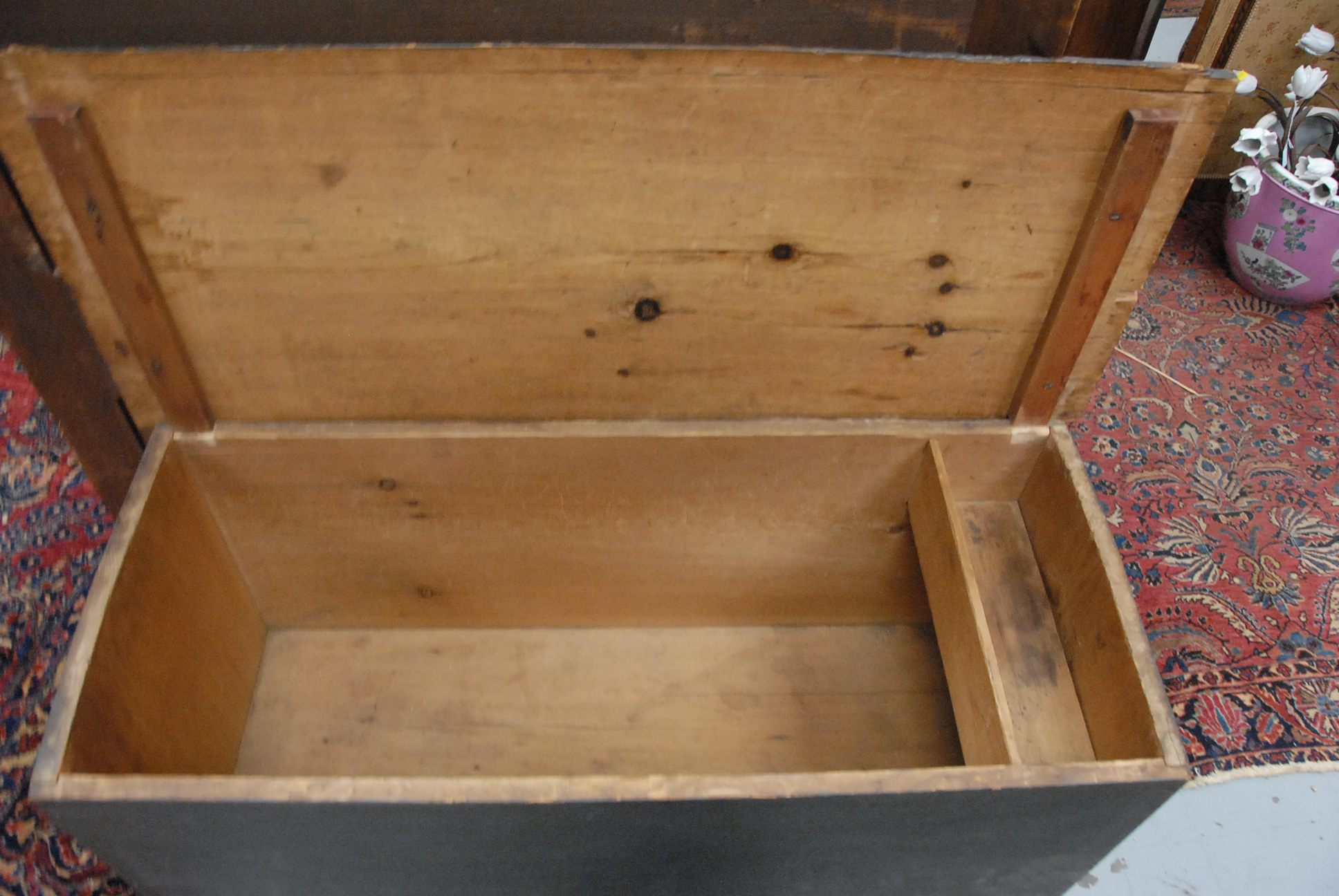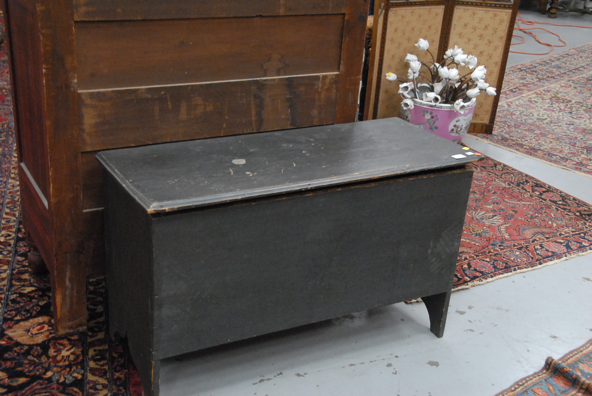 Primitive blanket chest with lift top on bootjack ends in old dark grey paint top is loose. ht. 23in. wd. 41 1/2in. dp. 17in.