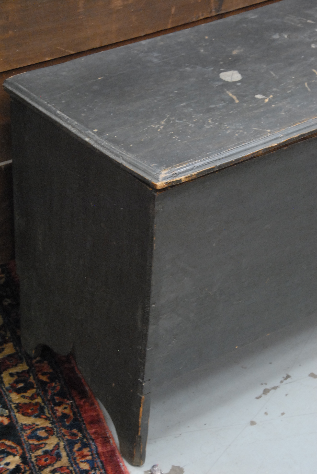 Lot 379: Primitive blanket chest with lift top on bootjack ends in old dark grey paint top is loose. ht. 23in. wd. 41 1/2in. dp. 17in.