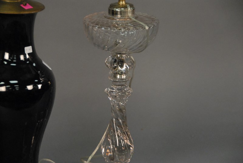 Three lamps to include Bacarat candlestick oil lamp ht. 17in. black vase lamp, and green vase lamp.