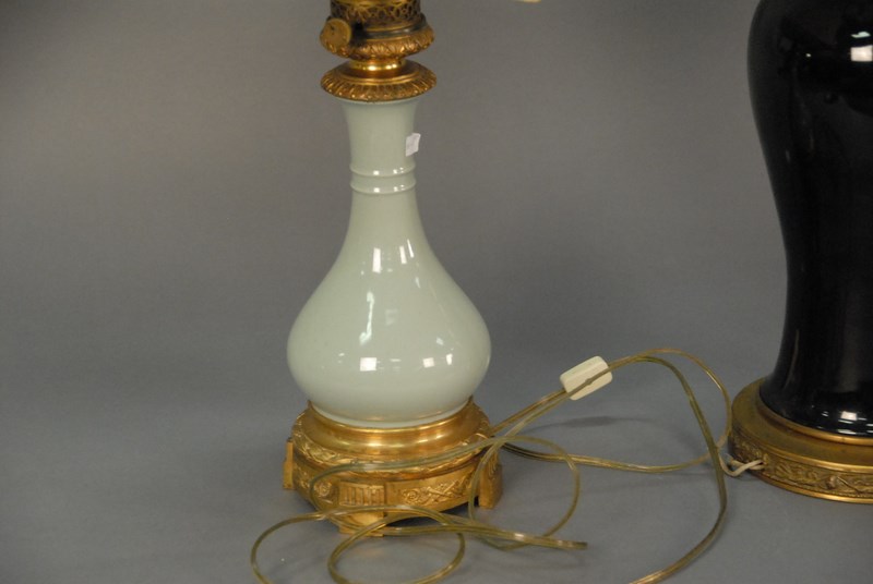 Lot 379: Three lamps to include Bacarat candlestick oil lamp ht. 17in. black vase lamp, and green vase lamp.