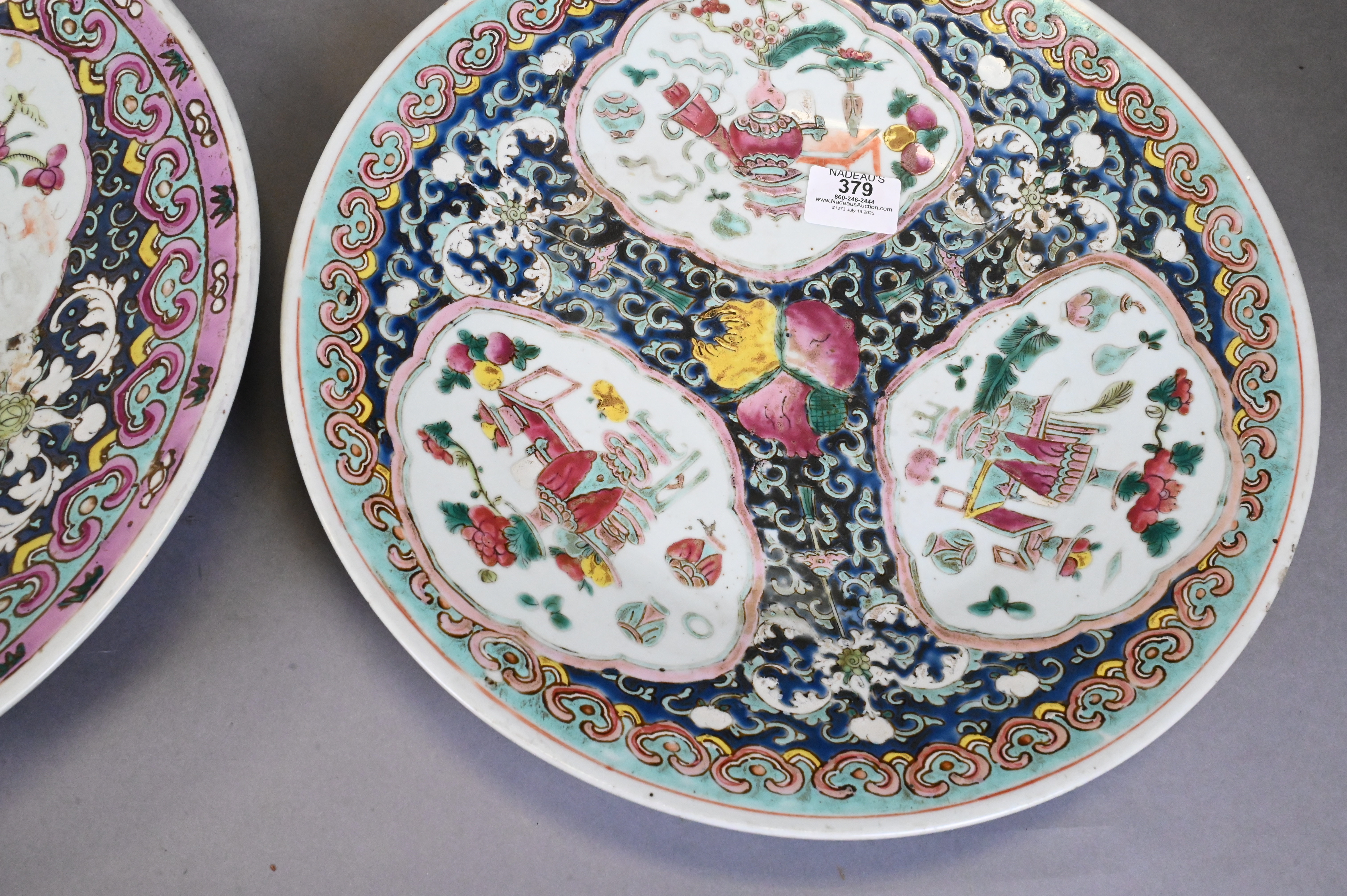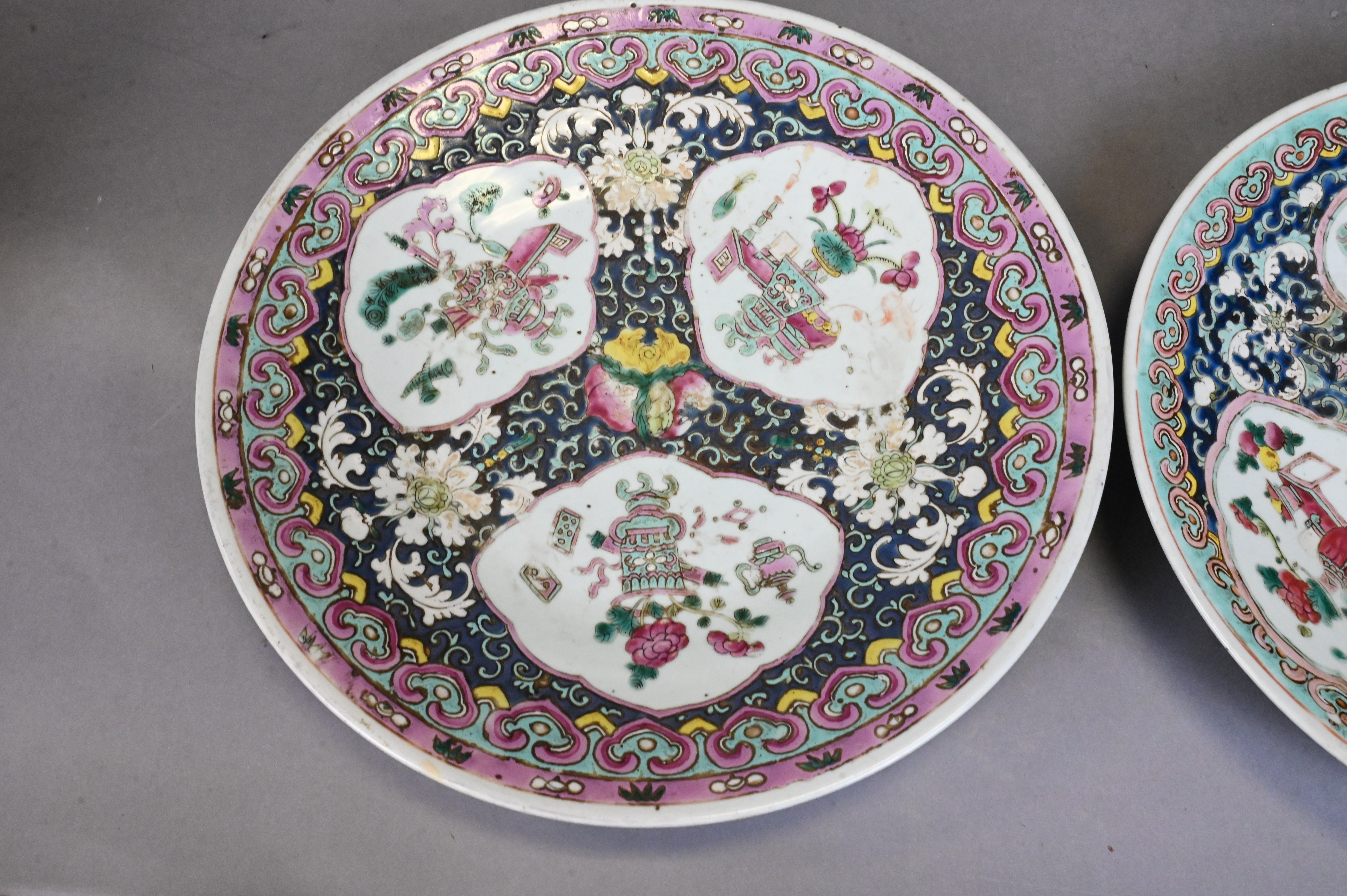 to include one in purple, the other turquoise and navy, both having cartouches featuring urn and flower motif