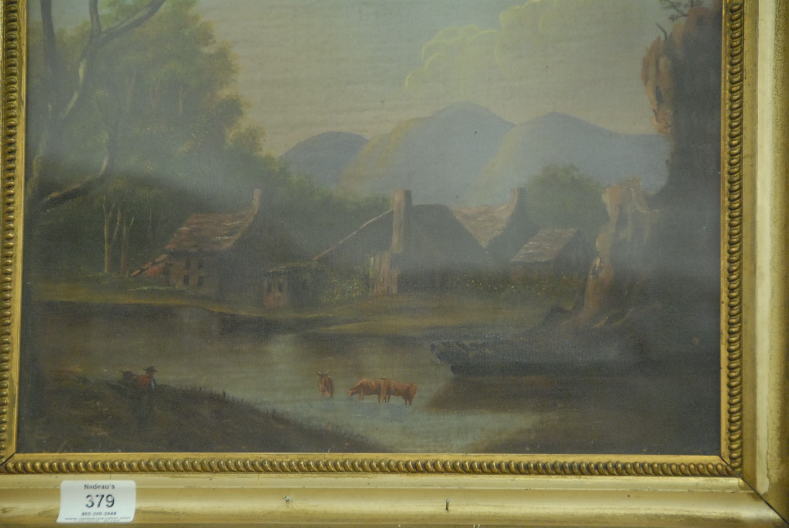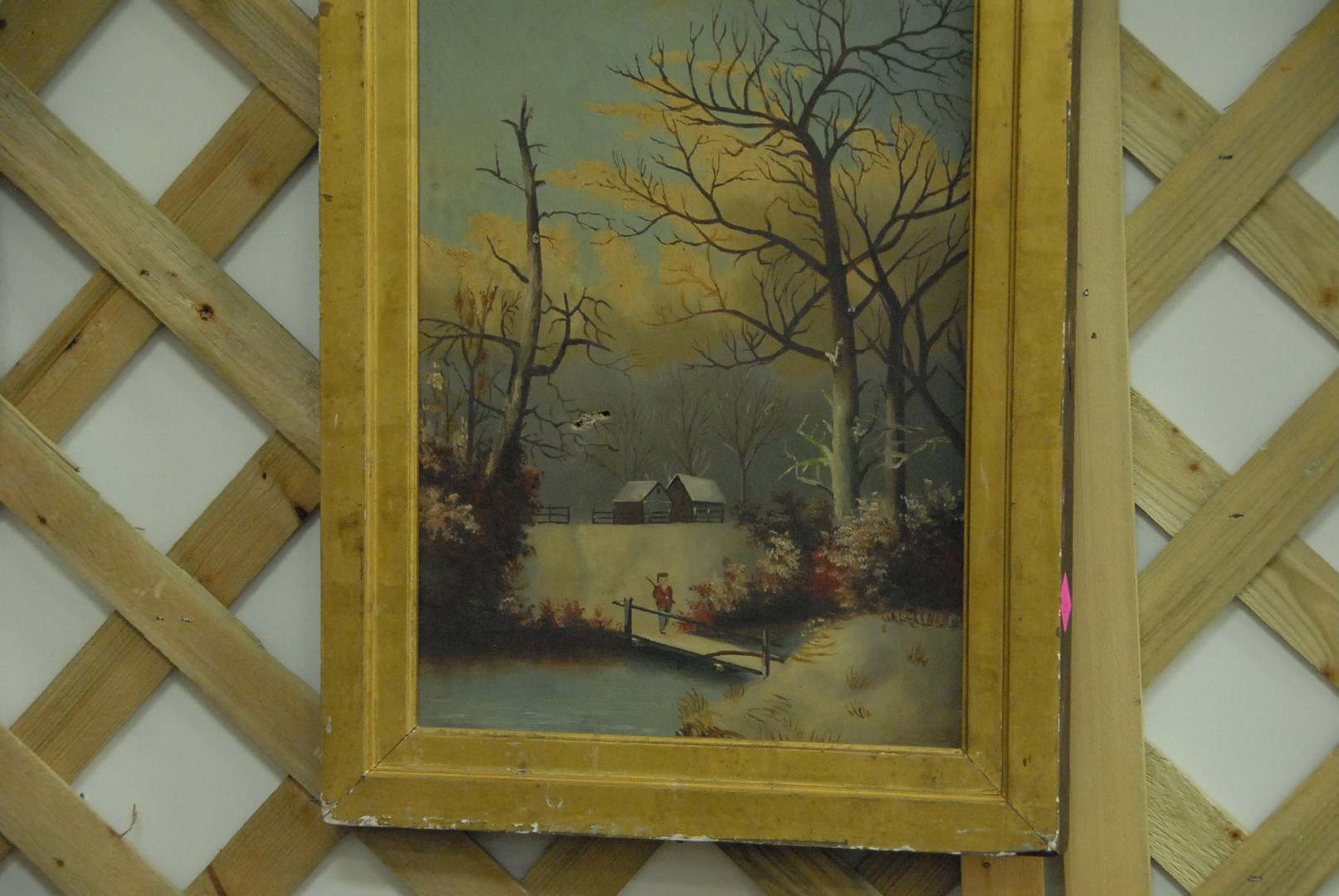 Lot 379: Two oil on canvas 19th century primitive paintings including a summer landscape and a winter landscape, both unsigned. 12 x 14
