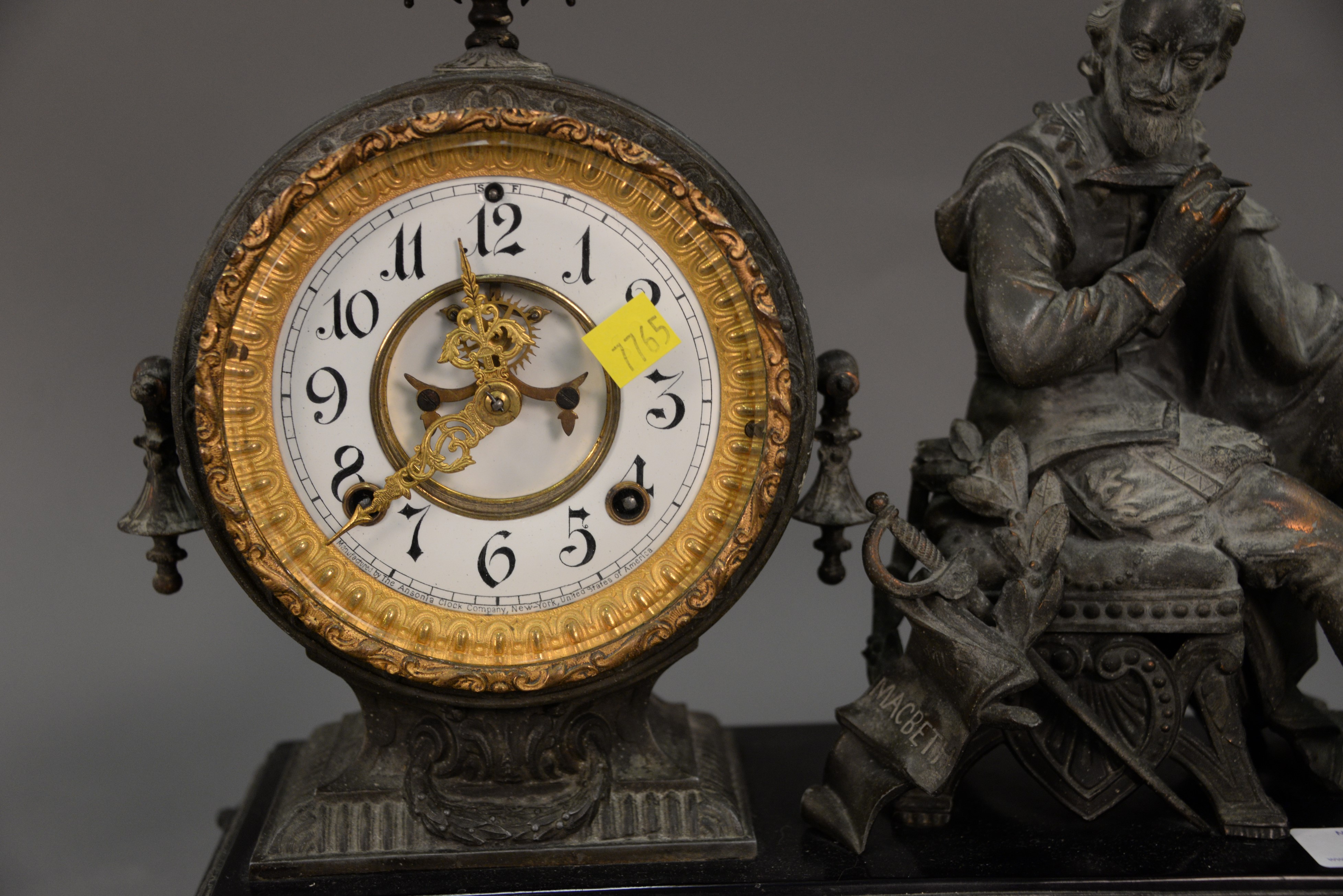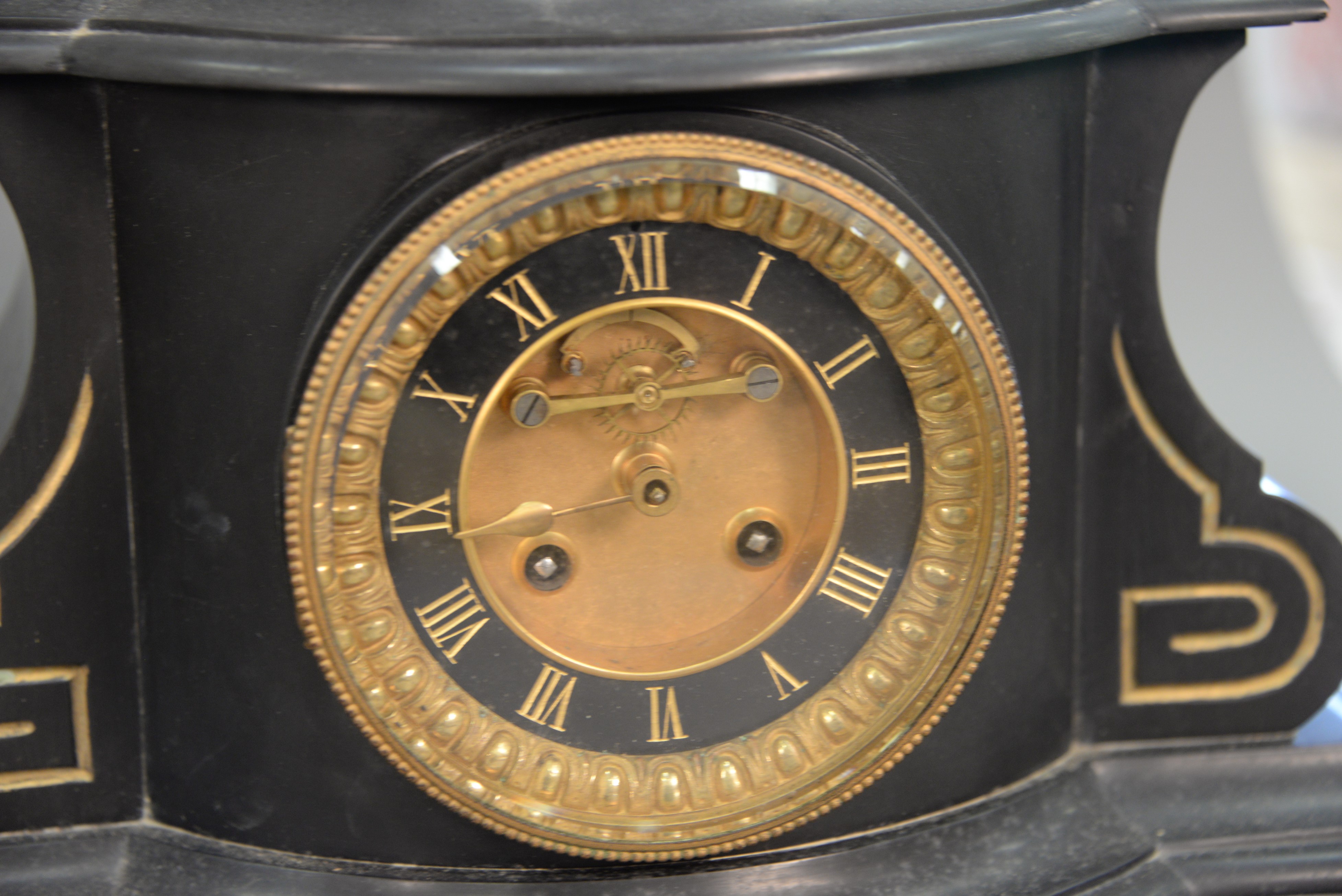 Lot 379: Two Victorian mantle clocks including a black slate mantle clock and a figural mantle clock.