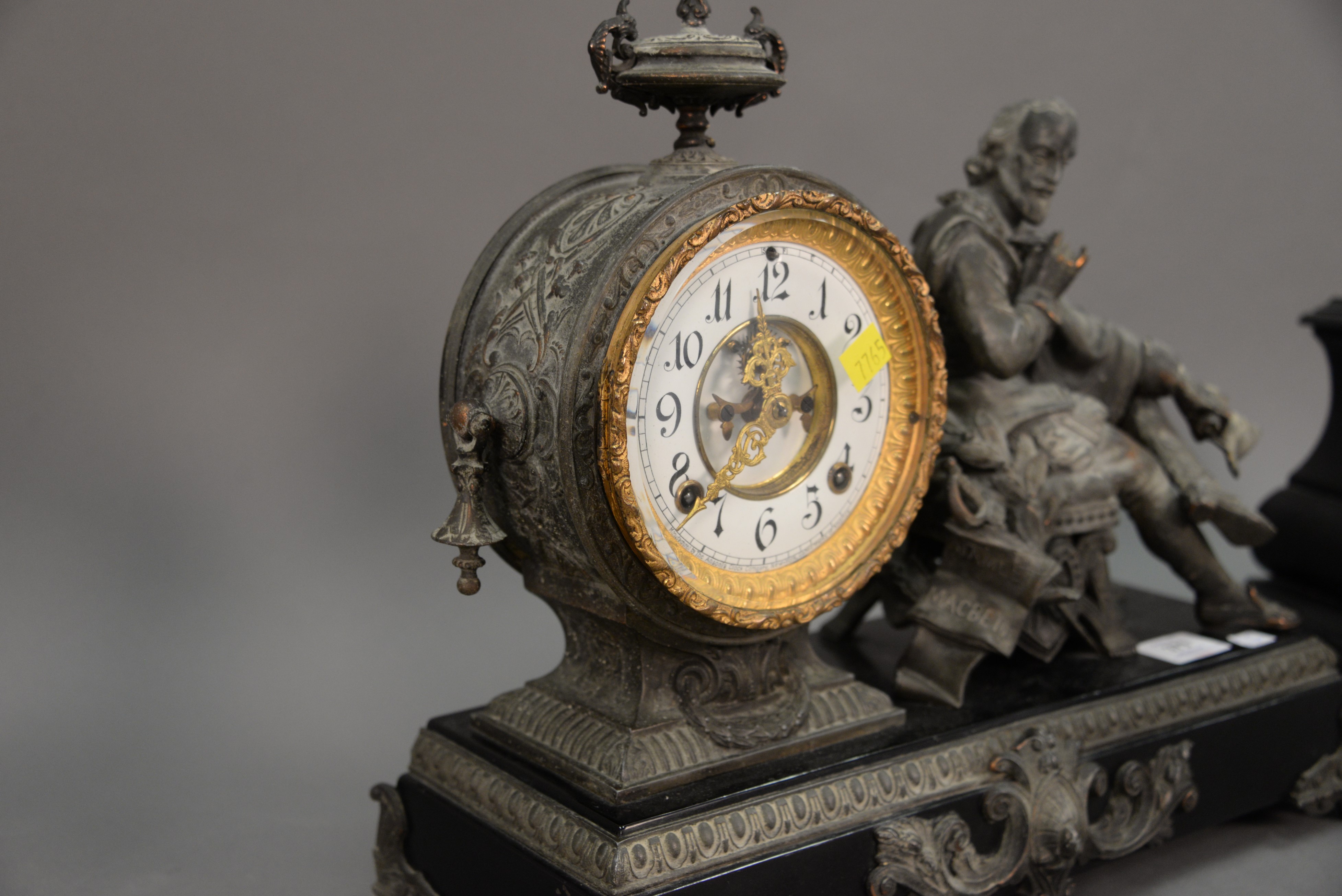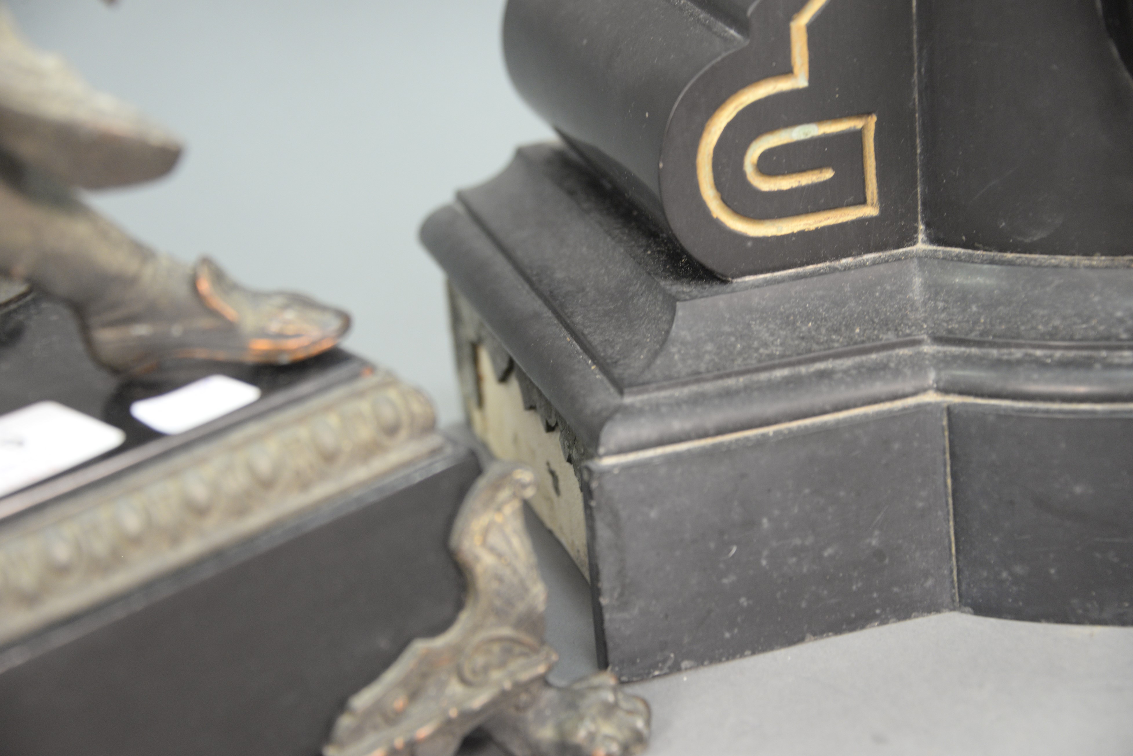 Two Victorian mantle clocks including a black slate mantle clock and a figural mantle clock.