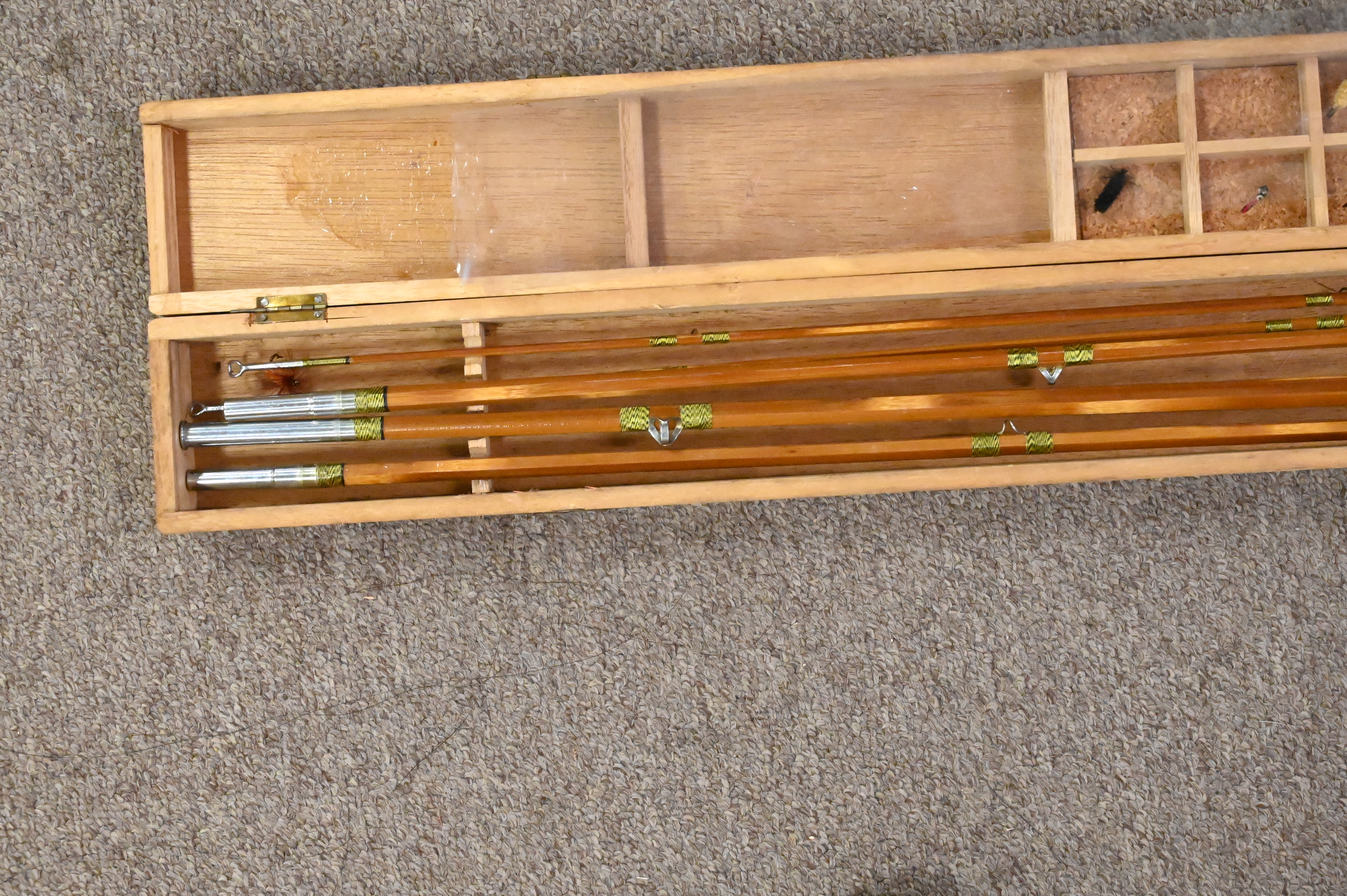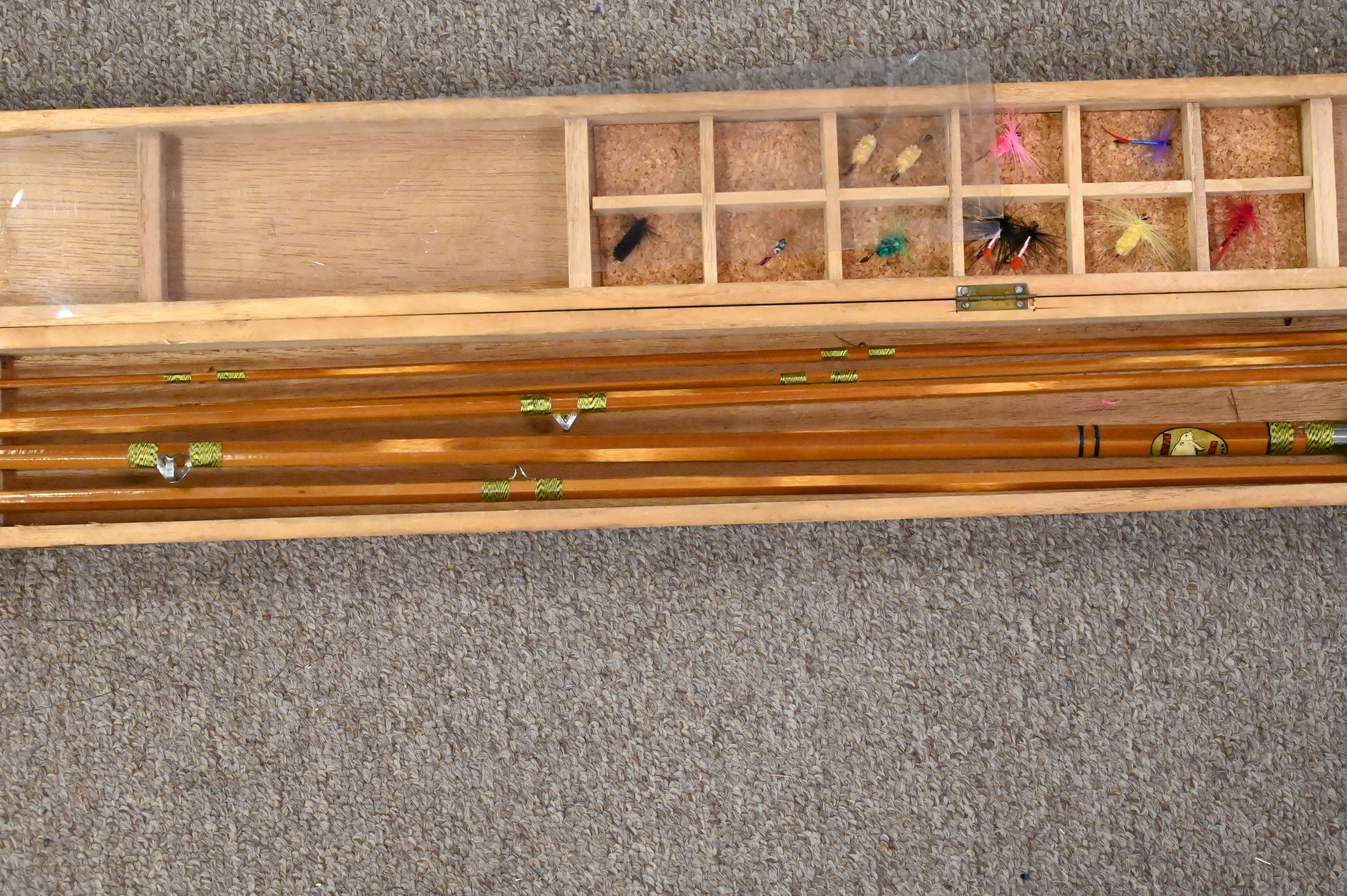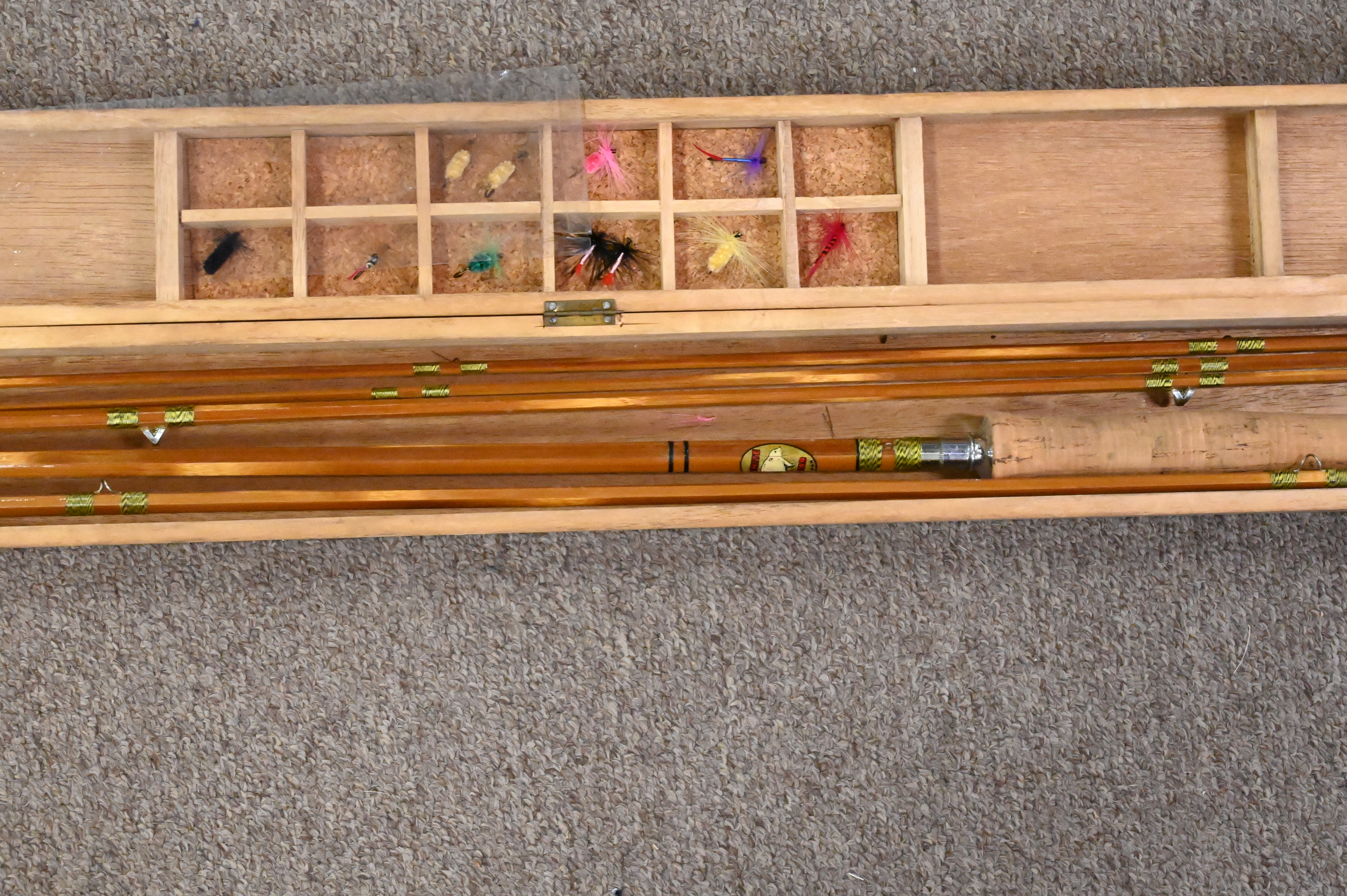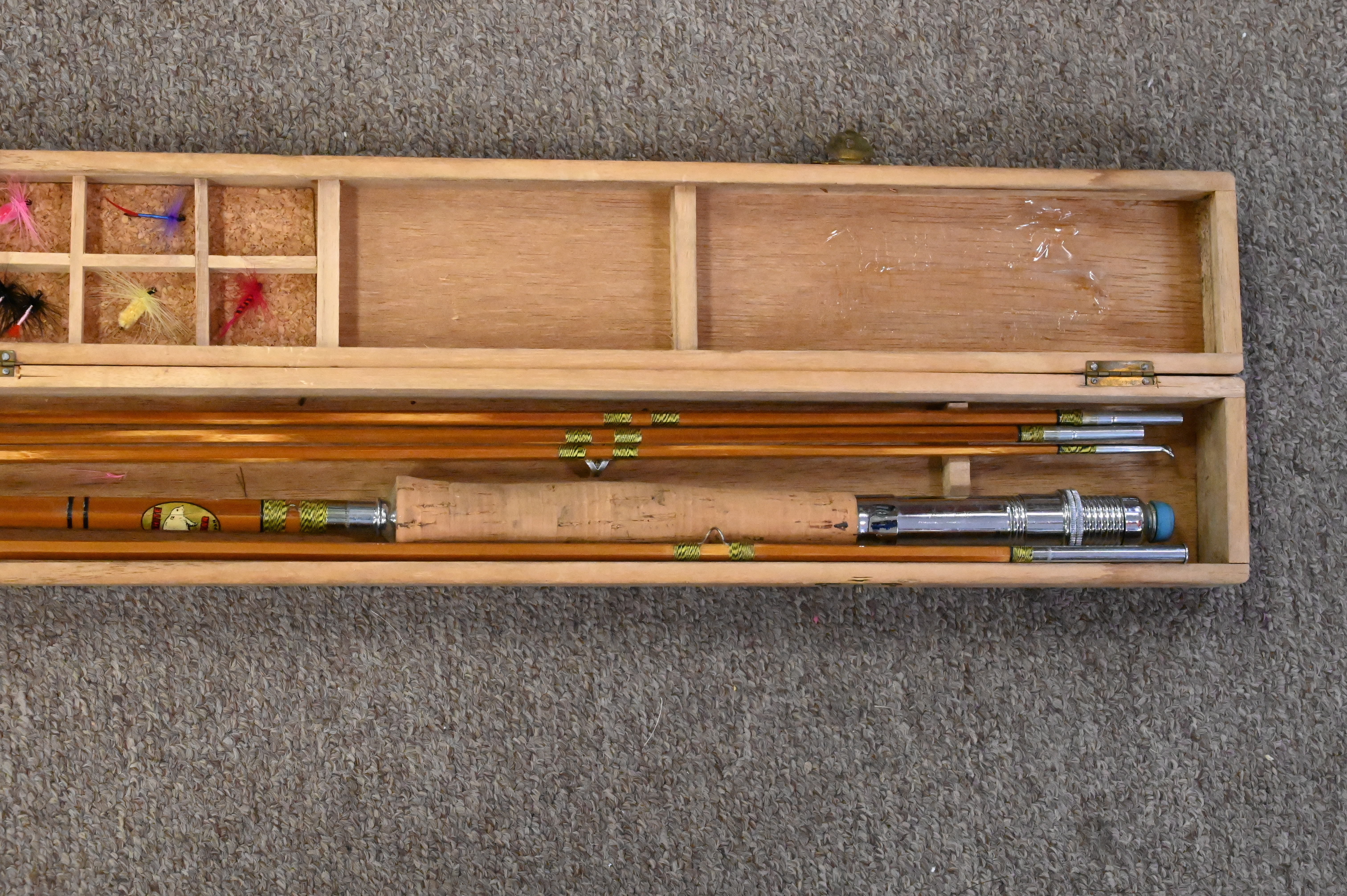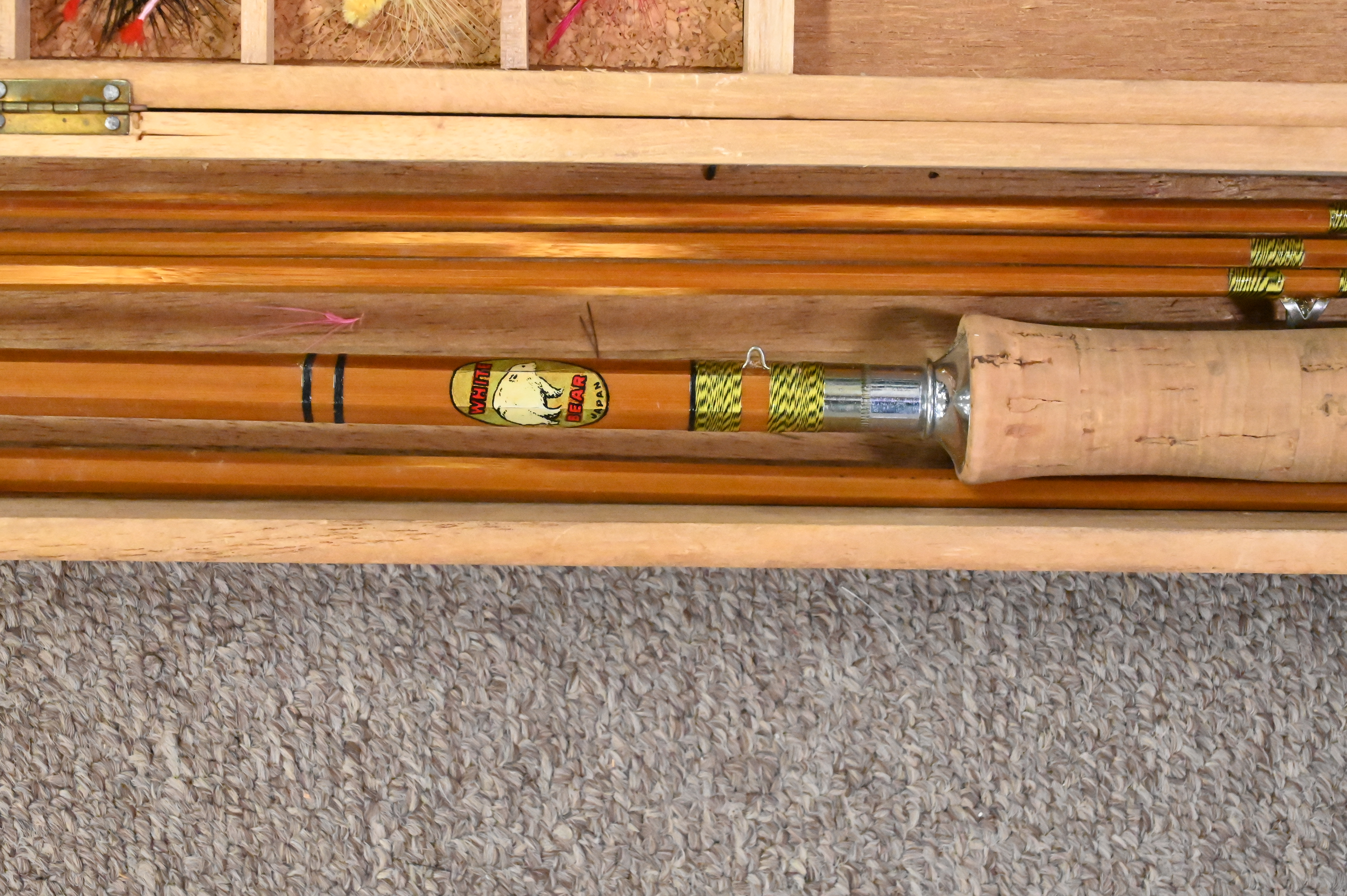 White Bear Japanese Four Part Bamboo Fly Rod, two tips in box with flies