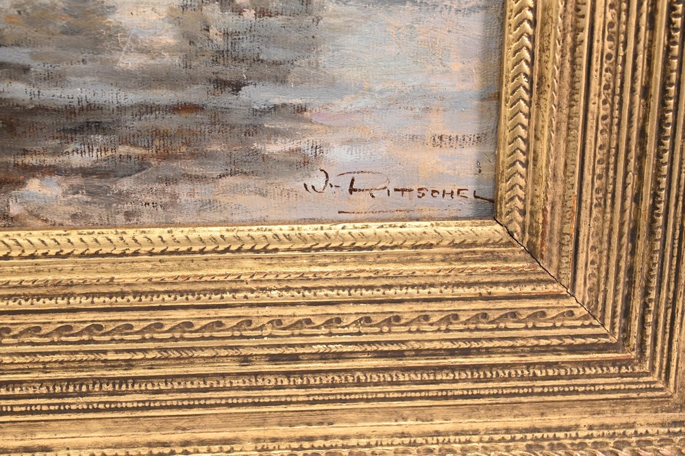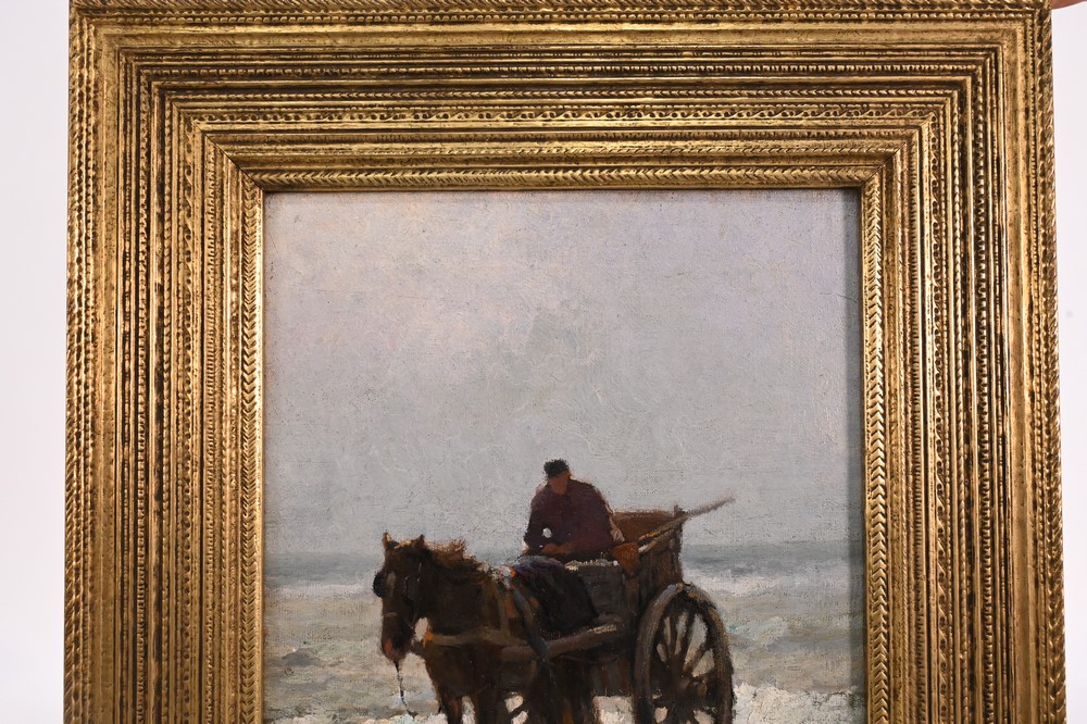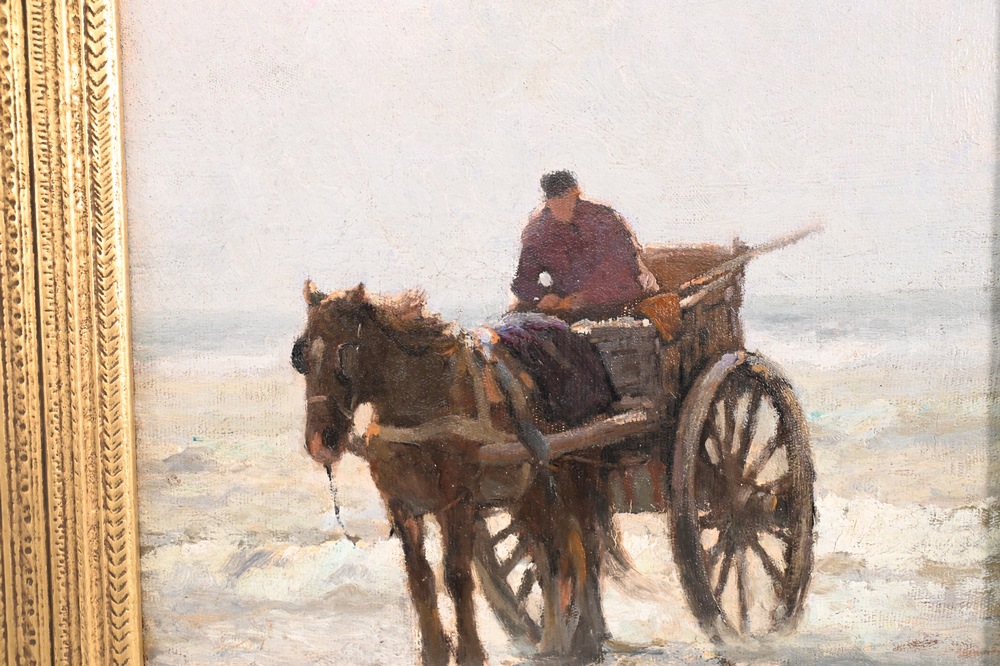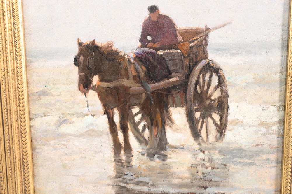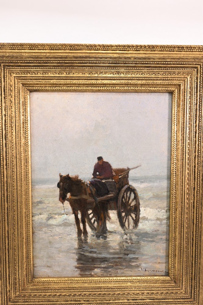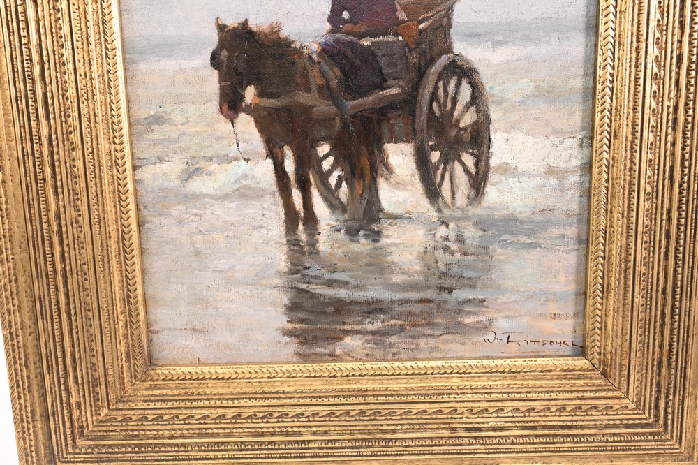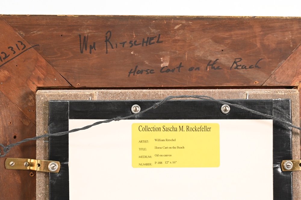 William Frederick Ritschel (1864 – 1949), Horse Cart on the Beach, oil on canvas, signed lower right W. Ritschel, in Newcomb Macklin gilt frame, relined, 16″ x 12″. Provenance: Mary Mullowney Sotheby’s Arcade sale 1318, lot 49.