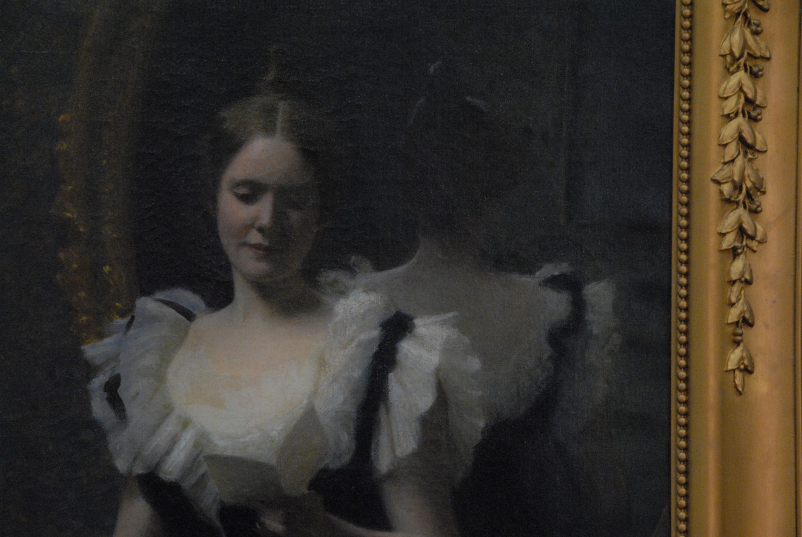 William Worcester Churchill 1858 – 1926 WOMAN FULL LENGTH WITH REFLECTION OF HER BACK IN AN OVAL MIRROR READING A NOTE oil on canvas marked on reverse Return to W.W. Churchill 23 Irvington Street Boston. Provenance: Governor Henry Roberts Edward Roberts 1110 Prospect Ave Hartford to present owner.