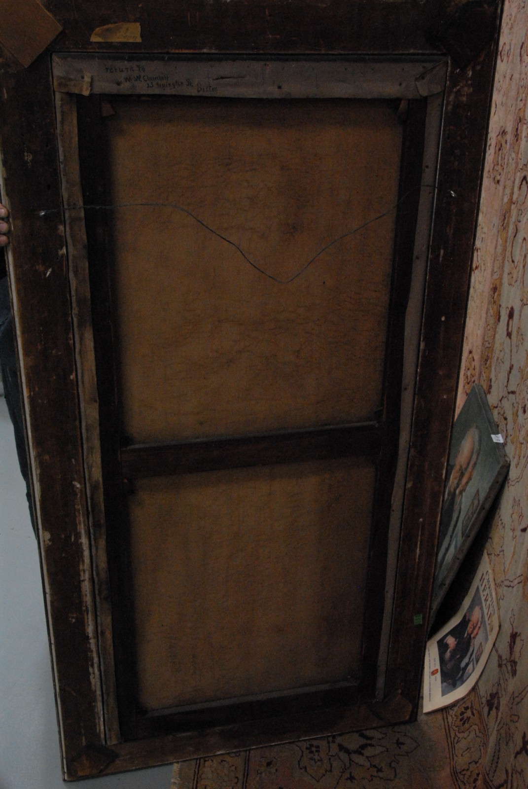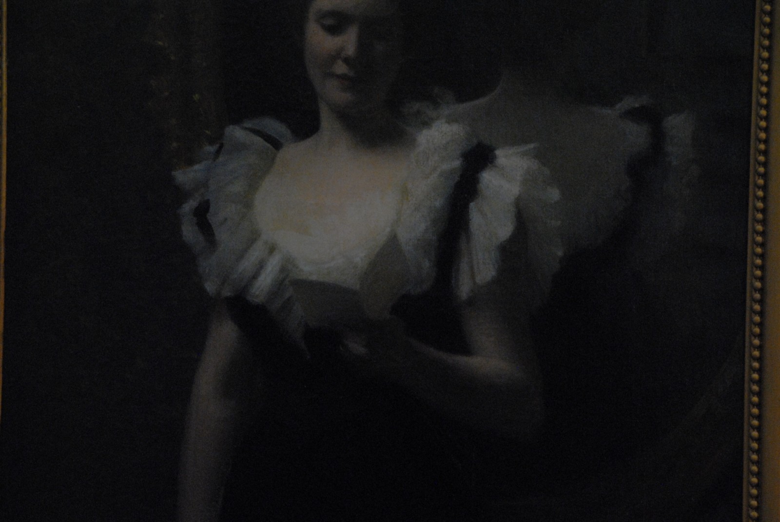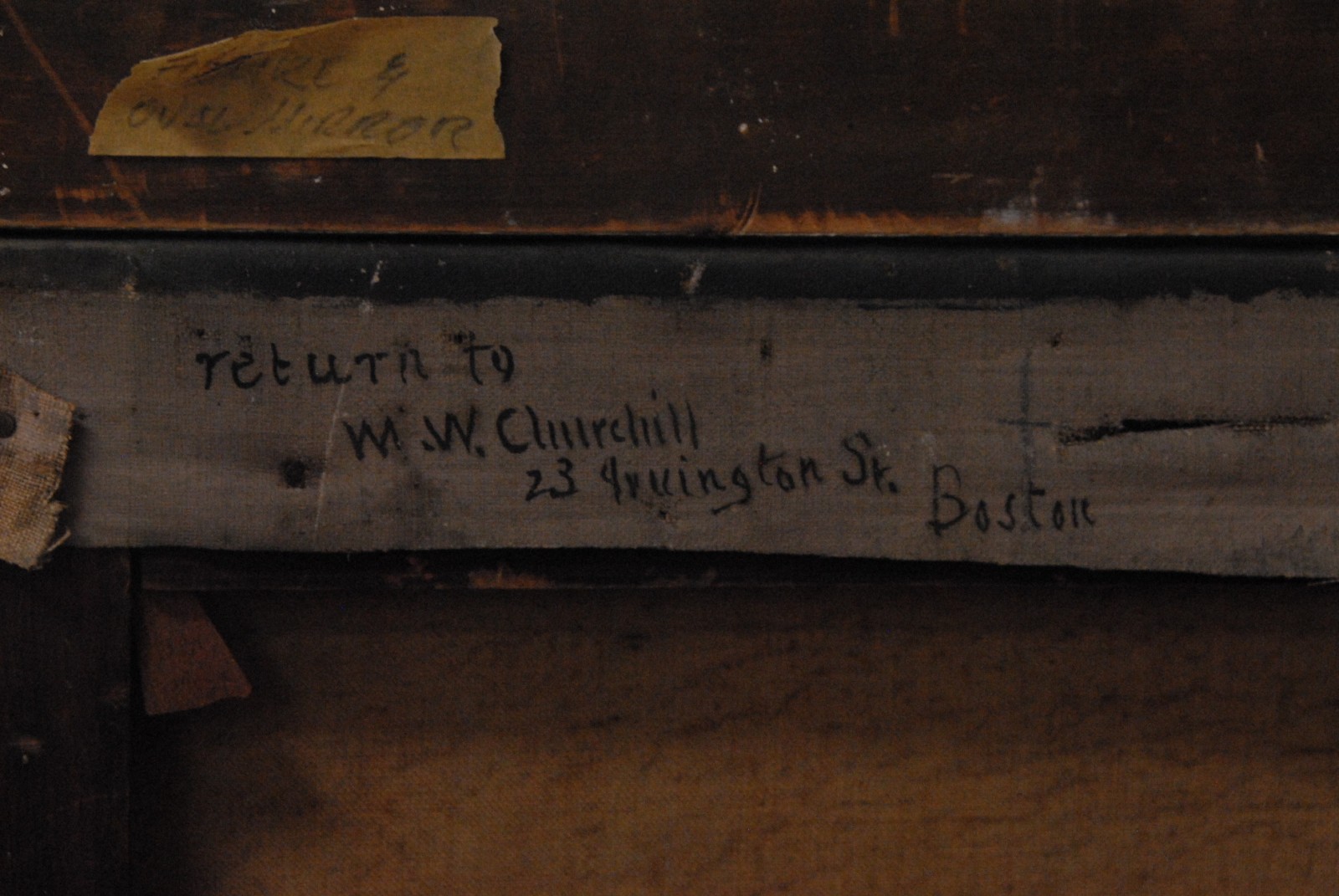 William Worcester Churchill 1858 – 1926 WOMAN FULL LENGTH WITH REFLECTION OF HER BACK IN AN OVAL MIRROR READING A NOTE oil on canvas marked on reverse Return to W.W. Churchill 23 Irvington Street Boston. Provenance: Governor Henry Roberts Edward Roberts 1110 Prospect Ave Hartford to present owner.