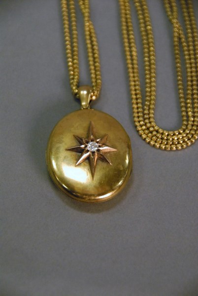 Lot 38: 14K gold oval locket with rose gold star set with diamond, approximately .50 cts along with a 10K gold large slide chain. total weight 54.9 grams lg. 31in.