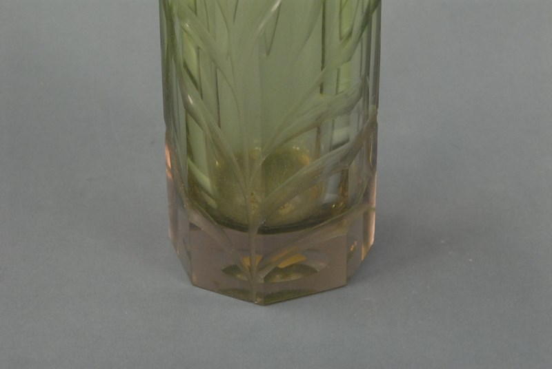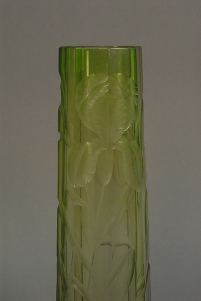 Art glass vase, green to clear with ground flowers. ht. 16in.