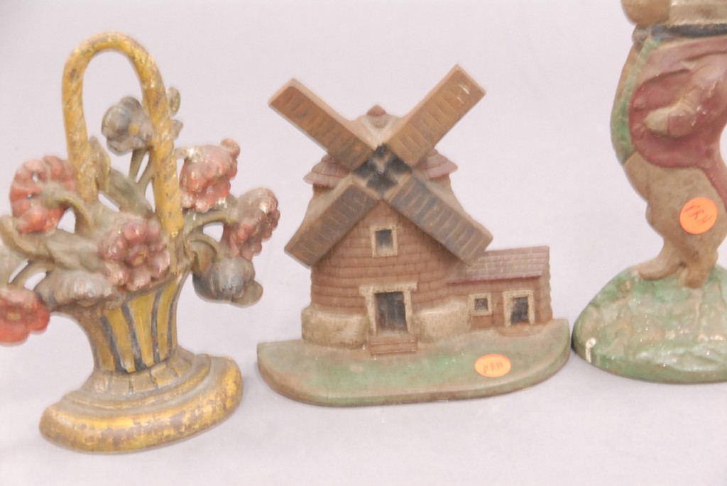 Box lot to include three door stops rabbit, windmill and basket of flowers along with bronze chicken and chicks painted on marble base.