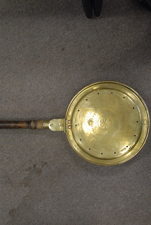 Early brass bed warmer with handle.