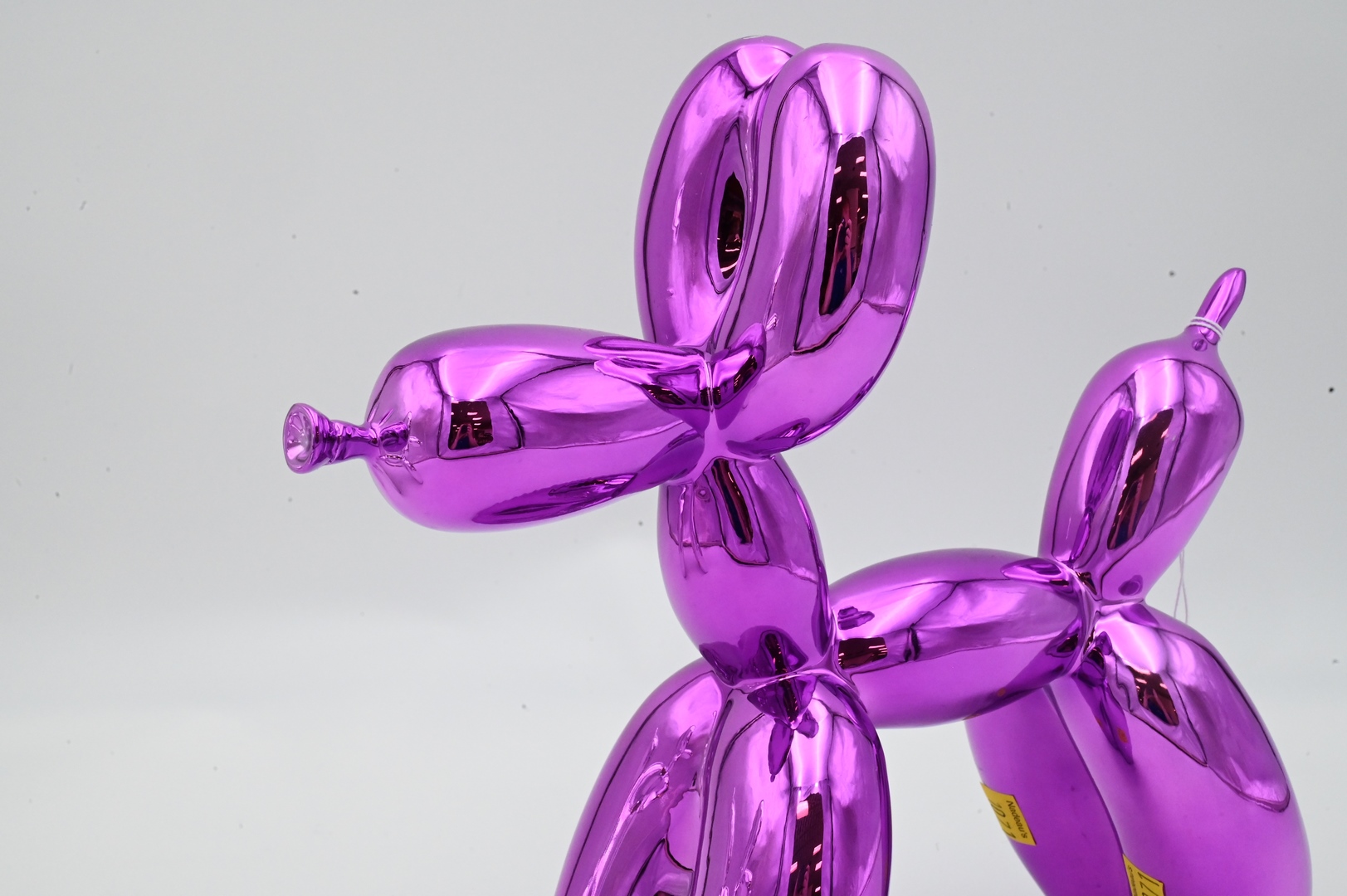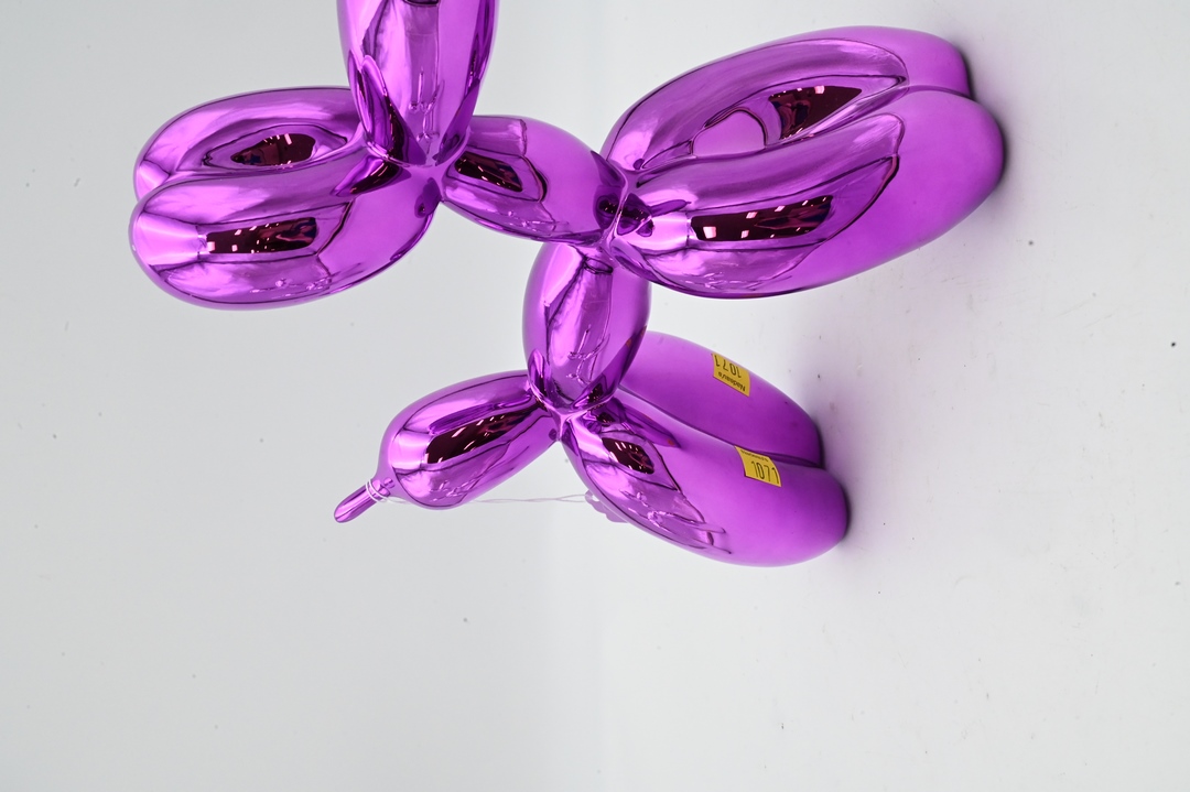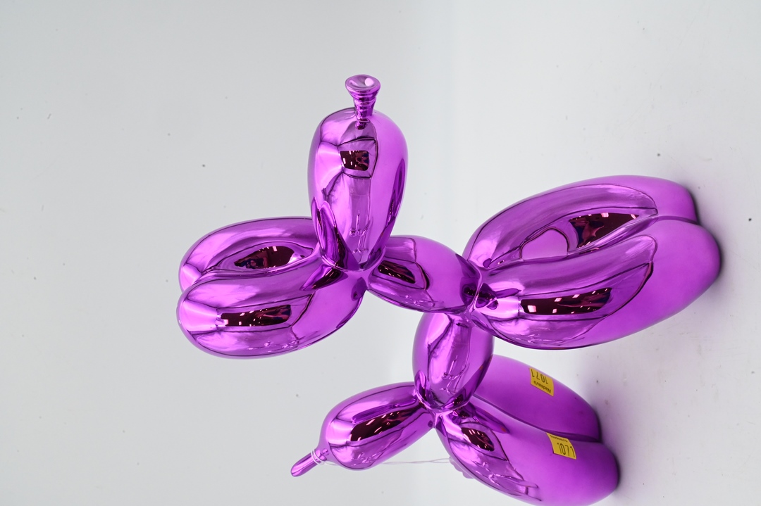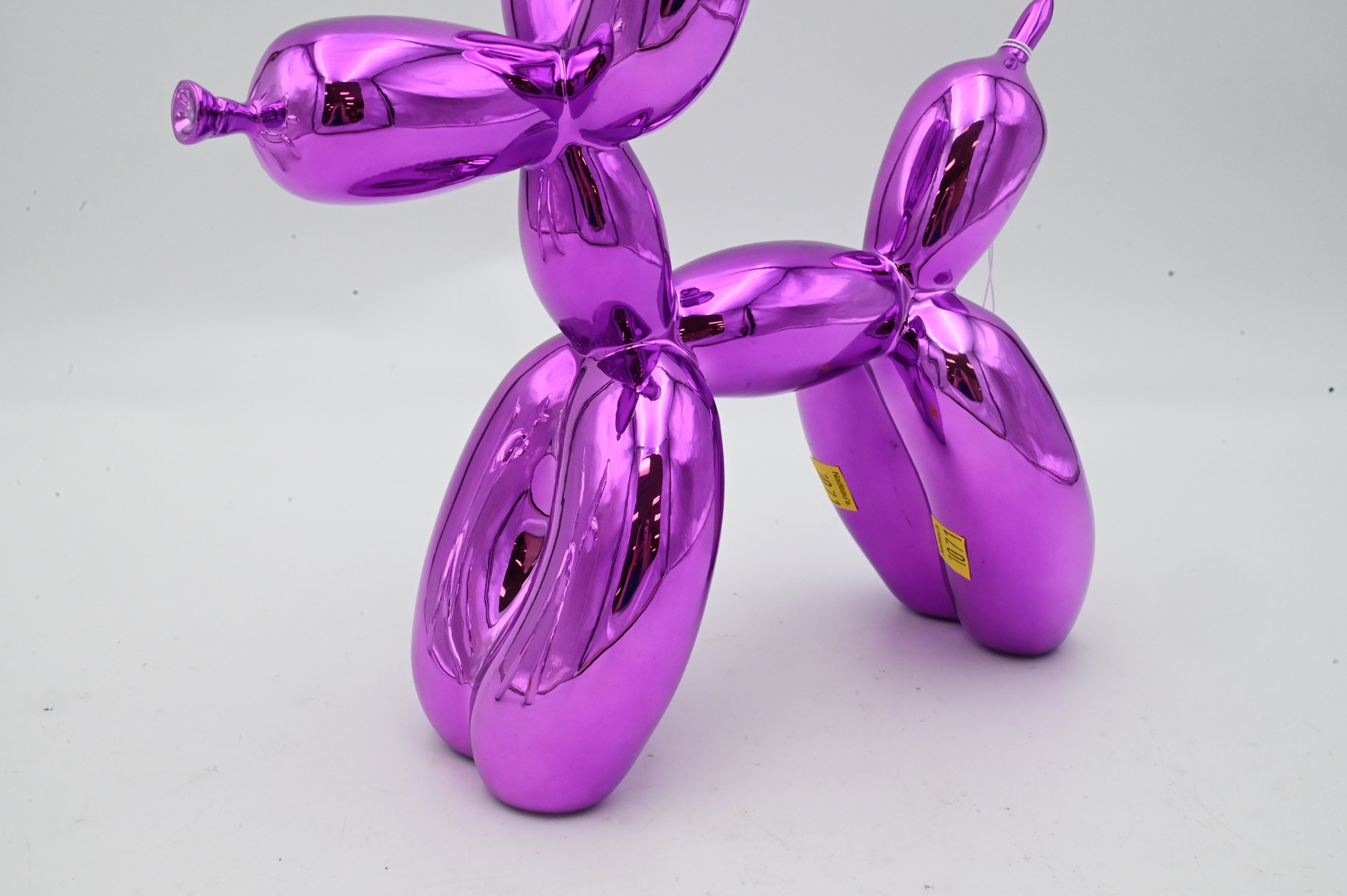 Editions Studio Purple Balloon Dog, cold cast resin, numbered 239/999, along with certificate of authenticity and original box, height 11 1/2 inches.