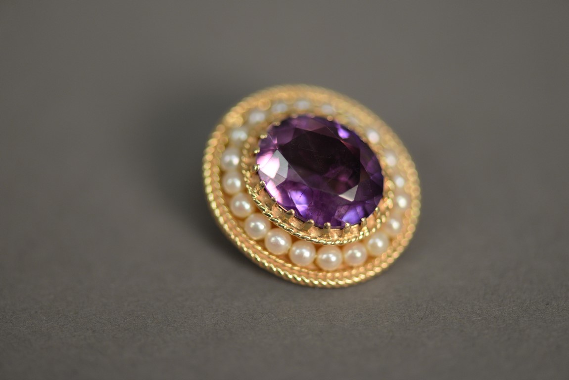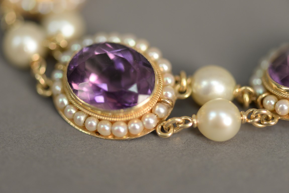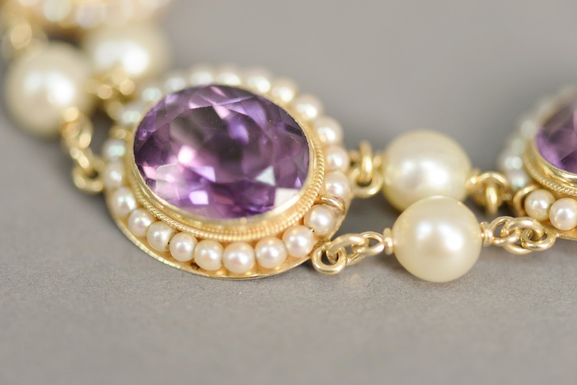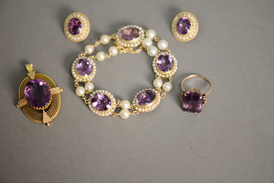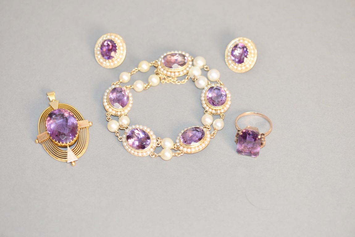 Lot 38: Five piece lot to include 14K gold amethyst and pearl bracelet with matching earrings along with gold and amethyst pendant and a ring.
