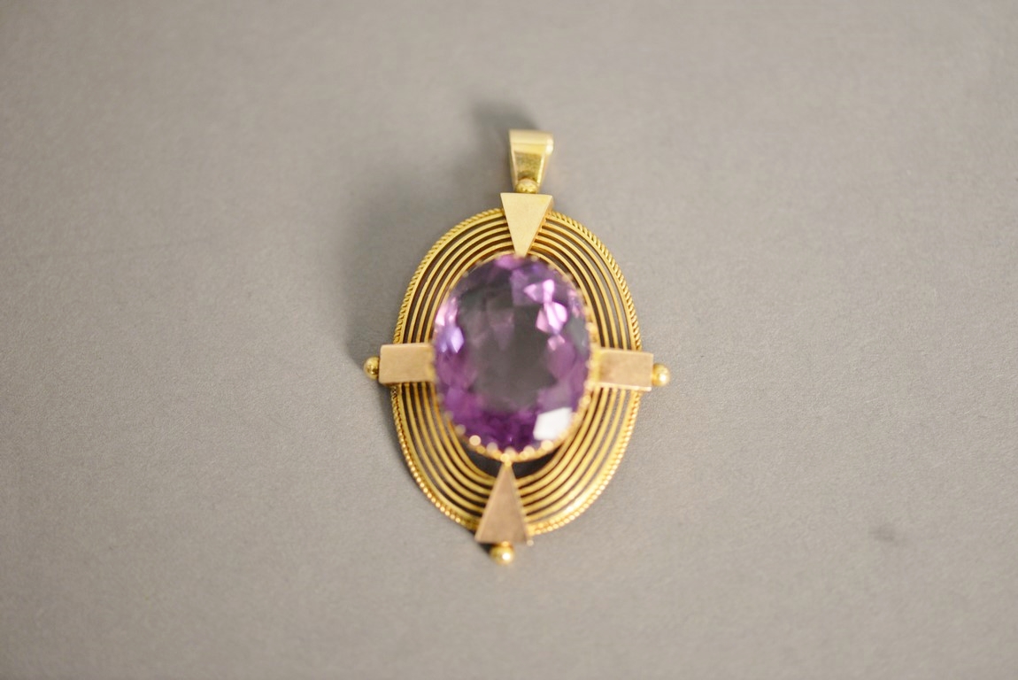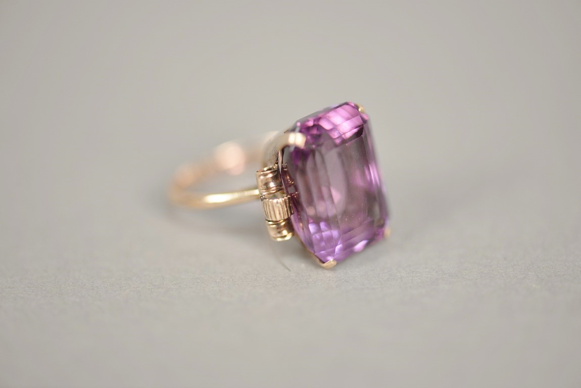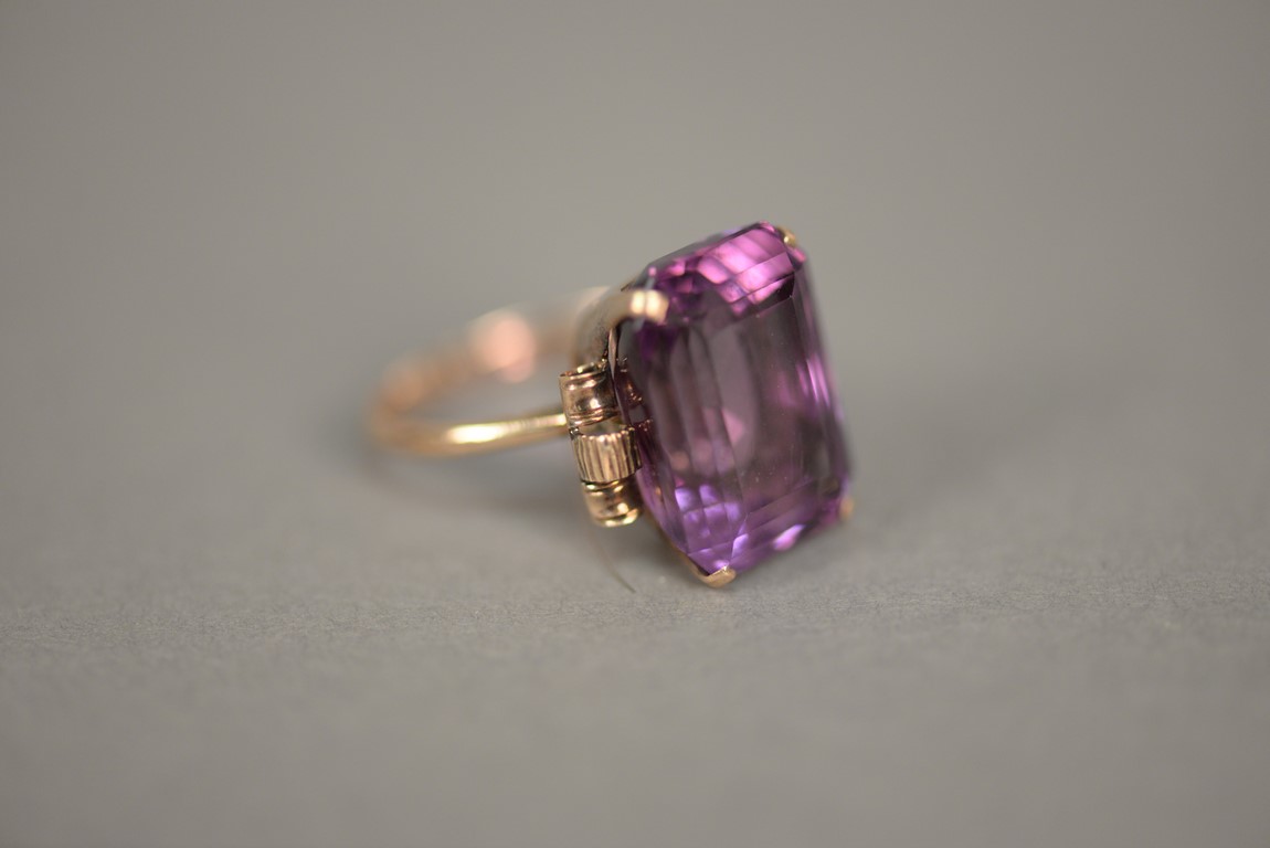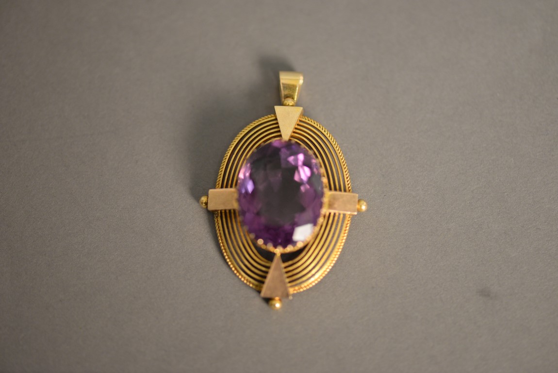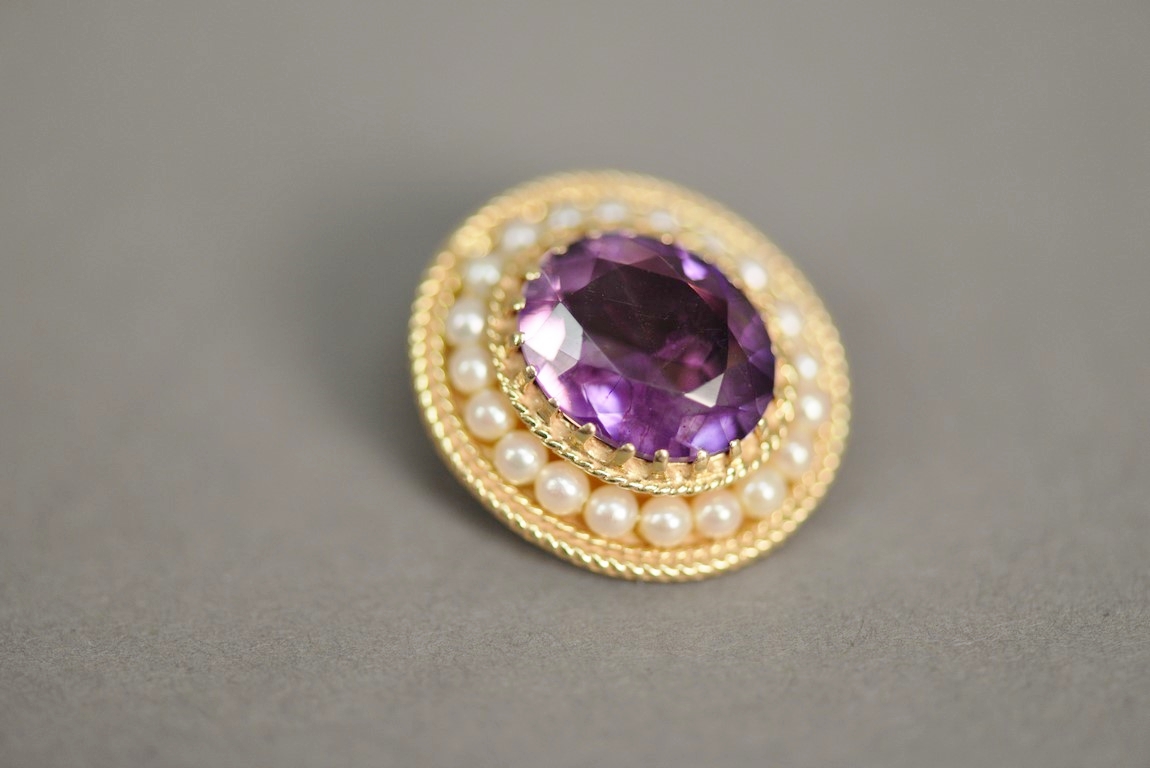 Lot 38: Five piece lot to include 14K gold amethyst and pearl bracelet with matching earrings along with gold and amethyst pendant and a ring.