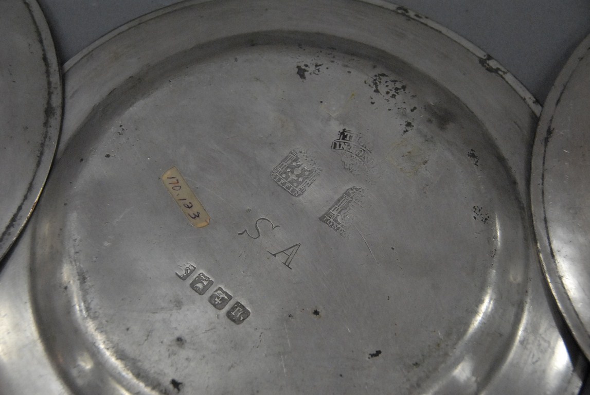 Four piece set of pewter three plates and one charger marked London, all initialed S.A. dia. 9in and 13 1/2in. Being sold to benefit a Connecticut Museum.