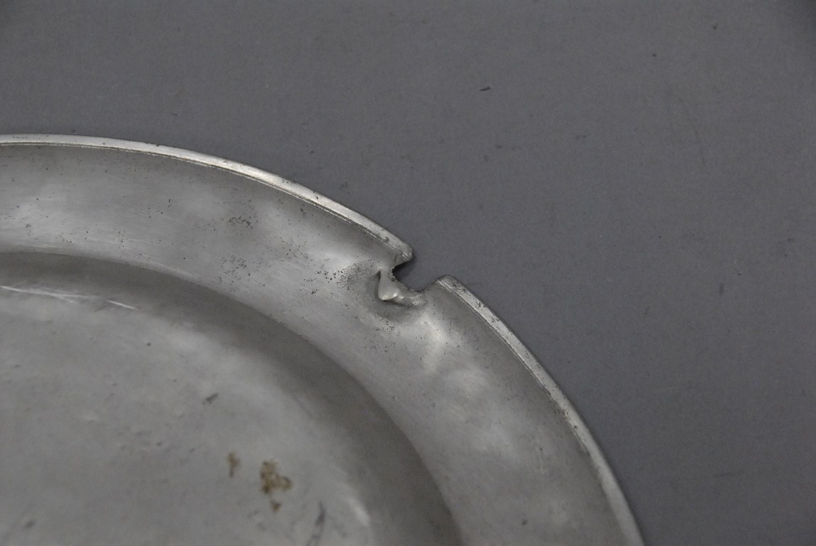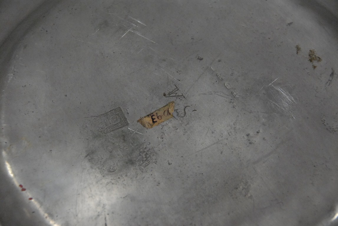 Lot 38: Four piece set of pewter three plates and one charger marked London, all initialed S.A. dia. 9in and 13 1/2in. Being sold to benefi…