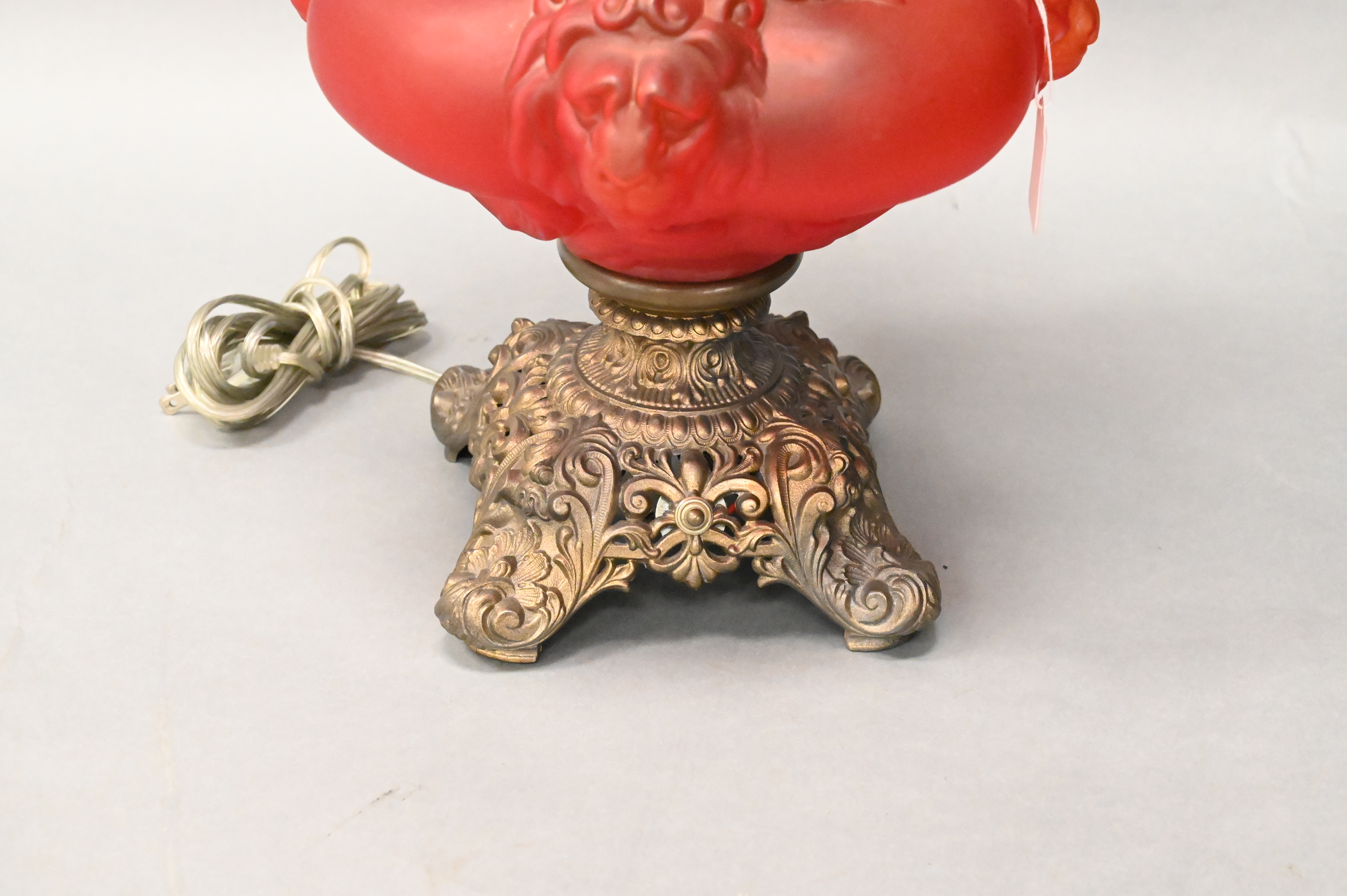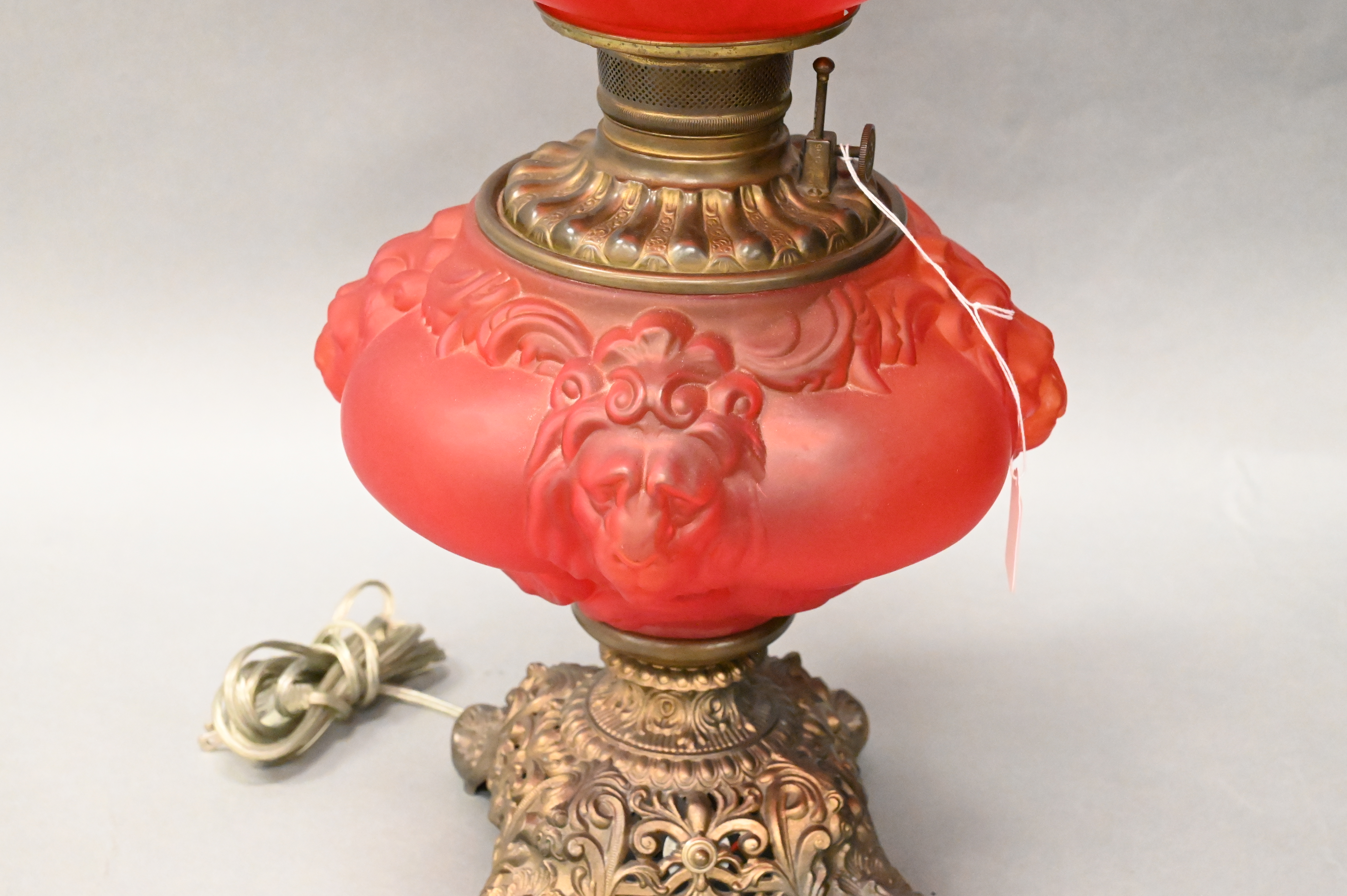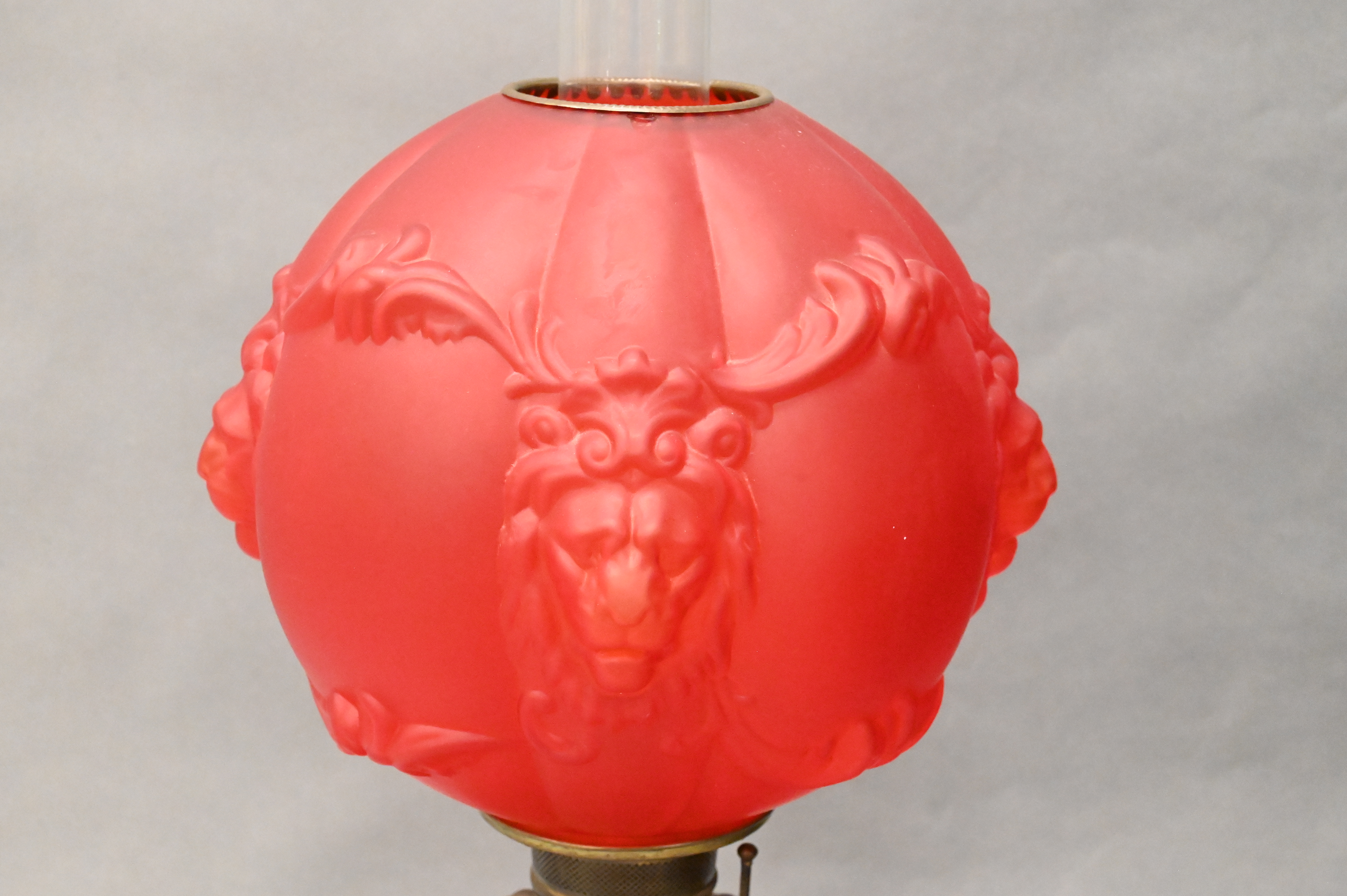 ball form shade and oil well havion lion head and scroll motif, set on brass burner and Rococo style base, now electrified